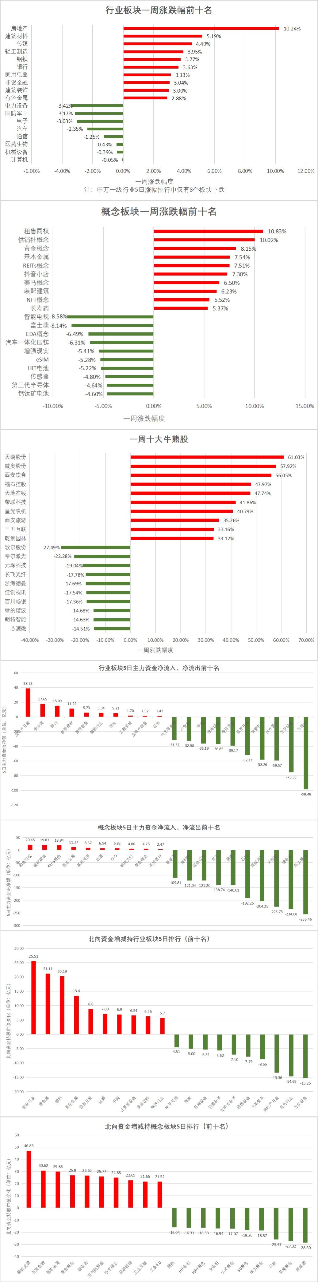 本周A股三大指数涨跌不一,上证指数上涨0.54%,深证成指下跌0.43%,创业板指下跌1.87%。板块方面,Web3.0概念、供销社、房地产等板块体现强势,电力、军工、汽车等板块跌幅居前。 从资金流向上来看,主力资金重要流入房地产开发、贵金属、银行等板块,半导体、光伏装备、锂电池等板块则遭大幅流出。北向资金方面,家电、贵金属、互联金融等板块受青睐,而新能源、房地产开发等板块则遭抛售。 猜测后市,大盘走势会怎样?哪些板块值得掘金?一文盘货机构观点! 重点数据一览 热门复盘 【Web3.0概念】 政策利好推动、科技巨头结构,近期,Web3.0概念颇受市场关注,干系个股掀起涨停潮。从周涨幅来看,福石控股和天地在线股价双双上涨近48%,分列第一、二位。 安信证券以为,web 3.0可以当作元宇宙的一个分支,雷同于客岁的NFT跟捏造人,市场起首偏好元宇宙的硬件,如硬件产业链有业绩体现的各标的﹔其次是传媒板块内弹性更大的各应用及内容,恰逢硬件板块有风险袒露,故web 3.0成了突破口。 对于投资战略,东方证券指出,现阶段Web3.0处于发展初期,底层根本办法的搭建尤为告急,发起关注提供区块链技能服务的运营商、分布式存储服务供应商。中信证券指出,在技能及举世羁系环境仍不成熟的配景下,Web3.0依然面临较多的不确定性及风险,发起更多关注Web3.0技能创新带来的产业机会,以及干系互联网公司的结构及发展。 【信创】 自10月以来,信创概念成为沪深两市的最热主线。本周,信创板块团体走势有所回落,不外,在本周初,受我国大力大肆推进信息根本办法创建和互联网遍及应用消息影响,信创概念股继续火了一把。 国泰君安指出,从党政、金融到行业信创,2023年信创业绩有望显着反弹,预计2027年我国信创PC和信创服务器年出货量分别超万万和两百万台以上,信创产业年市场空间将高出2千亿元。关注核心根本软件以及办公体系、谋划管理体系投资时机,保举金山办公/海量数据/东方通/太极股份/格尔软件。 中信建投体现,9月以来,机构连续提示盘算机板块及干系子赛道投资时机,明确夸大信创行业厘革将是后续盘算机板块的告急主线之一,在连续保举信创板块的同时,发起徐徐关注有望边际向好的医疗IT、网络安全、金融IT以及工业互联网等子板块。行业信创有望提速,保举关注两大方向:1)服务器及干系配套;2)产物贸易化竞争力较强的公司。 【供销社】 供销社概念本周继续火热,周涨幅到达10.02%,板块内多股股价飞涨,天鹅股份更是走出十连板,成了“大妖股”。不外,在股价狂飙的同时,天鹅股份等部分上市公司也忙着提示风险:请投资者防范概念炒作。同时,天鹅股份也因股价颠簸较大,11月14日开市起停牌核查。 国金证券指出,供销社发展对干系产业公司影响偏中长期:1)种子农资农机预计体系内企业受益最大,统购统销后体量增大;2)三方物流公司预计同样利好,以省为单元,在天下供销体系加速推广的“互联网+第四方物流”供销集配体系创建模式也将提升三方物流的服务服从与规模;3)对电商板块,传统电商短期影响不大,供销体系电商以农产物电商为主,产物选择、发展方向、体量差别较大,将来随着墟落根本办法的提升及墟落生齿收入提升,中长期看利好各类零售;4)农副产物供应链企业,食品加工、餐饮供应链、预制菜有望得到发展;5)再生能源采取利用板块,农资农机统购统销后的再生资源采取利用、锂电池采取等有望增长新的业务量。 中邮证券指出,以供销社为主渠道的天下性商品流畅网络,是国民经济的告急根本办法,供销社体系对农副产物市场的稳固性发挥侧告急作用。农业产业尤其是种子等农资板块将显着受益于供销社体系的进一步完满。发起关注敦煌种业、大北农、荃银高科及隆平高科等龙头种子企业。 【房地产】 房地产板块本周涨幅高居申万一级行业板块之首,到达10.24%,板块在周五大幅上涨。联储证券首席投顾李龙拴以为,现在利好政策不绝开释,房地产是资金重要流入的板块之一,对于房地产将来预期的改变,是它上涨的重要缘故起因。 光大证券指出,政策利好频发,促需求进入实质性阶段,预期后续随着疫情好转,灰心感情徐徐修复,房地产行业供需回暖可期。近期市场对房地产板块关注度提升显着,优质龙头房企体现精彩,发起关注万科A/万科企业、中国金茂、新城控股、保利发展、金地团体、招商蛇口、中国外洋发展、中国外洋宏洋团体、华润置地、龙湖团体、越秀地产、上海临港。 信达证券指出,当前已无需对板块过分灰心,在行业连续出清的过程中,短期内存在市场对于房企活动性再定价导致的优质房企被“错杀”的环境。发起继续重点关注光荣环境更精良,资金链更安全,货值更充裕,战略结构更会集在一二线核心都会的国央房企以及优质民企和肴杂全部制企业,如华发股份、滨江团体、招商蛇口、保利地产、金地团体、南山控股等。 【有色金属】 本周有色金属板块有所走强,金贵银业、浩通科技、资金矿业等股涨幅居前。 民生证券指出,重点保举铜铝、钴锂和贵金属板块。工业金属方面,美国加息或将放缓,防疫新政出炉,金属低库存下,需求迎来边际改善,金属代价迎来“双击”,发起关注:紫金矿业、铜陵有色、中国有色矿业、洛阳钼业、神火股份、索通发展、南山铝业、天山铝业、云铝股份、西部矿业。能源金属方面,锂镍供