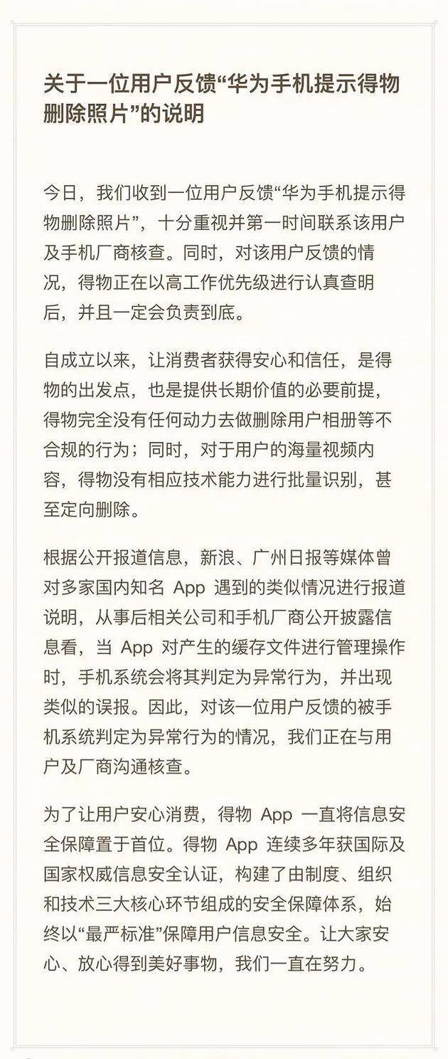 Tech星球11月13日消息,日前有网友曝光一段视频,称得物调用自己的手机权限,删除了其录下的关于收到货品有题目的视频证据。视频中称:双11在得物买了东西,发现有题目。就向平台反映,并上传了视频,之后体系提示得物删除了视频。 对此,得物App官方账号复兴称:得物没有删除用户相册的权限和本事。得物只会对自己App文件举行管理,而被体系判定为非常活动的情况我们正与厂商举行确认,从以往厂商及其他App披露的情况看,确实存在雷同误报情况,得物不会利用用户相册数据。 以下为得物回应: 本日,收到用户反馈“华为手机提示得物删除照片”,公司已第一时间接洽该用户及手机厂商核查。得物体现,公司完全没有任何动力去做删除用户相册等不合规的活动;同时,对于用户的海量视频内容,得物没有相应技能本事举行批量辨认,乃至定向删除。 得物称,有媒体曾对多家国内着名App碰到的雷怜悯况举行报道分析,从过后相干公司和手机厂商公开披露信息看,当App对产生的缓存文件举行管理利用时,手机体系会将其判定为非常活动,并出现雷同的误报。对该名用户反馈的被手机体系判定为非常活动的情况,公司正在与用户及厂商沟通核查。 |