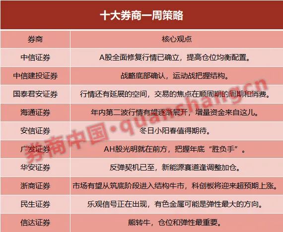 中信证券:A股全面修复行情已创建,进步仓位均衡设置 防疫政策调解方向,外部运动性预期拐点,地缘扰动改善三大因素都已明确,分别改善根本面、估值和风险偏好,A股全面修复行情已创建,市场易涨难跌,当前仍处于政策驱动的上半场,交易业务重心料将从政策预期博弈切换至政策结果博弈,发起进步仓位均衡设置,发起重点关注政策受益更显着的精准防控、地产产业链、环球运动性拐点三条主线。 已明确的三大因素详细如下:其一,防疫政策调解有利经济的趋势已明确,“新二十条”落地标记取防疫政策科学精准的原则和渐渐放松的趋势,新规下风险地域和管控职员数量或将减半,对经济的影响显着低沉,并进步了稳增长政策的传导性,改善根本面预期。其二,外部运动性预期的拐点已显现,美国通胀拐点较明确,美元加息节奏放缓,美股阶段性反弹,美元指数拐点已显现,人民币汇率的贬值趋势根本竣事,打开A股估值修复空间。其三,美国中期推举落地,俄乌辩说局面出现和缓迹象,G20峰会期间中美、中法等双边领导人碰面已确定,地缘扰动边际改善也已明确。 中信建投证券:战略底部确认,运动战把握布局 战略底部确认,利好逻辑连续兑现。后续战术上仍需运动战把握布局。多项经济数据指示当前仍处于被动去库期,经济根本面仍然疲弱,短期仍需关注疫情反复与根本面数据颠簸风险。经济预期未清朗+剩余运动性充裕环境下,三季报已往,市场对于政策信号的解读及感情有所放大,市场在轮动中探求主线而且快速演绎,操纵计谋上须要用运动战对待。 短期关注地产链估值修复,中期依然重点关注发展线索,在新能源、医药和科创中优选:高景气优选23年仍具备高业绩增速预期的风/光/储,关注根本面有望率先出现改善的医疗东西/零售药店/创新药和部门龙头中药,器重安全主题下的半导体装备/质料、信创、军工。 国泰君安证券:行情另有延展的空间,交易业务的焦点在顺周期的周期和斲丧 预期正在发生迁移变化,政策态度与方向变革更为告急。而投资者的持仓并没有为此做好准备,行情另有延展的空间,交易业务的焦点在顺周期的周期和斲丧。中期主线在制造。 代价底部反弹,逢低布局发展。内需预期修复以及代价底部反弹的机遇在与经济预期修复相干的周期(有色、煤炭、央国企地产、建材等竣工链)与斲丧(食品饮料、旅店、航空)。逢低布局发展,从中期看内需扩张机遇在于医药、制造业更换升级(军工、盘算机、通讯、机器装备)与新质料(钢铁、有色、化工)。 海通证券:年内第二波行情有望徐徐睁开,增量资金来自这儿 汗青数据表现A股资金面与行情涨跌正相干,例现在年4月尾至7月初上涨行情中增量资金泉源于外资、融资余额增长。随着国表里因素边际改善,市场有望开启年内第二波行情,增量资金大概泉源于公募新发、外资回流、融资余额增长。行情主线有望聚焦数字经济、新能源链等高景气发展范畴。 安信证券:冬日小阳春值得等待 此前反复夸大的看多逻辑,“1、成交量放大;2、人民币汇率企稳;3、重振内需政策迹象进一步明确“已经渐渐验证,短期有利于大盘代价的估值修复,以更乐观的态度对待“战术性反弹”;国内疫情如果能有效控制,不再大幅伸张,市场环境就是相对安全的,冬日里的小阳春值得等待。 超配行业:地产(链);铜金;以数控机床、医疗东西与耗材、刀具、大功率轴承为代表的国产更换;以储能为代表的绿电产业链;光伏;汽车(汽车零部件);以盘算机(信创)为代表的数字经济;油运;农化。 广发证券:AH股光明就在火线,把握年底“胜负手” “国内政策底”再次确认触发,港股对“根本面修复”更敏感。(1)11.8民企融资“第二支箭”和11.10疫情防控政策优化,都将改善AH股市场的名誉和红利预期;(2)10月社融和出口数据表现了“稳增长”政策继承加码的须要,汗青上就业压力大+出口下行+斲丧慢修复的阶段均陪同地产放松,疫情防控优化同样顺理成章;(3)08年以来的履历表现,港股对“稳增长”政策加码和根本面改善预期更敏感,更受益于“国内稳增长预期重新同一”。 “外洋政策底”也出现积极信号,港股对“美债利率筑顶”更敏感。(1)10月美国CPI一连4个月回落,焦点CPI也开始下行,12月加息50BP的概率上升至80.6%,美债利率上行压力缓解,我们预计本年底来岁初将形成美债利率下行拐点;(2)10月中国CPI和PPI同时回落,也将打开国内信贷和金融政策宽松空间;(3)汗青上,港股对美债利率更敏感,将更受益于“美债利率上行压力缓解”。 华安证券:反弹契机已至,新能源赛道逢调解加仓 随着疫情防控优化二十条、地产融资政策调解以及美国CPI回落,前期市场对疫情扰动国内经济增长与美联储连续快节奏加息担心均显着缓释,显着提振市场风险偏好,内、外部感情共同向好下,市场将有望迎来惆怅的反弹窗口期。我们以为,近期国表里开释的积极信号,在12月初的中央经济工作会媾和美国公布11月赋闲率、CPI之前,资源市场有望维持向好态势。 设置上,发起把握当前更受市场利好因素提振的板块举行设置:一是受益于美联储加息风险缓释,中长期行业业绩仍具备上风的新能源赛道,包罗光伏风电、储能等。二是直担当益于调控政策进一步放松的地产板块。三是受益于防疫政策优化提振增长预期,对应的斲丧复苏板块,包罗医疗装备、白酒等。四是市场感情提振下的券商
