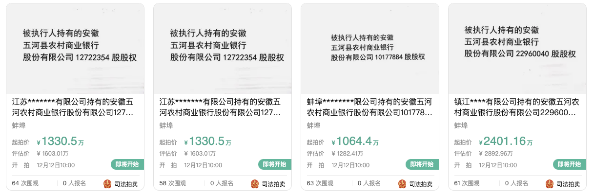 阿里司法拍卖平台信息表现,被实行人持有的安徽五河农商行4笔股权将于12月12日分别公开拍卖,合计涉及该行约5858.26万股股份,占该行总股本的11.69%,起拍价总计约6126.57万元。 |