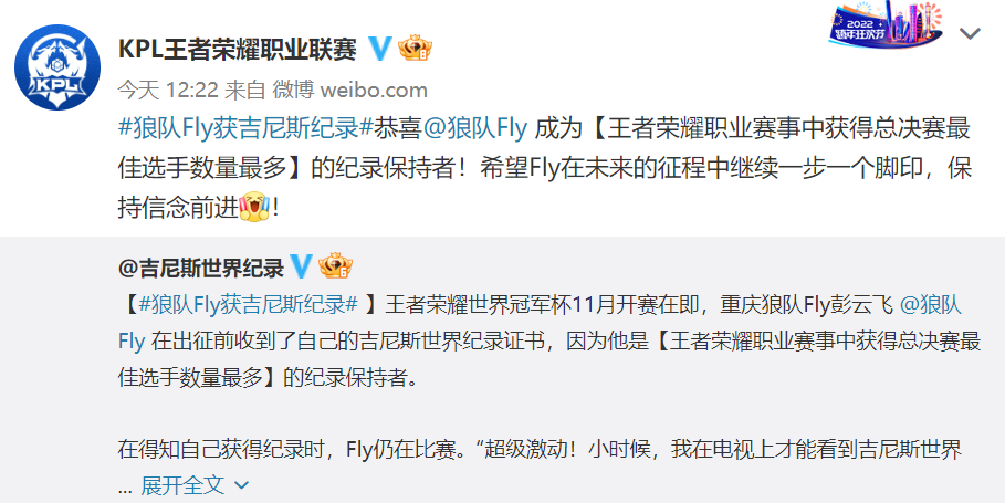 随着2022王者光彩天下冠军杯的脚步越来越近,在克日电竞圈也是迎来了一个堪称重磅的消息:重庆狼队王者光彩分部的人气选手Fly得到吉尼斯天下记录认证。对于关注电竞圈以及王者光彩的玩家和观众来说,Fly这个ID可以说是如雷贯耳,作为王者光彩现役电竞选手当中资历最老、荣誉最多的选手之一,Fly开启职业门路的履历以及永不言弃的电竞精神更是鼓励了很多视他为模范的粉丝与之后同样怀揣着电竞梦的职业选手。 在2022王者光彩KPL夏季赛总决赛落幕后,Fly已经从出道时的天才少年变为现在队友可以信托的宿将,而多年对峙的Fly也终于劳绩了他职业生存的又一座顶级联赛冠军奖杯,为本身加冕王者光彩七冠王。从打职业前的后厨小弟,到现在王者光彩职业赛场上气吞山河的传奇选手,Fly的人生履历与职业生存的曲折水平,真的如很多观众挖苦的那样,“小说都不敢这么写。” 劳绩本身职业生存第七座重量级的冠军奖杯,于9月25日王者光彩寻衅者杯四分之一决赛当天,隔断本身生日已颠末去两天的Fly拿到了本身迟来的25岁生日礼品,而这份礼品也就是吉尼斯天下记录的认证证书。随着这份证书送到Fly手上,也意味着他成为了王者光彩电角逐事汗青上首位吉尼斯天下记录保持者。 吉尼斯天下记录官方微博于11月14日发文,公布了重庆狼队Fly彭云飞选手得到吉尼斯天下记录证书的消息,而Fly得到的天下记录是王者光彩职业赛事夺得总决赛MVP荣誉最多的选手。现在Fly成为“王者光彩职业赛事中得到总决赛最佳选手数目最多”的吉尼斯天下记录保持者,对于KPL以及整个王者光彩圈子的职业选手来说,想冲破这个记录可以说好坏常困难。 根据吉尼斯天下记录官方的核实加上角逐主理方腾讯游戏简直认,重庆狼队的对抗路选手Fly职业生存一共得到过六次总决赛最佳选手的荣誉,因此得以革新吉尼斯一项全新的天下记录。 从2016年参加Mu俱乐部开启本身电竞选手的职业生存,到现在耗费6年时间Fly已经拿到了七座极具含金量的总冠军奖杯,6次总决赛MVP的荣誉也足以证实他在王者光彩这个范畴第一人的职位。现在得到吉尼斯天下记录的认证,Fly也是发博感谢本身的家人、锻练、队友,以及很多一起上支持他的人。也期待未来Fly可以或许在重庆狼队取得更多的荣誉和结果,创造更多王者光彩职业赛事的记录。 网友们怎么看这件事呢?可以在下方批评区留言,分享本身的见解。 举报/反馈 |