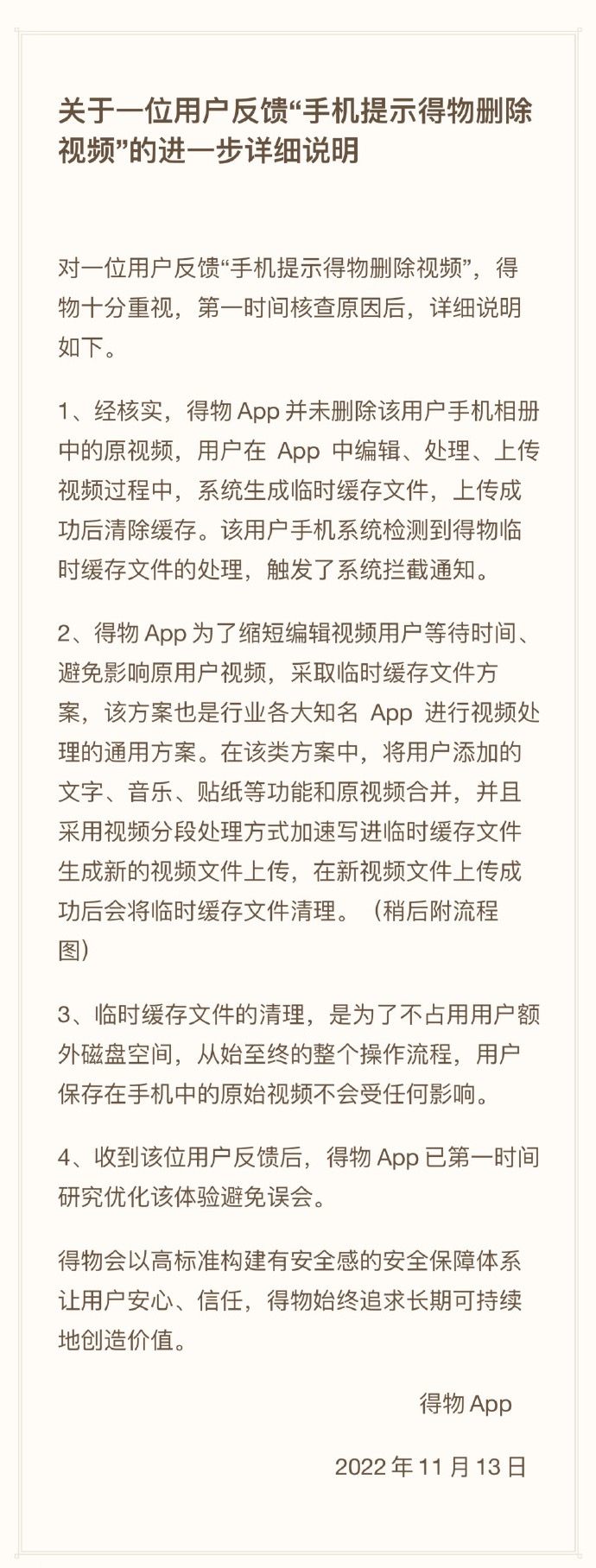 蓝鲸TMT频道11月14日讯,针对得物APP被指擅自删除用户视频一事,得物再发布一则详细阐明回应称,得物App并未删除用户手机相册中的原视频,而是暂时缓存文件。 得物方面体现,用户在App中编辑、处置惩罚、上传视频过程中,体系天生暂时缓存文件,上传乐成后打扫缓存。同时其夸大,得物App为了紧缩用户编辑视频期待时间、克制影响原用户视频,接纳的是暂时缓存文件方案,这是行业通用方案。得物已第一时间研究优化该体验克制误会。 此前,得物在第一次回应中体现,其没有任何动力去做删除用户相册等不合规的举动,对于用户的海量视频内容,得物没有相应技能本领举行批量辨认,乃至定向删除。 |