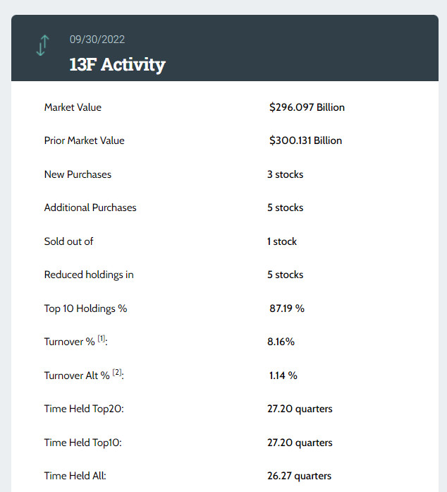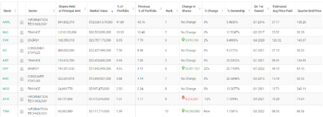 11月14日周一公布的13F陈诉体现,伯克希尔三季度建仓做多中国台积电,增持西方石油和雪佛龙,减持通用汽车等。伯克希尔三季度依然重仓苹果、美银、雪佛龙、适口可乐、美国运通。 停止9月30日,伯克希尔持有苹果代价1265亿美元的股票,美国银行312亿美元的股票,雪佛龙、适口可乐和美国运通的持股分别为244亿美元、224亿美元和205亿美元。前五大重仓股代价占伯克希尔股票持仓公允代价的约莫73%。此中,苹果的仓位就占了41.89%。紧随这五家公司之后的是西方石油、卡夫亨氏、穆迪、动视暴雪和新建仓的台积电。前十大重仓股占伯克希尔股票持仓公允代价的约莫87%。 在前十大持仓股中,伯克希尔仅增持了雪佛龙和西方石油两家能源公司,唯一减仓的重仓股是动视暴雪。 三季度,伯克希尔共建仓三只股票,分别是台积电6006万股,美国建材商路易斯安那平静洋公司5796万股和金融公司Jefferies 43.4万股。 三季度,伯克希尔增持化工公司塞拉尼斯 (Celanese),从916万股增长至971万股;增持雪佛兰从1.614亿股至1.654亿股;增持广播运营商Liberty SiriusXM Group从2020.8万股至4320.8万股;增持西方石油从1.585亿股至1.944亿股;增持媒体团体派拉蒙举世从7842.2万股至9121.7万股;增持高级家居公司RH从217万股至236万股。 三季度,伯克希尔只清仓了一只股票,即地产投资信托Store Capital。 三季度,伯克希尔减持动视暴雪从6840万股至6014万股;减持纽约梅隆银行从7235.7万股至6221.1万股;减持通用汽车从5287.7万股至5000万股;减持零售企业Kroger从5243.7万股至5026.9万股;减持美国合众银行从1.198亿股至7778.8万股。 三季度,伯克希尔花了90亿美元买股票。本年前九个月,伯克希尔在股市上耗费了近660亿美元,这一付出是客岁整年在股票市场上付出的13倍。 三季度,伯克希尔对亚马逊、美国运通、苹果、美国银行、花旗团体、适口可乐、卡夫亨氏、强生、万事达、穆迪、维萨等公司的持仓没有厘革。 停止三季度末,伯克希尔股票持仓市值为2960.97亿美元,和二季度末的3001.31亿美元相比,出现小幅降落,这也是伯克希尔股票持仓的连续第二个季度降落。伯克希尔持有前二十大重仓股的均匀时长到达27.2个季度。 |