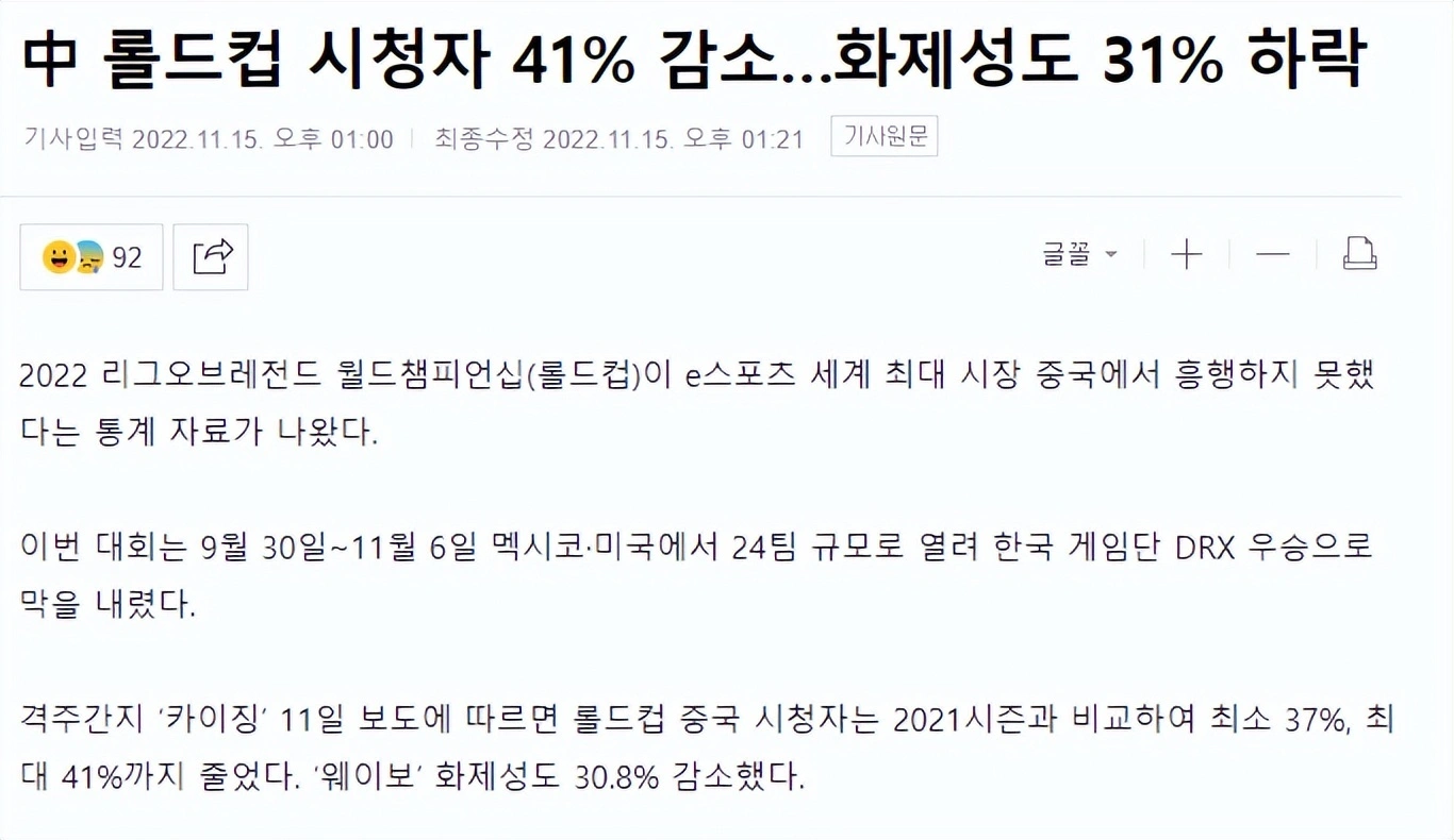 前段时间外媒报道了S12天下赛在外洋的收视环境,此中从入围赛到镌汰赛总体都是降落的,但是决赛来了一波大反弹,DRX和T1的决赛突破了历届S赛决赛的收视记载,成为现在收视率最高的天下赛决赛。而由于这些数据没有统计LPL观众的人数,以是跟我们没有太大的关系。不外近来国内关于本年S12天下赛的收视率出炉了,没想到也是大幅降落。 韩媒近来报道:在中国看S赛的观众镌汰了41%,话题度镌汰了31%。而且韩媒是引用的国内媒体《财经》的消息,体现对比客岁,同场观众最少镌汰了37%,最多镌汰了41%,从微博话题数据来看,本年的阅读量只有69.4亿,客岁S11天下赛的阅读量是100.3亿。 着实造成这个数据的缘故原由有很多,起首最紧张的就是LPL战队止步4强提前镌汰了,天下赛在LPL掀起最高的热度,应该是从S8开始,那一年IG拿到了LPL汗青上第一个天下冠军的奖杯,可以说引发了天下电竞观众的热情,LOL游戏开始列队了,大学校园里随处充斥着为IG加油的声音,之后每年天下赛国内观众都抱着很大的期待在看,S8-S11这4届中,只有S10天下赛LPL没有夺冠,但是也打进了决赛,以是这四届都是直到决赛,LPL观众都很多。但是本年随着JDG四强镌汰,反面的比赛和LPL赛区无关了,自然观看的人就少了。 另一个缘故原由就是比赛时间对于LPL观众并不友好,除了决赛是早上8-9点开始,其他的比赛险些都是破晓3-5点开打,对于大部门须要上班大概上学的观众来说,没法及时看直播。这也是为什么本年天下赛举世收视下滑的紧张缘故原由,亚洲观众都没有充实的时间来看比赛。 尚有一个缘故原由是外部因素,往年天下赛在天下各大中小都会都会安排线下团体观赛,但是本年由于客观因素,很多地方无法构造线下观赛,比赛氛围没有那么重。 固然最关键的还是LPL这边没结果,太早镌汰,以是说电子竞技结果语言这句话一点没错,不光仅是体现在选手的风评上,也体现在了收视率上,渴望来岁LPL战队加油吧! 那么,对于这件事变,你们有什么想说的吗? |