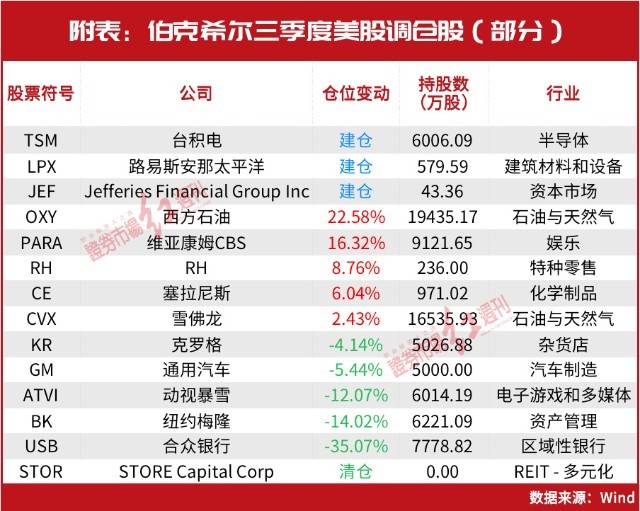 红周刊 本刊编辑部 | 齐永超 当地时间11月14日,巴菲特旗下的伯克希尔向SEC(美国证券交易业务委员会)提交了三季度的13F文件,从这份表现三季度最新持仓的文件可以看出,巴菲特的调仓是比力生动的。团体上,在一向维持将斲丧作为最大设置范畴的同时,对其他行业也在增大设置,如石油能源、芯片。 在这背后,得到巴菲特加仓的石油能源、芯片股等公司,股价均有异动……那么,巴老详细是怎么调仓的?最新看好的公司又有谁呢? 三季度积极调仓 服从第一重仓股苹果 似乎一连了此前积极调仓的“风格”,巴菲特在本年三季度的调仓仍比力生动。 根据本年第三季度持仓陈诉(13F)表现,伯克希尔的持仓组合中有3只个股为新面貌,如台积电、Louisiana-Pacific和杰富瑞,与此同时,对5只个股举行了增仓,如西方石油、维亚康姆CBS(娱乐)等。 与之相对的,伯克希尔也减持了包罗通用汽车、动视暴雪(电子游戏和多媒体)等在内的5只个股,对房地产投资信托公司STORE Capital Corp则给予了清仓,值得一提的是,这是伯克希尔三季度惟一清仓的标的(见附表)。 在频仍调仓背后,巴菲特不停在巨资投入。据悉,三季度,伯克希尔共泯灭了90亿美元买入股票。而在本年前九个月,伯克希尔在股市上的投入金额则到达近660亿美元,而这一数据是客岁整年其在股票市场上投入的13倍。 不外,伯克希尔团体的持仓市值则出现了肯定的缩水。停止第三季度末,伯克希尔持仓总市值达2960.97亿美元(按当前汇率换算约为2万亿元人民币),相较于上一季度的3001.31亿美元小幅下滑,而相较于本年一季度的汗青最高值3635.53亿美元,则降落了约674亿美元。 固然调仓频仍、市值颠簸,但巴菲特的“最爱”却未发生厘革。在三季度的持仓股中,苹果仍旧是其第一重仓股,持仓股数8.95亿股,持仓市值约1237亿美元,占全部投资组合比重的41.76%。从持股数量来看,与二季度相比,伯克希尔对于苹果的持仓股数未发生厘革。且值得一提的是,这已经是巴菲特一连多个季度对苹果“无变更式”持有。 三季度期间,苹果股价冲高回落,团体根本原地踏步,与二季度末的持仓市值相比,险些未发生厘革。而若从恒久来看,巴菲特则还是投资苹果的“大赢家”。 回顾汗青持仓,巴菲特自2016年以来即开始大笔加仓苹果,而也正是在此之后,苹果股价一连上涨,至今涨幅已经高出5倍(见图1),为伯克希尔创造了丰厚的账面利润。 巴菲特偏幸苹果,起首是看好其斲丧属性的发展逻辑,别的,对于苹果这家公司而言,股息、回购因素也正是巴菲特对其偏幸的来由。巴菲特曾表现,其对苹果“感爱好”,由于苹果回购在一连增长。“我们盼望可以大概拥有更多的苹果公司股权,我们对苹果布满爱好。” 对能源石油龙头继承大买 仓位占比进一步上升 相较于此前不停重仓金融、斲丧,我们通过持仓来看,巴菲特的投资风格也在迩来徐徐发生变化。能源石油范畴就是巴菲特近期重点增仓的“新”范畴之一。 据三季度的持仓表现,伯克希尔持有石油范畴头部公司——雪佛龙、西方石油的股数进一步增多,在总仓位中的占比进一步增大。详细来看,伯克希尔三季度增仓雪佛龙392万股至16535万股;增仓西方石油3580万股至19435万股。 停止三季度末,对两者的持仓市值分别为238亿美元、119亿美元,分别位列伯克希尔第三与第六大重仓股。而持有两者的总市值也合计占到了总仓位的12%。 巴菲特对于能源石油的“偏幸”还不止于此。对于雪佛龙、西方石油这两只个股,巴菲特此前曾均给予了一连的“买买买”。 早在2020年三季度,巴菲特即建仓了雪佛龙,除2021年一季度减仓之外,别的季度均给予了增仓。“对待”西方石油也是云云,巴菲特在2019年三季度建仓西方石油,后于2020年二季度清仓,不外,2022年一季度又对其重新建仓,且一脱手就爆买1.36亿股,至今,仍在不停加仓(见图2、3)。值得一提的是,随着一连增仓,伯克希尔对西方石油的持仓比例在本年8月高出了20%,而伯克希尔也在第三季度初次将该公司的业绩纳入了财报。 “精准”的是,在巴菲特持仓期间,雪佛龙、西方石油的股价团体均迎来一连上涨。如雪佛龙,自巴菲特2020年三季度建仓以来,股价已上涨1.8倍(见图4),巴菲特2022年一季度重新建仓西方石油以来,公司股价上涨了1.5倍。且两者的股价近期均维持在汗青高位程度。 巴菲特此前曾表现,之以是加码石油,与市场的供求失衡状态有关。“我们现在的联邦政府储存了近10亿桶石油。对我们的经济来讲,我想大概10亿桶也用不了多久。”“这个国家有这么多的存油量固然是功德,但是过细想想着实也是不敷多的,以是你也不知道这3、5年中会发生什么样的题目,大概存量会变得非常低。” 正是在巴老的这一逻辑下,石油代价迎来飙升,相干头部公司业绩迎来水涨船高。如据西方石油披露的三季报表现,公司2022年前三财季红利113.77亿美元,同比增长了1349.3%;据雪佛龙发布的2022年财务陈诉表现,公司第三季度实现归属公司净利润112亿美元,同比增长了84%。 风格再向科技股倾斜 大手笔建仓台积电 之前,由于“看不懂科技”,巴菲特不停并未对科技范畴的相干公司给予重仓设置,即便是对于自己作为科技公司的苹果,巴老也是以斲丧股的逻辑来对待的。 不外,从最新的三季度持仓来看,巴菲特却大笔增仓了一家纯粹的芯片科技公司,并一举将其纳为第十大重仓股,这只个股就是台积电。 三季