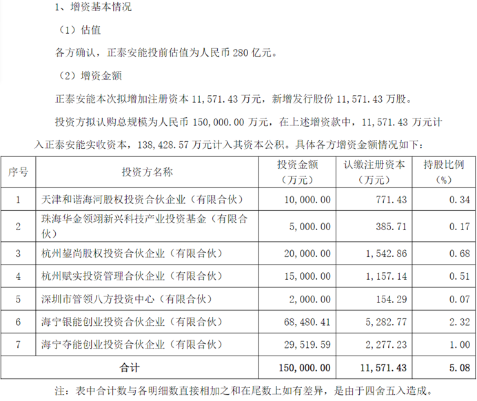 正泰电器于11月15日发布公告,公司控股子公司正泰安能拟引入投资者增资15亿元,此中约1.16亿元计入正泰安能实收资源,约13.84亿元计入正泰安能资源公积。 本次投资方终极确定为7家,合计持股比例高出5%。此中,有两家持股比例不低于1%,海宁银能是增资最多的一家,投资金额约6.85亿元,持股比例到达2.32%。海宁夺能紧随厥后,投资金额约2.95亿元,持股比例到达1%。 正泰电器是一家主营低压电器产物的公司,旗下正泰安能紧张从事户用光伏能源运营与服务业务。 公告披露,正泰安能投前估值280亿元,本次增资扩股完成后,正泰安能的注册资源将由21.6亿元增长至约22.76亿元,正泰电器对正泰安能的持股比例将由70.60%变动为67.01%。 数据表现,正泰安能2022年1-9月(未审计)的业务收入为70.92万元、净利润为12.34亿元。正泰电器前三季度实现营收约350.17亿元,同比增长21.73%;归母净利润约32.15亿元,同比增长15.69%。 免责声明:本文仅供信息分享,不构成对任何人的任何投资发起。 |