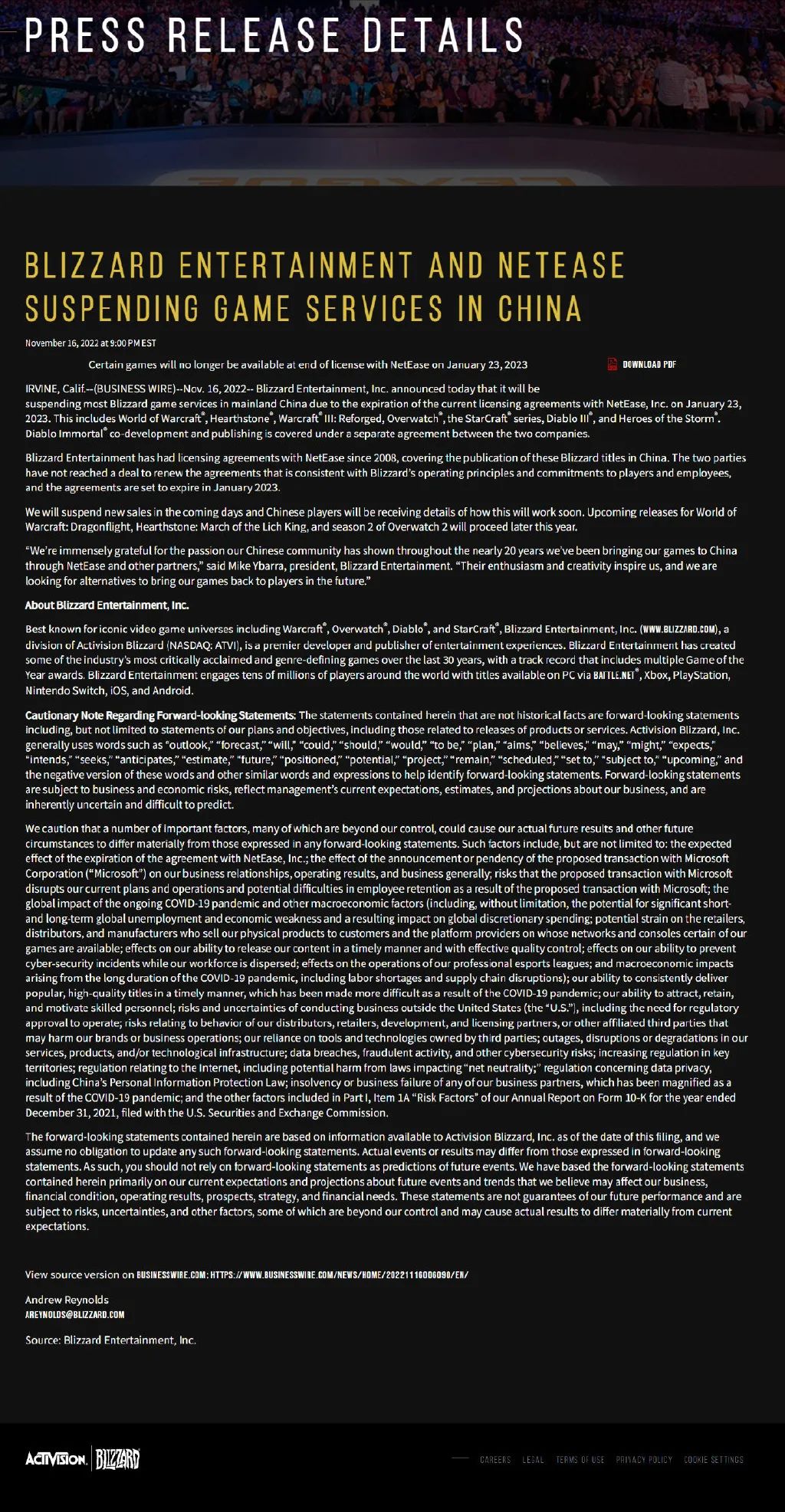 暴雪娱乐公司11月16日发布声明称,由于未能与网易公司续签授权协议,公司将在2023年1月停息在中国大陆的大多数暴雪游戏服务。 暴雪与网易此前签订的授权协议将于2023年1月23日到期。届时,暴雪将停息在中国大陆的大部分暴雪游戏服务,包罗《魔兽天下》、《炉石传说》、《魔兽争霸III:重制版》、《守望先锋》、《星际争霸》系列、《暗黑粉碎神III》和《风暴好汉》。《暗黑粉碎神:不朽》的连合开发和发行属于两家公司别的签订的一项协议所覆盖的游戏。 暴雪称,双方未能告竣协议,续签符合暴雪运营原则以及公司对玩家和员工的允许的协议。暴雪将在未来几天停息新的游戏贩卖,中国玩家将很快收到干系细节。即将发布的《魔兽天下:巨龙期间》、《炉石传说:巫妖王的进军》和《守望先锋2》第二季将在本年晚些时间推出。 “我们非常感谢中国社区在近20年来所体现出的热情,我们不停通过网易和其他相助搭档将我们的游戏带到中国。他们的热情和创造力鼓励着我们,我们正在探求其他选择,让我们的游戏在未来重新回到玩家眼前。”暴雪娱乐总裁迈克·伊巴拉(Mike Ybarra)表现。 据相识,动视暴雪在上周发布2022财年第三季度财报时提到,暴雪在中国国内的业务未来大概会出现的一些题目。彼时,暴雪称和网易的协议将于2023年1月到期,暴雪官方称正在讨论续签这些协议,但终极大概无法告竣令双方都满意的协议。 财报表现,动视暴雪第三季度实现净营收17.82亿美元,客岁同期为20.70亿美元;净预定收入为 18.3亿美元,同比降落3%;净利润为4.35亿美元,同比降落32%。暴雪指出,其与网易签订的允许协议约占动视暴雪2021年归并净收入的3%。 针对暴雪单方公布与网易制止相助这一变乱,网易方面表现:网易不停在尽最大积极和动视暴雪公司会商,盼望推进续约。颠末长时间的会商,我们仍然无法就一些相助的关键性条款与动视暴雪告竣划一。我们非常遗憾动视暴雪在本日先行公布了制止相助,我们将不得不继续此决定。网易将继续推行职责,为我们的玩家服务到末了一刻。 受此影响,网易股价本日下挫,现在下跌高出10% 暴雪娱乐和网易的相助始于2008年。2008年8月,暴雪与网易告竣署理协议,同意独家授权后者《星际争霸2》、《魔兽争霸3:冰封王座》、《魔兽争霸3:紊乱统治》及扩展包三款产物、以及暴雪游戏平台战网的利用权,授权期为3年。 2009年4月,暴雪再次授权网易运营旗下热门产物《魔兽天下》,并取得了相称出彩的效果。在这之后,双方又乐成续签协议,网易又乐成将《暗黑粉碎神3、《炉石传说》、《守望先锋》、《风暴好汉》、《魔兽争霸III:重制版》等经典游戏引入中国市场。至于暴雪和网易后续告竣的环球同步运营模式,也让暴雪游戏第一时间触到达国内市场,得到更多声量。 与此同时,随着自研游戏的发展,和借力暴雪系列作品的着名度和口碑、总结干系研发运营履历,网易渐渐逾越审慎,坐稳国内第二大游戏厂商。 然而近来两年,暴雪却深陷舆论漩涡,不但研发进度痴钝、跳票征象时有发生,赖以生存的玩家口碑也渐渐崩坏,《魔兽争霸3重制版》乃至只得到了0.5分的评分 (满分10分),这也导致游戏玩家严峻流失。 除此之外,暴雪也履历了一系列职员变动。不但CEOMike Morhaime、《守望先锋》游戏总监Jeff Kaplan等多名高层去职,公司自己也因陷入“员工性骚扰变乱”,开除了多名涉事员工。 2022年,暴雪好像在逆境中看到了一丝曙光,这就是《暗黑粉碎神:不朽》。这款与网易连合开发的手游,上线后累计营收已经突破3亿美元,然而统统随着网易和暴雪的这次一拍两散戛然而止。 就War3而言,网易对这款游戏的贡献有目共睹,这此中,网易官方对战平台和黄金联赛最值得称道。 网易官方对战平为War3玩家操持了一套拥有美满体系的天梯匹配体系,并在很大水平上办理了线上网络耽误的题目,稳固的服务器比起欧服的反复瓦解要好上许多。不但云云,网易平台还为广大RPG玩家提供了一个发挥才华、愉快游戏的平台,在这里,一张张精致舆图应运而生,让玩家度过了许多难忘韶光。 黄金联赛则在很大水平上资助War3对战重新抖擞生气,七年黄金联赛诞生了太多经典战争,许多War3选手由于黄金联赛选择重回赛场。 随着动视暴雪与网易的一拍两散,网易黄金联赛以及魔兽争霸官方对战平台也已经成为了汗青。虽说近几个月War3玩家已经渐渐风俗了在欧服举行游戏,黄金联赛停办也有10个月,但当我们真的听到这一消息时,还是让人不胜唏嘘。 那么题目来了,放弃与网易相助之后,暴雪会找谁署理?玩家第一个想到的就是腾讯,腾讯在游戏行业方面的业务已经不必要多言,更况且腾讯自己也署理了动视的任务召唤、糖果粉碎传奇等游戏,双方完全偶然机睁开进一步的相助。 不外,根据《国务院三部分关于进一步增强网络游戏管理的关照》第五条规定,过审的网络游戏变动运营单元时,须重新办理审批手续,在重新得到允许前,网络游戏应制止统统运营服务,违者,按非法网络出书处置处罚。 这也意味着网易和暴雪制止相助后,我们很大概会在一段时间内无法在国服玩到暴雪游戏。 以是,未来暴雪毕竟会找谁署理?新署理多久能搞定统统?新的国内署理公司可否像网易一样开发新的魔兽对战平台?War3玩家还可否像前几年一样得到官方的支持?那就得让时间告诉我们答案了。 魔坛谍报