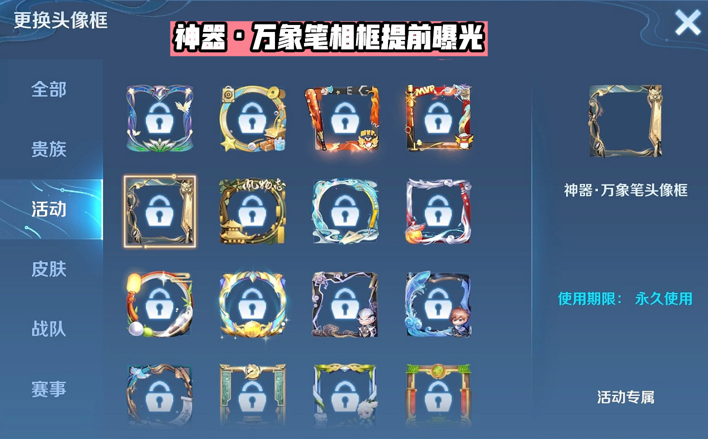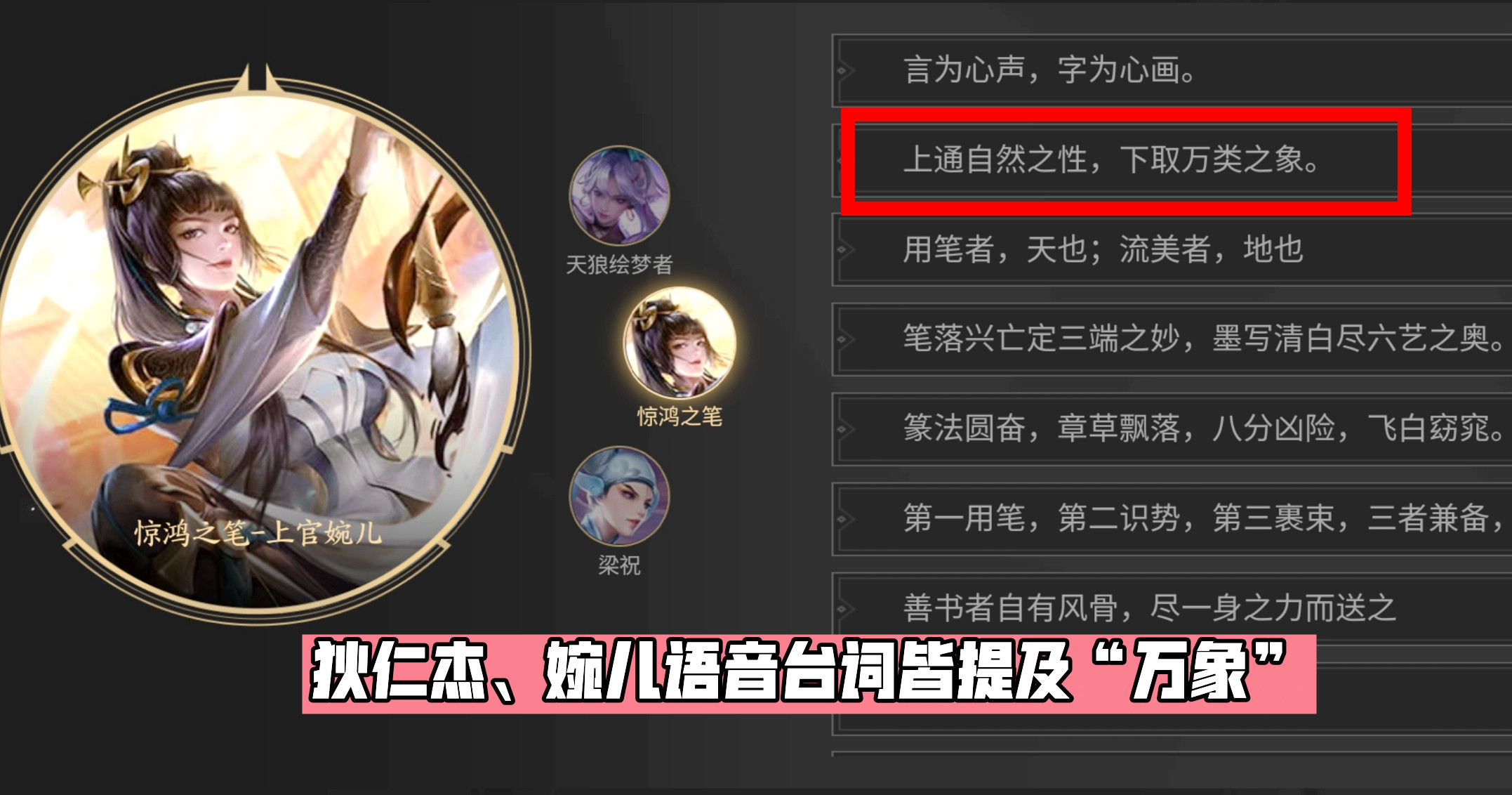 王者光彩的新皮肤预告除了诸葛亮的小黑板外,每周例行更新的运动也会有所暗示,比如必要指定好汉完成的使命,而上周指定的四位好汉分别是鬼谷子、阿古朵、狄仁杰和上官婉儿,前三位好汉的新皮肤已经连续上线,仅剩下上官婉儿还未发表,那么婉儿是否有新皮肤操持呢?答案是肯定的! 随着狄仁杰传说限定皮肤——神器·狴犴令的上架,官方同步上线了个性按键和头像框。值得一提的是除了狄仁杰新皮肤相框外,官方还不测发布了一个全新相框——神器·万象笔,该相框参加了毛笔、兽首等元素计划,而神器的前缀名预示这是另一款“神器传说”系列皮肤的专属头像框,要知道峡谷将毛笔当做武器的只有上官婉儿一人,以是该相框的归属已经很显着。 别的在狄仁杰新皮肤中还出现了“下不负万象街市商人”的语音台词,而婉儿自身也有“上通天然之性,下取万类之象”的台词,因此婉儿喜提神器皮肤算是实锤了。通过相框配色获知婉儿新皮肤以青色和烫金色为主色调,且拥有相框的话,其风致与狄仁杰一样会是传说限定级别!(PS:若婉儿加着迷器系列,预示世冠皮肤会给到其他好汉,小编推测会是高人气好汉(比如李白),固然详细归属以官宣为准!) 相识完上官婉儿新皮肤的消息,我们再来聊聊新福利和新增专精装备! 本周王者峡谷开启了一个给力福利,那便是网络100或150个“长安令”道具,能兑换永世好汉自选宝箱和姜子牙的勇者皮肤“炽热元素使”,必要注意的是长安令的使命并非只有一个,会随着周更而新增使命,以是想要兑换皮肤的小搭档做完一个使命后别急着兑换播报回城,可以等下期开启后继续网络。 末了项羽的专精装共创操持启动,这次仍旧由玩家计划方案,然后再评比出5个奖项,分别是一个最佳创意奖、一个最美人气奖和三个良好方案奖,得到奖项的方案夸奖永世史诗皮肤刘邦德古拉伯爵和白起星夜王子,项羽专精装落地游戏前还会上线体验服测试,感爱好的小搭档可以期待一下! 结语:“神器·万象笔”相框提前上线,上官婉儿喜提新衣,首款传说限定皮肤实锤,长安令道具别急着斲丧兑换,项羽专精装共创计划开启,两款史诗免费获取。 |