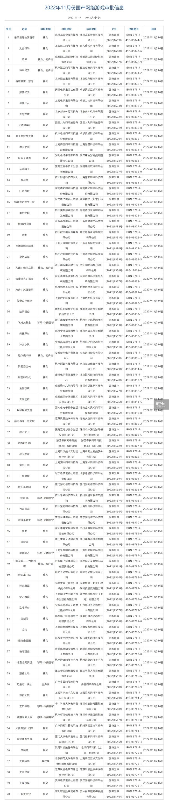 本日,国家消息出书署公布了11月国产网络游戏审批信息,共有70款游戏过审。此中包罗2款客户端游戏《太吾绘卷》《幻唐志:侠心》,5款移动、客户端游戏《彼界》《特攻纪元》《九畿:岐风之旅》《退休模仿器》《白荆回廊——古剑奇谭》,别的63款均为移动游戏。 腾讯与网易各有1款游戏获批版号:《合金弹头:觉醒》是由SNK授权、腾讯天美工作室开辟的横版动作游戏,于2021年5月腾讯游戏年度发布会上公布消息。《谎话西游:归来》由网易雷火工作室开辟,是网易游戏“谎话西游”系列构成部门。 同时获批版号的尚有在Steam曾获玩家好评、近期推出正式版的《太吾绘卷》,Double Think工作室开辟、心动署理的《退休模仿器》,西山居世游开辟的《彼界》等游戏。 本次版号发放的数目与上一次(9月)根本持平。停止现在,本年一共发放了384个版号。 获批版号的70款游戏完备名单如下: |