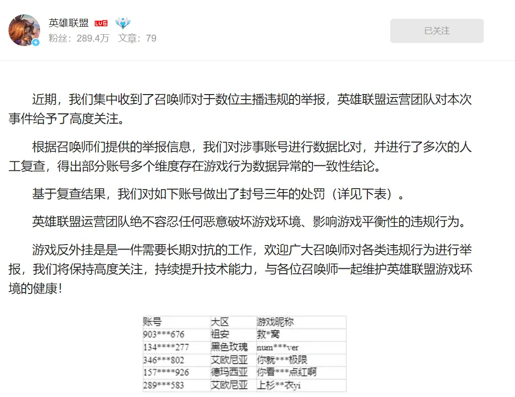 就在昨晚深夜时分,B站的豪杰同盟官方忽然发布了一则动态文章,实锤了B站着名U主厄风琉斯,黑洞king开挂。官方的公告内容,节选如下:根据召唤师们提供的举报信息,我们对涉事账号举行数据比对,并举行了多次的人工复查,得出部门账号多个维度存在游戏举动数据非常的划一性结论。基于复查效果,我们对如下账号做出了封号三年的处罚。豪杰同盟运营团队绝不容忍任何恶意粉碎游戏环境、影响游戏均衡性的违规举动。 被官方点名封禁的五个账号,有网友发现前面两个账号是厄风琉斯的,背面三个是黑洞king的。由于背面有个账号名字特别好记,黑洞KING的一波高光操纵,就是用这个账号,诺手在残血的环境下拿下了五杀。其时这一波也属于是名局面,只管赛后复盘,大量玩家都表现这一波操纵“不可思议,惊为天人。”大概其时间直播看到这波操纵的玩家,视觉震撼会更大。 统统都灰尘落定,统统的表明大话都是徒劳的。说了一句谎言,后续要用更多的大话去欲盖弥彰,用更多的大话去表明前一句大话。此次闹得沸沸扬扬的开挂变乱,很多圈内人着实一开始就指出,其时间两位的高光操纵给人感觉就是开了,就算是用前职业选手的视觉另有游戏明白去解读,那些高光操纵根本打不出来。 这里为官方的这波操纵点赞,在一个公平公开的竞技游戏内里开挂,简直是无法包涵的举动。如许的不负责举动,除了玷污游戏环境以外,还会给同一局的玩家带来非常欠好的游戏体验,一旦开挂举动得不到及时处置惩罚,乃至成为一种”风气“的时间,游戏的口碑也会遭遇断崖式的下滑。官方还指出这次公开的五个账号,只是第一批查处的效果,大概后续还会有更多的违规账号被曝光,等候后续。以上就是本篇豪杰同盟文章的全部内容,感谢阅读。 |