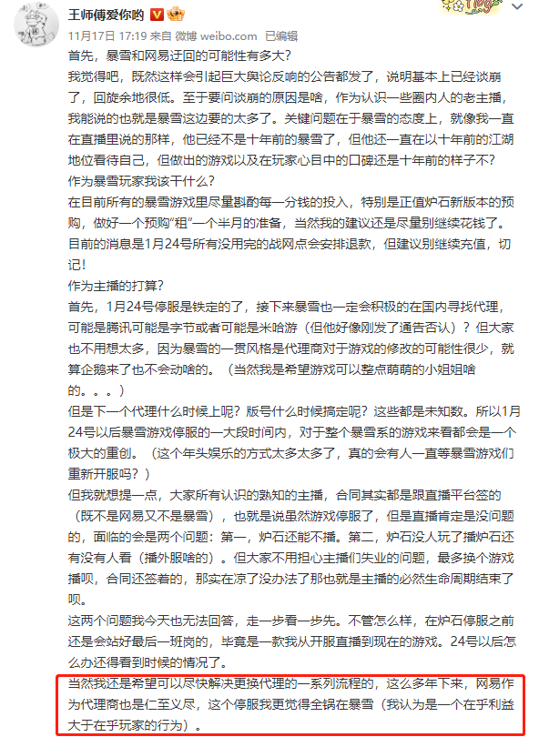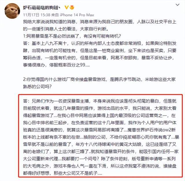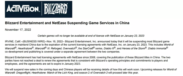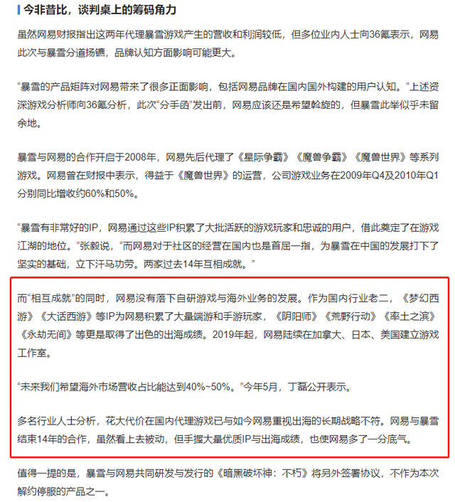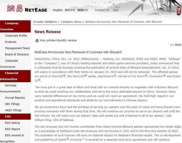11月17日,暴雪发布声明称与网易的相助于2023年1月到期且不再续约。自 2008 年以来,总部位于中国的网易就负责《魔兽天下》、《炉石传说》和《守望先锋》等游戏的发行业务,多年来常常延伸和更新这些买卖业务。此次制止相助,将为《魔兽天下》、《炉石传说》、《守望先锋》、《风暴豪杰》等多款产物在中国的服务画上句号。 在暴雪单方面先行公布制止相助后,网易也随后发布声明体现不停在尽最大积极和暴雪判,盼望推进续约。颠末长时间的会商,网易仍旧无法就一些相助的关键性条款与暴雪告竣划一,只能无奈担当暴雪制止相助的决定。 而且,网易也允许会继承观光职责,为玩家服务到末了一刻。同时,网易也努力善后,妥善处理惩罚好游戏数据,针对游戏中未斲丧的捏造钱币等内容开启专属的退款客服通道,夺取最大限度地保障全部中国玩家的合法权益。 暴雪公布和网易14年的相助关系制止后,网友也纷纷发表了自己的看法,很多人以为这次暴雪先行公布制止相助有点急功近利。同时,彭博社撰文报道暴雪网易制止相助称:据知情人士透露,除了财政条款之外,暴雪与网易制止相助的关键症结还在于,"知识产权的全部权"和"对中国各地数百万玩家数据的控制"。上述知情人士要求匿名,由于此部门会商不是公开的。 在中国开展业务还涉及游戏版号的题目,暴雪方面也提出了不可允许的束缚性条款,这也进一步印证了暴雪的苛刻开价导致会商终极破碎的推论。 双方14年的“友爱”长跑竣事后,很多暴雪游戏的头部主播也纷纷发声,以为这些年网易署理暴雪游戏可谓经心努力,纵然如今走到了无法续约的效果,网易也仍旧努力善后,能做到这个份上也算是仁至义尽了。 大多数网友也站队网易,以为网易做到了心安理得,岂论是线上还是线下,都带给玩家不错的游戏体验,如今双方竣事相助,影响最大的还是中国玩家。 对于双方竣事相助后网易是否会受影响这一题目,有专业人士也做了严谨分析。据专业人士称,网易通过暴雪的很多游戏IP积累了大批生动的游戏玩家和老实用户,借此奠定了网易在中国游戏市场的职位。 再者,网易近几年来也没有落下自研游戏与外洋业务的发展,旗下的《梦幻西游》、《大话西游》等IP为网易积累了大量端游和手嬉戏家,《阴阳师》、《荒野举措》、《率土之滨》、《永劫无间》等更是取得了出色的出海结果。2019年起,网易连续在加拿大、日本、美国创建游戏工作室,因此这次双方竣事14年的相助,网易看上去非常被动,但实际手握大量优质IP与出海结果的网易有着很强的气力和底气,不会受过多影响。 网易2022年Q3财报中也体现,三季度网易2022年净收入为244亿元,同比增长10.1%;毛利率137亿元,同比增长16.4%;归属于公司股东的净利润为67亿元。此中,网易游戏及相干增值服务营收187亿元,此中在线游戏营收174亿元。 而且,财报中还指出署理自暴雪的游戏,对网易2021年和2022年前九个月的净收入和净利润贡献百分比,均为较低的个位数,因此授权到期对网易的财政业绩将不会产生庞大影响。 |