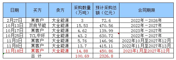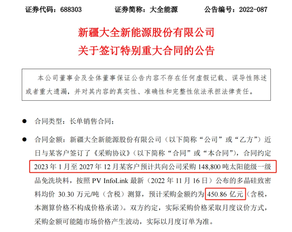 “7笔长单预计收入2326亿元,或贡献净利润1520亿元。” 作者:Alice 编辑:tuya 出品:财经涂鸦 据公司谍报专家《财经涂鸦》消息,11月18日晚,大全能源(688303.SH)发布公告称,已与某客户签订《采购协议》,约定条约期间向对方贩卖148800吨太阳能级一级品免洗块料用料,预计含税收入约450.86亿元。 条约履约限期为2023年1月至2027年12月。条约金额按照 PV InfoLink 最新公布的多晶硅致密料均价30.30万元/吨(含税)测算,实际贩卖代价双方采取月度议价方式确定。 据《财经涂鸦》统计,2022年大全能源已先后签订7笔硅料供货长单,累计销量达100.69万吨,含税收入2326亿元。根据大全能源三季报披露的前三季度多晶硅产销单位毛利率测算,7笔订单预计将为公司贡献净利润1520.67亿元。 注:10月25日大全能源披露金额为1308.96万元,根据审慎原则,统计数据取采购方TCL中环披露的金额630.72万元。(泉源:《财经涂鸦》整理) 值得注意的是,除了大全能源以外,通威股份(600438.SH)、新特能源(01799.HK)等硅料巨头也频签硅料大单。此中,通威股份年内也已签订6笔硅料长单,规模合计144.22万吨,金额3867.14亿元。 克日,晶澳科技(002459.SZ)拟投建光伏切片、电池、组件一体化智能工厂及研发中央项目,总投资约102 亿元。本年以来在布局一体化产能方面,晶澳科技已投资金额超200亿元。市场需求量不停扩大,企业也在积极布局财产投资。 11月17日,2022环球光伏财产峰会现场,《中国分布式光伏行业发展白皮书2022》正式发布。 《白皮书》体现,比年来,中国分布式光伏市场发展回暖提速,在“双碳”目标配景下,中国分布式光伏市场发展迅猛。就装机量来说,2022年1-9月,中国分布式光伏新增装机35.3GW,与2021年同期相比,增长了115%。 别的,随着光伏组件代价下行,逆变器徐徐实现国产替换,《白皮书》以为,中国分布式光伏将迎来更加广阔的市场远景和增长潜力,预期将来三年的年新增装机可实现50-65GW。 制止11月18日收盘,大全能源报54.04元/股,微涨0.54%,总市值1155亿元。 |