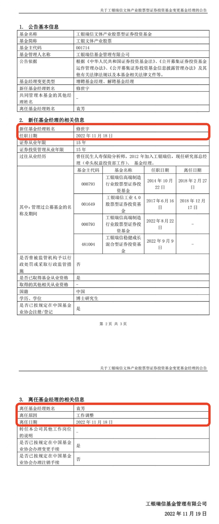 中国基金报记者 方丽 陆慧婧 临比年末,又有重磅级明星基金司理人事故动。 11月19日,工银瑞信基金公告,基金司理袁芳卸任其管理的包罗工银瑞信文体财产在内的5只基金,上述5只基金分别由修世宇、杜洋、鄢耀等基金司理接任,自此,袁芳已无在管基金。 袁芳是近些年公募基金行业涌现出的中生代女性基金司理代表,她的投资风格以均衡著称,本领圈涵盖斲丧、科技等范畴,她管理时间最长的工银文体财产股票基金近七年取得226.91%的任职期回报,年化回报18.76%,排名同类基金前三。 本年以来,基金司理变动呈加速趋势。Wind统计数据表现,停止11月16日,本年以来已有120多家公募基金管理人出现基金司理离任,近300名基金司理出现变动,此中不乏着名度较高的基金司理,如兴证举世的董承非、中欧的周应波、农银汇理的赵诣等。 业内人士表现,基金司理离任乃属正常征象,基金公司与基金司理也存在双向选择。比年来基金司理活动较快,某种水平上是国内基金行业快速发展导致的,基金司理的良性活动是基金行业发展的肯定结果。 又有明星基金司理卸任所管基金 这个周末,又有明星基金司理离任公告刷屏。 11月19日,工银瑞信旗下5只基金同时发布基金司理变动公告,袁芳因工作调解,于11月18日离任其所管的包罗工银瑞信文体财产、工银科技创新、工银瑞信圆兴、工银高质量发展、工银瑞信圆丰在内的5只基金司理,颠末此次调解,袁芳现在已无在管基金。 公告表现,袁芳管理时间最长的工银文体财产股票将由修世宇接任,她单独管理的别的两只基金——工银圆丰三年混淆、工银圆兴混淆将分别由杜洋、鄢耀接受。和其他基金司理共同管理的工银科技创新以及工银高质量发展基金将分别由基金司理胡志利和李昱继续管理。 从接任基金司理的情况上看,修世宇2012年参加工银瑞信,现任研究部总司理、牵头权益投资部工作。 杜洋2010年参加工银瑞信基金,现任研究部副总司理、投资总监,拥有12年证券从业履历。属于“均衡妥当型长跑选手”。 鄢耀同样也是2010年参加工银瑞信,现任权益投资部副总司理、投资总监,拥有15年证券从业履历,本领圈覆盖金融、斲丧、科技等核心赛道,组合设置均衡,分身代价发展。 胡志利2012年参加工银瑞信,现任权益投资部投资副总监,拥有10年证券从业履历,长期深耕财产升级和斲丧升级两大主线。李昱2017年参加工银瑞信,现任投资副总监,拥有15年证券从业履历。 对于袁芳此次的卸任,业内人士表现,工银瑞信作为平台型头部基金公司,拥有完备成熟的投研团队,也有不错的人才梯队作育,在良好的团队协作和美满的投资决议机制下,某一位基金司理的离任,公司都会选派最契合的基金司理接办干系基金的投资管理,确保原基金司理离任后安稳过渡。对于公司来说,基金司理离任影响都比力有限,而且也偏短期,长期来看,美满的投研体系和强盛的投研团队都在为干系基金保驾护航。 究竟上,除本次接受袁芳产物的杜洋、鄢耀、胡志利等基金司理之外,工银瑞信在股票投资范畴尚有多位绩优基金司理,如医药赛道的赵蓓、谭冬寒,大制造范畴的张宇帆,以及善于高质量、低换手率风格的王筱苓,投资风格兼容并包的何肖颉,发展风格的单文,均衡代价风格的杨鑫鑫等,基金公司和基金司理相互成绩,精彩的个人本领反面,更离不开平台的支持。 近七年任职期回报226.91% 袁芳是比年来公募基金行业申明鹊起的中生代女性基金司理代表,她的均衡投资风格同时受到机构及个人投资者认可。 从过往履历上看,袁芳曾在嘉实基金担当股票生意业务员,2011年正式参加工银瑞信基金,2015年12月起开始担当基金司理,之后还担当研究部大斲丧研究团队负责人,权益投资部投资副总监等职务。 她上任于熔断前夕,刚刚担当工银瑞信文体财产股票基金司理后的第三个生意业务日,就遭遇熔断行情,在艰巨的市场情况下,2016年,也就是管理基金首个完备的年度,工银文体财产就以15.72%的收益一举斩获当年平常股票型基金季军。之后,在2017年白马蓝筹股牛市中也取得了27.68%的收益率,进入同类基金前四分之一。2018年大熊市中也显现出很好的控制风险本领,该基金整年跌幅仅10.16%,当年同类基金均匀跌幅23.20%。2019年至2020年结构性牛市中,工银文体财产年度涨幅分别为57.52%、79.06%,排名稳固在同类基金前一百名。2021年极致分化行情中,整年收益10.34%,进入同类基金前40%。不外本年受到行情不佳影响,年内跌幅到达20.87%。 工银文体财产也是袁芳自担当基金司理以来管理时间最长的基金,Wind数据表现,她自2015年12月30日担当基金司理至2022年11月18日卸任,任职期回报226.91%,跑赢同期沪深300指数近226个百分点,年化回报18.76%,排名同类基金前三。 长期良好的投资业绩也使得袁芳受到市场“追捧”,她的管理规模在2021年二季度末一度逼近500亿元,停止卸任之前,个人管理规模仍超200亿元。 在已往几年,工银瑞信文体财产也一度备受公募FOF认可,Wind数据表现,自2020年4季度起,该基金曾一连三个季度成为公募FOF基金司理最青睐的权益基金。 曾谈及均衡设置应对市场颠簸 2015年开始管理基金的袁芳,袁芳投资风格也颇有特色,持仓方向均衡行业,如斲丧、科技、港股等。她曾在采访中直言不乐意被贴标签,还表现“不能很固执服从一种投资理念,投资逻辑框架要富足包涵、富足开放”。 而在投资实践