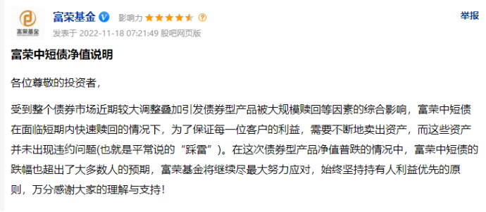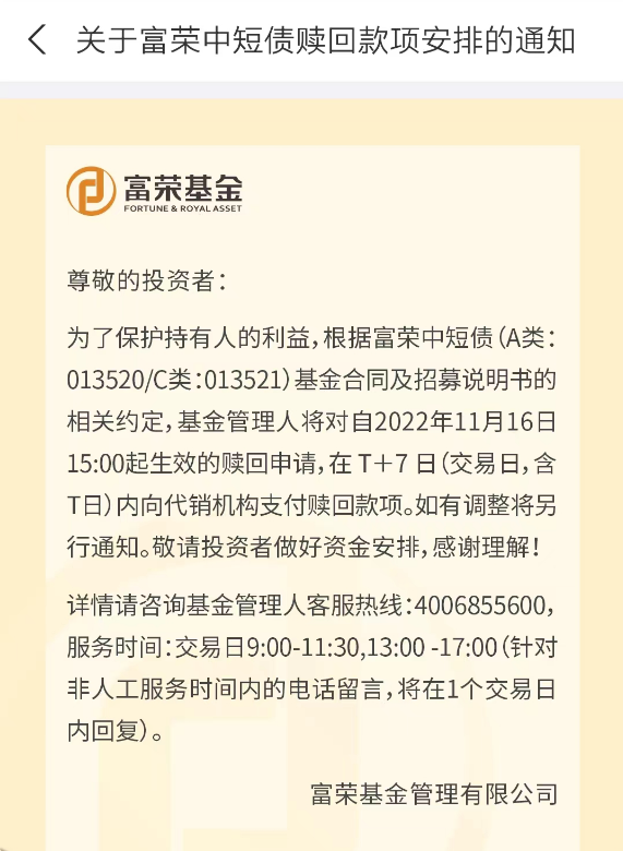 债市下跌的影响还在继续。 “原来是隔天就到账的,现在要T+7日才可以了。”投资者王小姐对第一财经记者体现,“之前看网上说,这类产物适当妥当理财,拿时间换收益,放着就行,没想到跌了这么多。现在还推迟到账,内心很担心。” 投资者说的上述产物是富荣基金旗下的富荣中短债(A类:013520/C类:013521)。记者翻阅付出宝、小红书、微博等干系话题发现,对于该产物赎回到账延长的消息已经引起了广泛的讨论,不少投资者在吐槽该产物净值大跌、延长到账等环境。 另一方面,面临“赎回潮”,业内也接纳了差别的应对方式,比方,有多只债券型基金发布进步份额净值精度的干系公告,另有基金公司选择运用固有资金自购旗下债券型基金产物。 “T+7”赎回延长 克日,债市迎来剧烈调解,不少债券型基金的净值回撤显着。以中短借主题基金为例,Wind数据表现,克制11月18日,在全市场356只中短借主题基金(差别份额分开盘算,下同)中,有325只产物自11月以来出现回撤,占比高出9成。 此中,富荣中短债A/C在此区间分别下跌4.11%、4.10%,年内收益仅剩0.14%、0.3%,险些吞噬了此前的收益。这一跌幅体现不但在同类可比的中短借主题基金中居首,而且是第三名(-1.6%)的两倍有余。 别的,在单日净值体现中,富荣中短债A/C的跌幅环境更加显着。11月16日、17日、18日中,富荣中短债A/C的跌幅在中短借主题基金中均处于领跌的职位,且均高于第三名一倍以上。 从基金净值环境来看,现在富荣中短债A/C的净值分别为1.0033、1.0015,与2022年1月尾至2月的水平相当。换言之,这波下跌亏掉了此前近9个月的累计收益。 富荣中短债A日净值环境 净值的大面积回撤天然也引发了浩繁投资者的赎回运动,富荣基金将付出赎回款子延伸到T+7个生意业务日内(含T日),并发布“致富荣中短债养基人的一封信”表明干系环境。 记者注意到,在付出宝干系页面中,富荣基金公告称,基金管理人将对自2022年11月16日15:00起收效的赎回申请,在T+7日(生意业务日,含T日)内向代销机构付出赎回款子。有购买了该产物的投资者向记者体现,在16日下战书5时卖出基金后,原来表现18日到账余额宝,后被改至24日前,现在表现为延期至28日到账。 记者致电付出宝方面,其客服体现,付出宝作为代销平台,是和基金公司举行相助,此举(延伸赎回时间)是对方反馈的信息,假如有调解的话将另行关照,具体到账的时间是以实际到账为准的。 对此,有公募基金业内人士对记者体现担心:“T+7日的延长到账比力少见,大概会再度引发投资者‘恐慌性’赎回,有大概会受到波及到其他债券型基金产物。” 别的,第一财经记者查询付出宝、小红书、每天基金吧等平台的干系内容发现,已有多位投资者表达对富荣中短债近期跌幅环境的不满,并出现“暴跌”“踩雷”等词。有投资者体现,“买中短债基金是为了得到相对稳固的收益,怎么跌得跟股票一样”“妥当理财居然也能亏这么多”“重新界说了债基”。 18日破晓,富荣基金电商运营司理在每天基金吧平台体现,“对不起各人,本日的净值把各人给吓到了,但真不是各人说的踩雷。” 同日,富荣基金官方账户也发布净值分析称,受到整个债券市场近期较大调解叠加引发债券型产物被大规模赎回等因素的综合影响,富荣中短债在面临短期内快速赎回的环境下,须要不停地卖出资产,而这些资产并未出现违约题目(也就是平常说的“踩雷”)。 一位债券类基金司理对记者体现,假如基金中的现金资产不满意赎回额度,那么只能出售基金投资的股票或债券等资产来准备资金,那大概导致标的资产运动性不敷而被迫低价卖出,从而造成净值大幅颠簸。 “大量赎回导致的负反馈大概还会连续,大概有运动性风险。”上述人士从资金流量角度表明,近期固收市场下跌,权益市场上涨,部分投资者举行资产设置再均衡的使用,资金或部分从债市流出,导致被动卖出债券。 毕竟上,在本年的震荡市下,富荣中短债A/C曾引起了较高关注度。Wind数据表现,数据表现,在11月的债市调解前,富荣中短债A/C本年以来的累计回报分别为4.59%、4.43%,而同期中短借主题基金的年内均匀回报约为1.97%。 这一体现也得到了投资者的认购。克制2022年三季末,富荣中短债的规模合计为49.51亿元,这一数字在二季度末仅为2.38亿元,暴涨了近20倍。仅在三季度中,其C类份额增长了38.96亿份至40.86亿份、A类份额增长了6.32亿份至6.75亿份。 不外,值得注意的是,在2022年中报数据中,富荣中短债A/C的个人投资者持有比例均高出80%。“这就要看三季度增长的那些份额是不是都是机构投资者的了,有大概是机构资金撤出。”有行业人士对记者体现,一样平常机构投资者占比高的基金产物,容易面临巨额赎回的环境。 提升净值准确度应对大额赎回 与此同时,记者也注意到,为应对“赎回潮”,另有多只债基发布了进步份额净值精度公告,现在数目已经高出20只,缘故起因无一破例均是“发生大额赎回”,产物份额将净值精度至小数点后八位或后五位。 比方,中融恒阳纯债公告指出,为确保持有人长处不因份额净值的小数点保存精度受到倒霉影响,自2022年11月17日起进步本基金C类份额的份额净值精度至小数点后8位,小数点后第9位四舍五入。 同时,公告中也明白指出,待大额赎回对基金份额持有人长处不再产生庞大影响时,规复基金条约约定的净值精度,届时不再另行公告。 按照原有的基金