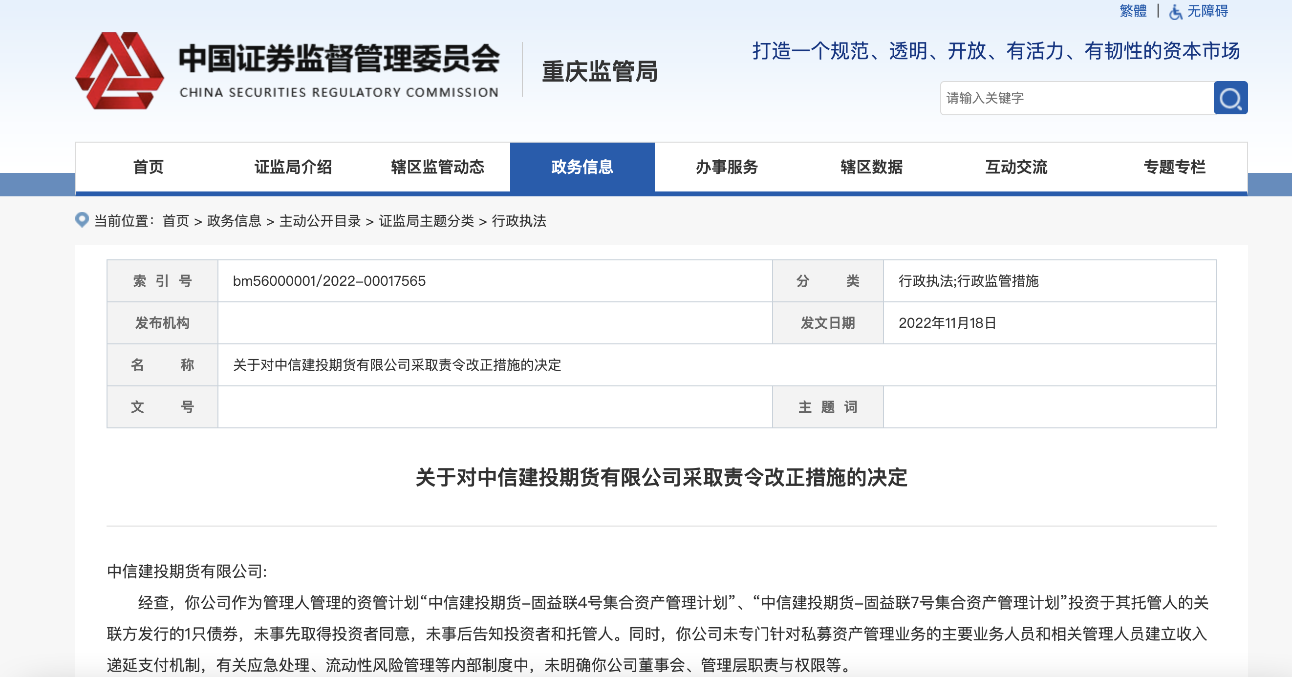 中信建投期货有限公司(下称“中信建投期货”)被重庆证监局接纳责令改正的监视管理步调。 11月18日,重庆证监局网站发布公告表现,中信建投期货作为管理人管理的资管筹划“中信建投期货-固益联4号聚集资产管理筹划”、“中信建投期货-固益联7号聚集资产管理筹划”投资于其托管人的关联方发行的1只债券,未事先取得投资者同意,未过后告知投资者和托管人。同时,中信建投期货未专门针对私募资产管理业务的紧张业务职员和相干管理职员创建收入递延付出机制,有关应急处理惩罚、活动性风险管理等内部制度中,未明确中信建投期货董事会、管理层职责与权限等。 重庆证监局表现,上述情况违背了《证券期货谋划机构私募资产管理筹划运作管理规定》(证监会公告〔2018〕31号,以下简称《运作管理规定》)第二十六条第一款、第四十一条,以及《证券期货谋划机构私募资产管理业务管理办法》(证监会令第151号 ,以下简称《管理办法》)第六十三条第二款的规定。 《运作管理规定》第二十六条第一款规定,证券期货谋划机构将资产管理筹划资产投资于本机构、托管人及前述机构的控股股东、实际控制人大概其他关联方发行的证券大概承销期内承销的证券,应当创建健全内部审批机制和评估机制,并应当依照投资者长处优先原则,事先取得投资者的同意,过后告知投资者和托管人,并接纳切实有用步调,防范长处辩论,掩护投资者合法权益。 《运作管理规定》第四十一条要求,证券期货谋划机构应当针对私募资产管理业务的紧张业务职员和相干管理职员创建收入递延付出机制,公道确定收入递延付出标准、递延付出年限和比例。递延付出年限原则上不少于3年,递延付出的收入金额原则上不少于40%。 别的,《管理办法》第六十三条第二款规定,证券期货谋划机构应当联合市场状态和自身管理本事订定并一连更新活动性风险应急预案,明确预案触发景象、应急步调与步调、应急资金泉源、公司董事会、管理层及各部门职责与权限等。 根据《管理办法》第七十八条和《运作管理规定》第四十二条第一款的规定,重庆证监局决定对公司接纳责令改正的监视管理步调,并记入证券期货市场诚信档案。 重庆证监局称,中信建投期货应接纳切实有用的步调对上述题目举行整改,对相干责任职员举行问责,并在收到本决定书之日起30日内提交书面整改陈诉。 重庆证监局表现,如果对本监视管理步调不平,可在收到本决定书之日起60日内向中国证券监视管理委员会提出行政复议申请,也可以在收到本决定书之日起6个月内向有管辖权的人民法院提告状讼。复议与诉讼期间,上述监视管理步调不克制实验。 官网表现,中信建投期货创建于1993年3月16日,注册地重庆,注册资源14亿元,是中信建投证券股份有限公司首家全资子公司,是中信建投证券服务客户举行衍生品投资、财产管理以及风险管理的战略平台,公司在天下重点地区设有28家分支机构。 财报表现,停止2022年6月30日,中信建投期货总资产人民币338亿元,净资产人民币29亿元,2022年上半年实现业务收入人民币41.63亿元,净利润人民币3.1亿元。 |