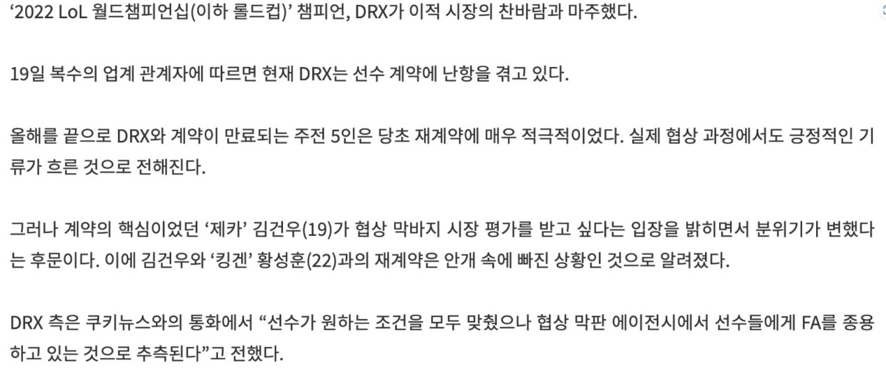 各位LPL的观众和好汉同盟召唤师各人好,这里是天鄙俚戏汇。S12环球总决赛上,DRX是创造了黑马古迹拿下了天下冠军,如许的表现让全天下的观众为之震动和感动,LPL的讲授米勒也是在角逐竣事之后感动堕泪,如许的一支队伍确实是好汉同盟汗青上绝无仅有的。 而在进入转会期之后,DRX却迎来了坏消息,俱乐部大吐苦水,以为选手要留不住了。 DRX想续约,但难度很大昨天LCK多方消息表现,DRX如今遇到了很多困难,DRX俱乐部是想要快速对五个冠军选手实现全员续约的,原班人马再战一年,原来的协商照旧比力顺遂的,但是背面忽然出现了变数,导致DRX将要面临遣散运气。 但是在会商的末了阶段,冠军中单Zeka选手表现盼望得到市场评价,与此同时Kingen也有类似的想法。 DRX与Kukinews通话的过程中透露:固然已经满意了选手想要的全部条件,但是在末了阶段,选手地点的经纪公司煽惑选手成为自由人。 由此来看,DRX对于选手经纪公司煽惑选手成为自由人的变乱是不太满意的。 由于一样平常环境下,顶级选手与老东家续约,都是在不成为自由人的条件下提前协商完毕,而一旦选手成为自由人,老东家就会非常被动。 尤其是像DRX如许的队伍,一旦队伍焦点选手公布成为自由人,其他选手也会受到影响,由于假如焦点选手留不住,再在这支队伍呆下去并不是一个好的选择。 经纪公司,以选手为焦点一旦说DRX中单或上单公布成为自由人,看看其他队伍的报价的话,DRX再想要全员续约,险些就是不大概的一件事,以致很大概会出现直接崩盘的态势,全部选手全部离队,由于DRX战队首发五人本年年底条约都到期。 很多观众会质疑经纪公司的做法,但实际上经纪公司的这种举动也是在为选手的将来做思量,所谓的煽惑,只是给出一个态度比力猛烈的发起,末了做决定还得是选手本身。 关键点在于选手身价,选手刚刚夺冠,身价肯定是会到达职业生活最顶级水平,续约老东家固然是一个好的选择,但假如老东家给出的报酬,与市场代价差比力多的话,纵然有感情加持,选手很大概也不会选择留队。 因此让选手去打仗打仗其他队伍,看看其他队伍给出的报酬,然后综合思量,本身是否还要留在老东家队伍,这是一个相对公道的转会期计谋,由于选手夺冠的难度是很大的,一旦夺冠,就要思索这大概是职业生活唯一的冠军,拿下之后思量好将来,不要让本身悔恨。 DRX战队,与其他冠军差别个人以为DRX战队,与其他的天下冠队伍伍有很大差别,DRX在本年的S12上以不被看好的阵容设置古迹般地夺冠了,想要告竣如许的古迹,须要达整天时地利人和多方面的条件,说实话DRX的这个冠军,更像是限定版,来岁再想打出好结果大概说夺冠,实在很难。 由于看起来不像是能创建王朝,在将来很长一段时间内都统治联赛的队伍,更像是一支能在限定时间段内冲上顶峰,但版本变动之后会快速下滑的一支队伍。 与S5的SKT以及S10的DWG差别,DRX更像是S7的SSG,由于DRX在整年的绝大多数时间内都没有显现出S12如许的竞技本领,很大概换一个版本,DRX就会成为一支很平常的队伍,一点也不浮夸。 关键看选手本身是怎么想了,假如说以为这支队伍原班人马继续打一年,不太大概再打出好结果,假如选手都如许以为的话,成为自由人拿到更高的身价,是最好的选择。 |