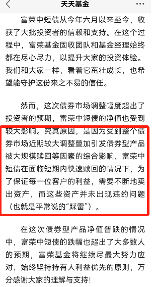 记者 杜萌 一天跌去三年涨幅!债券基金仍在连续上周的颠簸。昨日富荣中短债A更新了净值,单日下跌-12.07%! 这么大的跌幅震惊了整个投资圈。这只纯债基金发生了什么?昨日深夜,富荣基金发布声明,称该基金持有的资产并没有出现违约题目,没有踩雷,而是为了应对大规模赎回,而不停卖出资产所导致的。 图:富荣基金昨日夜间发布声明 泉源:每天基金网 在11月18日,该基金公司就曾发布声明,表现基金面临短期内的快速赎回。“为了包管每一位投资者的长处,须要不停地卖出资产。”公开资料表现,富荣中短债创建于2021年12月8日,是一只告急投资中短期债券的基金,基金司理为王丹、唐奥。 停止三季度末,基金持有的债券比例为94.56%,此中中短期单子占比为72.78%。此中,按公允代价来看,持有比例前五名的债券分别为19渤海银行永续债(1928024.IB)、19民生银行永续债(1928013.IB)、22大唐集MTN002(102281614.IB)、22潞安MTN011(102281400.IB)、21京住总集MTN002(102101706.IB),合计占比为19.07%。 公开资料表现,停止三季度末,富荣中短债A规模为7.03亿元,机构持有占比为23.84%,个人持有占比为76.16%;富荣中短债C规模为42.49亿元,机构持有占比为13.49%,个人持有占比为86.51%。 有债券基金遭遇大量赎回,但却有百亿债券基金沉寂放开了限购额度,是什么缘故原由? 界面消息记者统计发现,自11月17日以来,就有10只债券基金调解了单日限购额度。此中,鹏华稳利短债、国寿安保尊益名誉纯债、鹏华丰华等三只基金则放宽了限购额度。 表:11月17日以来限购基金明细 泉源:Wind 界面消息研究部 从调解申购额度的公告来看,多是公募管理人为了充实掩护基金份额持有人长处,保障基金安稳运作。同样是债券基金,为何有的限购,有的则放开了申购额度? 具体来看,有些基金限购是为分红做准备。鹏华9-10年利率债在11月18日公布停息单账户单日100万元以上的大额申购。11月19日,该基金公布举行分红,此中A份额每10份分红0.061元,C份额每10份分红0.029元。 银河丰利债券也在11月14日发布了限购公告,将逐日限购额度控制在100万元。随后,该基金举行了每10份0.26元的分红。11月18日,该基金的大额申购金额则再次从100万元调解到500万元。 也有百亿债基放开了大额申购额度。以鹏华丰华为例,停止三季度末,这只中恒久纯债型基金规模为105.67亿元。本年8月2日,该基金公布将大额申购额度从500万元低沉到100万元,随后该基金举行了本年以来的第三次分红。11月8日,该基金举行了本年的第四次分红,每10份分红为0.389元。11月17日,该基金公布再次将单日单账户的申购额度从100万元进步到500万元。 国寿安保尊益名誉纯债则一下子将申购额度从1万元放宽到1000万元。8月15日,该基金再次将申购额度从10万元调解至1万元。从业绩来看,近一周来,该纯债基金的业绩为-0.79%。 11月17日,广发景利更是将机构投资者的大额申购限额从100万元调解至10万元。公告表现,该基金早在2019年9月18日就停息了个人投资者的申购和转换业务。半年报表现,该基金的机构持有占比为100%。 华宝基金肴杂资产部总司理李栋梁在担当界面消息记者采访时表现,本轮调解是从“资金-短期债券”开始的,随着防疫政策优化、以及随后的地产一连政策,带来了经济中恒久破局预期,市场对债券总体趋向审慎,债券各个限期都快速上行。 针对债券的后市,李栋梁表现,随着疫情防控政策的调解、地产政策的一连放松,以及外洋钱币政策紧缩进入尾声,从大类资产设置的角度来说,天平或正从债券向权益类资产渐渐转移。对于一级债券基金,投资人可以根据基金的汗青收益率、净值回撤情况,具体题目具体分析。总体来说,发起投资人恒久持有,淡化短期回撤的影响。 |