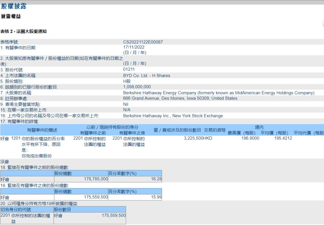 11月22日消息,据港交所数据表现,巴菲特旗下的伯克希尔哈撒韦于11月17日卖出了322.55万股比亚迪H股,匀称股价195.42港元,套现约6.3亿港元,将比亚迪H股持股比例从16.28%降至15.99%。 本年8月份以来,伯克希尔哈撒韦已多次减持比亚迪,算上11月17日的抛售,伯克希尔哈撒韦近3个月内已是第五次脱手。 回溯来看,伯克希尔哈撒韦在8月24日出售了133万股比亚迪H股,套现3.69亿港元;9月1日减持171.6万股比亚迪H股,套现4.5亿港元;11月1日卖出329.7万股比亚迪H股股份,套现5.6亿港元;11月8日出售578.2万股比亚迪H股,套现约11.4亿港元。 针对巴菲特减持比亚迪H股一事,比亚迪相干工作职员曾回应媒体称,股东减持举动系股东投资决议,公司销量屡创新高,如今筹谋情况康健,齐备正常。 从业务方面来看,比亚迪股份于11月3日披露的产销快报表现,公司1-10月新能源汽车销量139.79万辆,同比增长233.92%。此中,10月新能源汽车销量21.78万辆,同比增长168.78%,这也是继9月之后,比亚迪单月销量再度突破20万辆。 二级市场上,自2022年下半年以来,比亚迪H股股价低迷。制止11月22日收盘,比亚迪股份报178.2港元/股,总市值为5188亿港元。(文|唐果) |