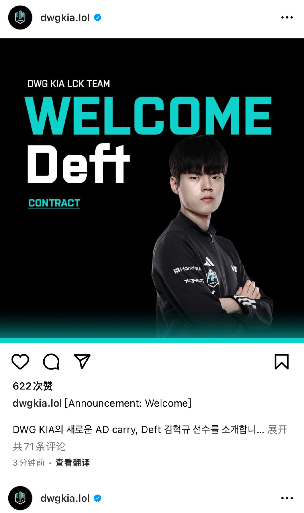 步入冬季转会期,LCK已经开始连续官宣新赛季阵容了,继HLE官宣前EDG冠军下路Viper进队后,积极补强的DK官宣前DRX冠军ADC羊驼Deft、前NS主力上单Canna加盟! 至此DK新赛季阵容根本确定,由上单Canna、打野三叔Canyon、中单ShowMaker、ADC羊驼Deft、辅助Kellin构成 此前,11月22日DRX官方公布:DRX和Kingen选手、Pyosik选手、Zeka选手、Deft选手、BeryL选手的合约已经竣事。 DRX官方原文:DRX和Kingen选手、Pyosik选手、Zeka选手、Deft选手、BeryL选手的合约已经竣事。 DRX对陪同队伍最辉煌光耀旅程的5名选手表现衷心的感谢。 而且,为了以后也能继续与这些选手们举行愉快的挑衅,DRX将继续与选手们沟通为续约而积极。 感谢全部到场2022 DRX叙事的粉丝们,我们答应来岁也会成为与最良好的选手们一起创造更加出色故事的DRX。 |