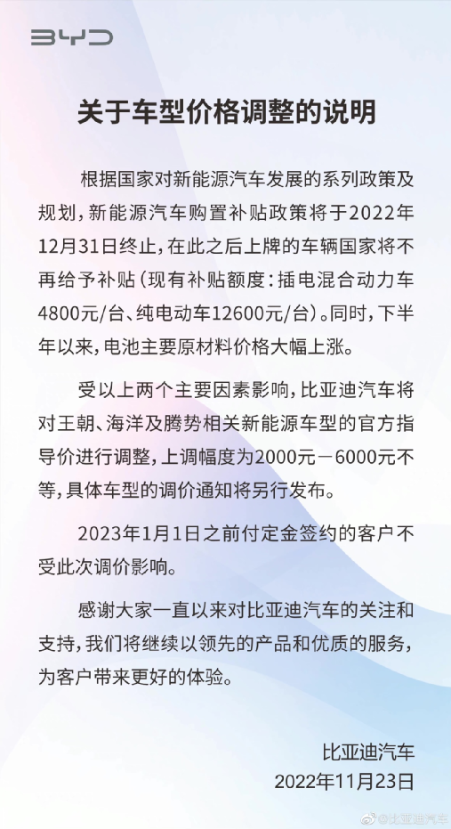 见习记者 周倬睿 11月23日上午,比亚迪官方公布,比亚迪汽车将对王朝、海洋及腾势干系新能源车型的官方引导价举行调解,上调幅度为2000元到6000元不等,具体车型的调价关照将另行发布。 对于涨价的缘故起因,比亚迪表现,重要受到国家取消补贴政策、电池原质料代价大幅上涨影响。 比亚迪称,起首,根据国家对新能源汽车发展的系列政策及规划,新能源汽车购置补贴政策将于2022年12月31日停止,在此之后上牌的车辆国家将不再给予补贴(现有补贴额度:插电混淆动力车4800/台、纯电动车12600元/台)。同时,下半年以来,电池重要原质料代价大幅上涨。 别的,比亚迪还在公告中夸大,2023年1月1日前付定金签约的客户将不受此次调价影响。这意味着,消耗者仍旧有一个多月的时间以现在的代价下单购车。 涨价或出于本钱增长、冲刺销量等思量 据此前比亚迪公布2022年10月交付数据表现,比亚迪10月新能源汽车的产销量分别22.01万辆和21.78万辆,同比增长168.9%,上年同期8.10万;1-10月新能源汽车销量140.29万辆,同比增长158.52%。 值得一提的是,一个月前,特斯拉正式调解国内Model3和ModelY的售价,贬价幅度均凌驾1万元。受此影响,市场人士广泛以为比亚迪会跟进贬价,没想到没等来贬价反而比及了涨价。 记者以投资者身份致电比亚迪,比亚迪工作职员表现,其他品牌贬价有自身订单、产能、品牌、供应链等多方面缘故起因导致,相互环境并不雷同,比亚迪此次针对部分车型涨价是根据比亚迪自身环境符合公司发展现状的决议。 市场分析人士以为,比亚迪公布涨价,一来出于本钱缘故起因,比亚迪已往利用自产电池自行消化本钱,在上游碳酸锂代价一连高企和国家补贴退坡以致取消下,终极不得不向消耗者转嫁本钱;二来每年四序度都是车企冲销量的黄金季候,本次针对2023年1月涨价或与倒逼潜伏消耗者提前落实购车活动、增长本年度下单量有关。 巴菲特年内五次减持比亚迪 11月22日,港交所披露易数据表现,“股神”巴菲特旗下伯克希尔哈撒韦再减持比亚迪H股,这已是巴菲特年内第五次减持比亚迪。 根据港交所数据表现,巴菲特旗下伯克希尔哈撒韦11月17日继续减持322.55万股比亚迪股份,减持的匀称代价为195.42港元,此次套现约6.3亿港元,减持完成之后,伯克希尔持有比亚迪股份从16.28%降至15.99%。 本次减持比亚迪已是八月巴菲特初次减持比亚迪之后,伯克希尔哈撒韦第五次减持比亚迪。 巴菲特8月24日第一次减持比亚迪,当时减持了133.1万股,匀称生意业务代价277.10港元。9月1日,巴菲特再度减持171.6万股,匀称生意业务代价262.72港元。11月1日,巴菲特再减持329.7万股。11月8日巴菲特减持578.25万股。11月17日巴菲特再减持322.55万股。至此,巴菲特持有比亚迪股份已从19.92%降至15.99%,累计套现约102.68亿港元。 对于投资者广泛关心的巴菲特是否将进一步减持比亚迪,机构人士以为:“未来巴菲特的减持比亚迪的活动还将继续,按照巴菲特现在的减持速率,大概大概到来岁中旬才华减持完毕。现实上,对于巴菲特的减持活动,也不必太过解读,由于科技股不停都不是巴菲特的偏幸。” 股价表现疲软,根本面乐观 二级市场上,比亚迪股价走势相对疲弱。自巴菲特8月24日初次减持比亚迪以来,制止发稿,比亚迪H股报174.3港元,较8月24日比亚迪H股股价已经下跌约36.15%。 然而从公司根本面上看,比亚迪仍旧表现亮眼。三季报表现,比亚迪期内营收为1170.81亿元,同比增长115.59%,其归母净利润为93.11亿元,同比增长281.13%。 11月23日,据中国汽车工业协会统计分析,2022年1-10月,汽车销量排名前十位的企业(团体)共贩卖1898.3万辆,占汽车贩卖总量的86.4%。在前十家企业中,与上年同期相比,比亚迪销量增速最为显着。 (图源:中国汽车工业协会) 别的,除了销量数据不停提拔外,比亚迪还发力高端车市场,美满业务线。比亚迪已于日前发布高端车型瞻仰,在结构中低端车型之后打击高端车市场,比亚迪业务线将得到进一步美满。 编辑:小茉 |