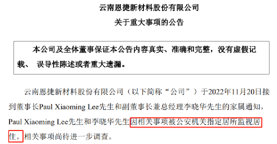 中国基金报记者 南深 因公告实控人李晓明、李晓华兄弟(分别任公司董事长和副董事长)被公安构造指定寓所监督居住,11月22日,1300多亿市值的环球锂电池隔膜龙头恩捷股份一字跌停。 当天,公司告急召开投资者电话集会会议,不乏高盛、红杉、中金、易方达等国表里顶级机构参会,不外第二天也就是11月23日,公司股价继续暴跌,盘中数度跌停,收盘跌幅也达7%,而成交放出天量居两市第一,60多亿资金疯狂出逃。 有媒体报道李氏兄弟涉事系因涉及江西一名被查官员,但公司方面的口径不绝是“不清楚所涉事项的详细内容”。但无论是何缘故起因,李氏兄弟被监督居住起首将直接影响公司正推进中的定向增发项目,该定增拟募资高达128亿元。 一位资深投行保代对中国基金报记者表现,定增要向证监会陈诉会后事项,董事长副董事长被监督居住显然属于庞大倒霉,变乱不办理羁系不大概让启动发行。此前公告表现,恩捷股份本年6月拿到了定增批文,有效期12个月,现在时间已颠末去5个月。 高级副总裁告急主持工作 董监高全员上阵接待调研 恩捷股份11月22日的电话集会会议上,不乏着名顶级机构,涵盖头部公私募、险资、QFII和券商,包罗贝莱德基金,高盛国际,花旗团体,Fidelity,AXA,BNP,D1 Capital,Point72,红杉资源,景林资产,正心谷资源,君和资源,半夏投资,易方达基金,天弘基金,嘉实基金,交银施罗德,民生加银基金,安全资管,中金公司,太保资产,各人资产,南方基金,国金证券等。 而公司方面除了被监督居住的李氏兄弟,险些全部董监高齐上阵,包罗董事兼高级副总裁程跃、董事马燕、董事马伟华、董事冯洁、独立董事卢建凯、独立董事唐长江、独立董事郑海英、董事会秘书禹雪、监事张涛、监事康文婷、监事陈涛、财务总监李见,及公司焦点管理层。 公司董事兼高级副总裁程跃先容,停止现在,就公司把握的信息,“公司未能知悉董事长和副董事长所涉事项的详细内容,干系事项尚待进一步观察”。 程跃表现,公司管理层及焦点职员11月21日下战书告急召开了集会会议,“由本人来主持公司一样寻常工作”。程跃称,会上还做了“1点夸大2项明白和3个要求”: 第一,偏重夸大公司筹谋战略和既定方针稳固,公司将继续深耕新能源财产,在中国新能源财产已步入快车道的紧张时候,肯定要把握汗青时机; 第二,明白以锂电池隔离膜业务为焦点来实现快速发展,明白各古迹群和子公司的职责; 第三,要求各层管理职员及全体员工刚强、高效地实行既定使命和目标,在建项目要求按既定时间表推进产能扩建操持,扫除万难保障卑鄙客户的供应安全,要责备体员工头脑连合同一,用心做好生产筹谋工作,业绩才是硬原理。 而公司市场总监在电话会上表现,“本日公司和很多客户举行了沟通,告知客户现在公司及各子公司生产及交付均在正常举行中”。其称,公司的战略焦点客户对恩捷的现有业务以及后续相助布满信心。 财务总监则表现,“现在公司账面资金充沛,公司举行了极限的压力测试,足以支持公司现有的生产筹谋和资源付出,迩来和现有相助银行举行了沟通,他们都表达了对公司的支持”。 超60亿资金疯狂出逃 成交放出天量居两市第一 11月21日收盘后,恩捷股份突然公告,于2022年11月20日接到董事长PaulXiaomingLee(即“李晓明”,已入籍美国)和副董事长兼总司理李晓华的眷属关照,PaulXiaomingLee和李晓华因干系事项被公安构造指定寓所监督居住。干系事项尚待进一步观察。 根据《中华人民共和国刑事诉讼法》第六章的干系规定,监督居住是人民法院、人民查察院、公安构造在刑事诉讼中限令犯罪猜疑人、被告人在规定的限期内不得脱离住处大概指定的寓所,并对其举动加以监督、限定其人身自由的一种逼迫步伐。 广州一位着名状师对中国基金报记者表现,监督居住一样寻常涉及刑事案件,“在取保候审、监督居住期间,不得制止对案件的侦查、告状和审理”。 必要留意的是,与不少类似公告通常会夸大“因个人缘故起因”或“与公司无关”,恩捷股份此次公告并无干系说话。 11月23日,第一财经报道,“从多个信源交织求证到,恩捷股份正、副董事长两兄弟被警方控制,系因涉及江西一名被查官员,变乱缘起恩捷股份四年前在江西省高安市的一项收购”。而该名官员正是当地前任市委书记。 受变乱影响,11月22日恩捷股份开盘后毫无牵挂地一字跌停,并维持到盘终,收盘仍有凌驾20亿资金封板,等待出逃。 11月23日,只管公司告急沟通投资者,但仍然是一字跌停开盘,直到约15分钟后有资金实验翘板,并数次开合。午后公司股价略微回升,但收盘跌幅仍然达7%,两天跌幅到达17%。而23日全天的成交额竟然高达62亿元,在两市近五千只股票中高居第一,是其暴跌前一天成交额的10倍。 128亿定增项目出息未卜 批文有效期还剩7个月 李氏兄弟被监督居住,最直接的影响起首是公司正在推进中的大手笔非公开股票发行。 客岁11月,恩捷股份抛出非公开发行预案,拟发行不凌驾本次发行前公司总股本的30%,即不凌驾2.68亿股,拟召募资金总额(含发行费用)不凌驾128亿元。 扣除发行费用后的召募资金净额将用于5个项目,包罗重庆恩捷高性能锂电子电池微孔隔膜项目一期二期,江苏恩捷动力汽车锂电池隔膜财产化项目等,以及增补活动资金。 颠末半年多的工作流程,公司于2022年6月28日收到中国证监会下发的《关于答应云南