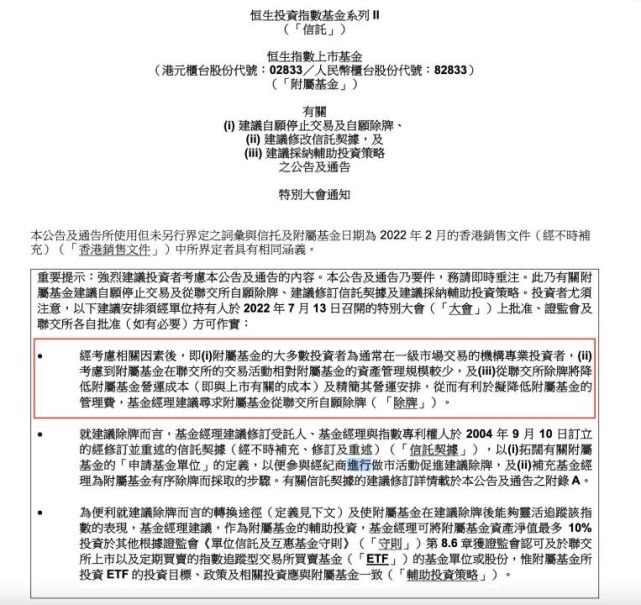 中国基金报记者 叶诗婕 香港首个、也是规模最大的生意业务所交易基金(ETF)盈富基金又有大动作! 盈富基金8月19日晚间公布,9月19日不但将转换基金管理人,还将增设人民币生意业务柜台。这意味着,该ETF将可举行双币交易。 (泉源:盈富基金公告) 增设人民币柜台 可双币生意业务 盈富基金公布,自9月19日起,该ETF司理人将由道富环球投资管理亚洲有限公司(SSGAAL)转换为恒生投资管理有限公司;恒生投资将于转换管理人收效同日,为盈富基金的二级市场引入人民币生意业务柜台,生意业务代码为82800,中文简称为“盈富基金-R”。 在新增人民币柜台方面,公告还指出,盈富基金人民币交易基金单位的每手交易单位同样为500个基金单位,双币柜台安排将答应基金单位持有人将基金单位从人民币柜台转换至港元柜台,但每名基金单位持有人只会以港元收取股息。 盈富基金还表现,引进人民币柜台后,现有一级市场运作稳定,全部实物增设或赎回继承以港元结算。人民币柜台只用于二级市场生意业务及结算,可与盈富为港元交易基金单位发行的现有实物根据交换。 盈富基金同时也提示投资者,港元及人民币交易基金单位于联交所的市场代价,大概视乎市场活动性、各个柜台的供求,以及港元与人民币的汇率等因素而出现庞大差别。 别的,盈富基金更换管理人后,美国道富银行会继负继承盈富基金信托人。 下调新司理人及信托人费用 在增设人民币生意业务柜台的同时,盈富基金公告还提到,转换司理人产生的本钱及开支,包罗法律费用及行政开支等,将由恒生投资负担,或由信托人、新司理人及现任司理人尚有协定,盈富基金不会负担有关本钱及开支。 而自转换司理人收效日起,盈富的管理费及信托人费用将会下调,设有分级费率表。 最新每年管理费,资产净值首150亿港元为0.045%、厥后150亿港元为0.03%、再厥后150亿为0.02%,别的部分为0.015%。新收费表下,盈富基金每年信托费和管理费收费基准类似。 (泉源:中国基金报记者根据盈富公告整理) 停止8月19日收盘,盈富基金最新资产净值约为1114.46亿港元。参考最新收费程度,恒生投资、道富银行作为司理人和信托人,每年可分别收取约超2400万港元。 据本年3月盈富基金发布的公告,恒生投资上台后,盈富基金首3年实质管理费减31%至0.022%,第4年起减至0.019%,即现在6成程度。而盈富基金整年开支比率,有望由0.1%减至0.08%程度。 参考盈富基金2021年年报,盈富基金该年付出约3200万港元管理人费、3200万港元信托人费,另付出指数特许权费1464万港元。 (泉源:盈富基金2021年年报) 恒指ETF将除牌 可安排投资者转持盈富基金 恒生投资8月15日公布,恒生ETF将于本年9月13日除牌,基金末了生意业务日为9月2日,现在持有恒生ETF的投资者,可选择将其持有的全部基金单位转换为盈富基金。 投资者可在9月7日前申请,该转换将于9月9日生意业务时段后收效。 (泉源:恒生投资公告) 恒生投资称,思量到其管理的恒生ETF大多数投资者为在一级市场生意业务的机构专业投资者,基金在联交所的生意业务活动相对资产管理规模较少,以及除牌将低落基金营运本钱及精简营运安排,从而有利低落基金的管理费,发起恒生ETF志愿除牌。 停止8月19日收盘,恒指ETF的资产规模为近400亿港元。 恒生投资管理有限公司董事兼行政总裁李佩珊表现,在履任盈富基金司理人后,恒生投资将致力为直接或透过强积金投资于盈富基金的投资者创优增值,冀让盈富基金保持作为香港人操持抱负生存的告急投资选择之一外,亦支持香港ETF市场继遭受益于一连增长的需求。 更换管理人风波 盈富基金对香港有深层意义,可以说是“为香港人而设的基金”。 盈富基金诞生于1998年亚洲金融风暴期间。香港特区政府为救市,在十个生意业务日内于公开市场以1180亿港元买入33种恒指成份股,以稳固接洽汇率。1998年10月,香港特区政府建立了外汇基金投资有限公司,其功能之一为就该投资组合以一个有秩序的方式沽售提供意见。终极,特区政府选择了一个对股票市场造成最少影响的中性方案。 1999年11月,港府把购买的港股以盈富基金上市,以ETF为结构,分批售回市场,也开启了香港特区的ETF市场,并约请ETF管理履历丰富的道富环球(State Street)作为管理人至今。 当时,盈富基金以 333 亿港元(约莫 43 亿美元)的规模发行,为当时亚洲(日本除外)最大型的初次公开发售。 2020年初,时任美国总统特朗普签下行政下令,克制美国人投资裁制实体名单上的公司,继而令身为美资的司理人性富环球决定,不再对名单的股份举行新投资,受影响包罗蓝筹股中移动、中海油及联通,有关决定与盈富紧贴恒生指数的原意相违,并引起巨大反响。 道富相隔数天即“调停”并更改决定,规复投资受裁制股份,但克制美国人加入盈富基金。结果盈富基金监视委员会于本年5月公布,将司理人由美资的道富环球换成港资的恒生投资。 (泉源:盈富基金公告) 编辑:乔伊 |