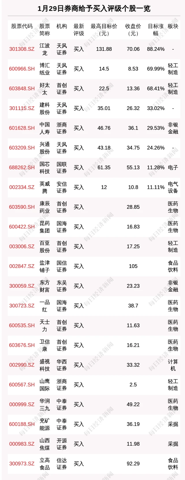 每经AI快讯,1月29日,券商给予评级的个股数共有26只,得到买入评级的个股数共有22只。在公布了目的代价的8只个股中,按照最新收盘价盘算,预期涨幅排名居前的个股是江波龙(301308.SZ)、博汇纸业(600966.SH)、好太太(603848.SH),预期涨幅分别是88.24%、69.99%、68.41%。 从券商对个股的关注水平来看,有2只个股得到多家券商关注,券商关注数目排名居前的个股是兖矿能源(600188.SH)、立高食品(300973.SZ)。 从券商对行业的关注度来看,券商关注个股数居前的行业分别是医药生物、轻工制造、采掘。 (记者 王晓波) |