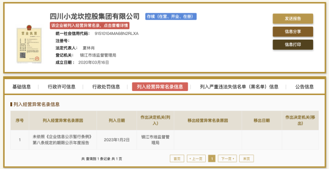 国家企业名誉信息公示体系网站体现,1月2日,四川小龙坎控股团体有限公司因未按规定限期公示年度陈诉,被锦江市场监督管理局列入筹谋非常名录。 该公司建立于2020年3月,法定代表人为夏林肖,注册资源500万人民币,由四川仁众投资管理有限公司全资持股。对外投资信息体现,该公司全资持股成都小龙坎餐饮管理有限公司、成都小龙坎食品有限公司、成都蜀大侠餐饮管理有限公司等多家公司。 |