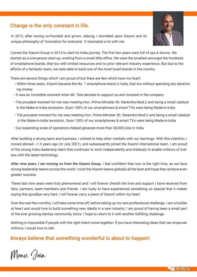 据多家媒体报道,小米环球副总裁、印度分部负责人Manu Kumar Jain已经离职。 周一,Jain在个人Twitter上公布,他已经离开了供职9年的小米。 在推文中,Jain对已往9年自己在小米的工作中得到的支持表现感谢,并表现将继承开启一段令人高兴的新的路程。 在随推文发表的一篇公开信中,他表现「颠末九年的时间,我将离开小米团体,在接下来的几个月里,我将苏息一段时间,然后担当下一个职业挑衅。」 信中还回首了自己自2014年进入小米以来的履历,以及一些难以忘怀的高光时间,好比与印度总理莫迪的碰面,促成小米智能机和智能电视的「印度制造」,在本地办理了凌驾5万人的就业等等。 信的末端,引用了一句米粉都熟悉的名言:永世信赖精美的事故即将发生。 不管是推特照旧公开长信中,Jain都没有公开他离开小米的缘故起因。不外据称,他在已往几个月来不停在向投资者推介一家电动车创业公司的想法。 已往很长一段时间以来,Jain已向很多业内人士提过自己要离职的事故。 掌舵7年,小米制霸印度「第一功臣」 Manu Kumar Jain是小米进入印度市场的紧张人物,他于2014年到场小米,负责小米在印度的市场开辟。 在到场小米之前,Jain是印度本土电子商务公司Jabong的首创人。 出于本地人对本地市场的深度相识和准确把握,以及对电子商务业务逻辑的丰富履历,他订定了一项基于电子商务网站上的手机「闪电营销」的战略,使小米在这个对代价高度敏感的市场上敏捷打开了局面。 再加上小米在交际媒体上的宣传攻势,小米敏捷在印度市场上崭露锋芒,以更实惠的代价克制了竞争对手三星、一加、oppo和vivo等一众品牌,成为印度销量第一的手机品牌。 除了全面操盘线上贩卖战略,并大获乐成之外, Jain还向导了小米线下实体店的扩张操持,将产物线从手机扩展到智能电视、氛围净化器等家电产物,大大拓宽了收入泉源,也让印度乐成成为小米最紧张的外洋市场,没有之一。 2017年1月,Jain成为小米环球副总裁,继承负责印度业务。 2021年, Jain离开印度,前去迪拜。 其时有推测称,这一活动与印度国内的对外国公司的羁系查察和竞争压力加剧有关,不外Jain称,此举是为了资助小米其他地区的市场「向印度学习」。 据消息人士称,Jain本操持被提拔到更高的环球高管职务,但厥后小米改变了主意。 同年,小米在印度的市场份额出现颠簸和下滑,停止客岁Q3,虽仍保持第一,但领先上风被三星、苹果收窄。 2020年,中印界限发作辩说和对峙,两国关系降温,印度开始以「市场羁系」之名打击境内的中国公司,几家中国手机厂商首当其冲。客岁4月,印度控诉小米公司非法向外洋汇款,但小米对此予以否认。 Jain本人以致被印度执法部分传唤,根据小米的说法,他在税务纠纷标题上一度受到了「暴力威胁」。 小米在印度的人事故更也早就到来了。上个月,小米在印度的首席商务官Raghu Reddy辞职。 市场份额降落、高管动荡,现在又失一员大将,小米在印度的日子远没有已往几年好过了。 小米印度「受难记」:第一宝座无了、当局突击查抄 得力干将出走,并非小米唯一遇到的糟心事。 新加坡研究公司Canalys的一份新陈诉指出,2022年第四序度,小米销量在五年来初次被三星反超。 这种局面并非无迹可循。根据数据平台Statista,小米在印度市场的份额,自2021年底一起下滑。 泉源:Statista 根据Canalys的数据,2022年第四序度,印度智能手机市场的出货总量降落了27%,降至3240万部。 三星第四序度出货量为670万台,市场份额为21%。这是自2017年第三季度以来三星初次在印度位居第一。Vivo以640万台的出货量紧随厥后,上涨13%。 小米在末了一个季度降至550万台,位居第三。只管云云,依附前三季度的精彩体现,在2022整年,小米仍然是印度第一大手机厂商。 Canalys的陈诉表现,印度国内斲丧者付出在第四序度放缓,这也对智能手机的需求产生了负面影响。对小米而言,必须面临第四序度「糟糕的电子商务节日贩卖业绩」。 而除了下滑的业绩,小米还要遭受日益严厉的非市场方面的压力。 自2020年中国和印度队伍发生疆域辩说以来,印度当局增强了对中国科技公司的查察。 客岁5月,印度反洗钱机构以「违反印度外汇法」,冻结了小米印度分部代价7.25亿美元,约合48亿元人民币的资产,约为小米客岁在印净利润的四分之一。 早在1月,印度财务部就转达小米印度「逃税65.3亿卢比」,来由是该公司向高通和小米移动软件公司付出的特许权利用费和专利答应费,未被计入其入口商品的买卖业务代价。 而在2021年12月,印度当局以致以逃税和洗钱控诉,突袭了小米的办公室。小米已经关闭了其在印度的金融服务业务,从本地应用步调市肆撤回了移动付出和数字贷款应用步调。 告急的局面使得公司内部变动剧烈。客岁12月,小米印度首席商务官Raghu Reddy辞职,以「在外部寻求差别的增长时机」。 双重压力下,中国智能手机品牌逆风斗争。客岁印度的智能手机出货量降落了6%,降至1.516亿台。 如履薄冰的中国厂商 小米被针对,其他国产手机厂商的日子也欠好过。 在印度的中国智能手机制造商发现,本地的营商情况越来越恶化,大多数公司都在已往一年遇到了法律逆境。 7月,印度当局责怪Oppo躲避代价5.51亿美元的关税,而观察职员则以涉嫌洗钱为由突袭了Vivo的数十个服务处。 从事跨境投资和羁系变乱的状师Atul Pandey表现,小米观察案预示着印度当局对