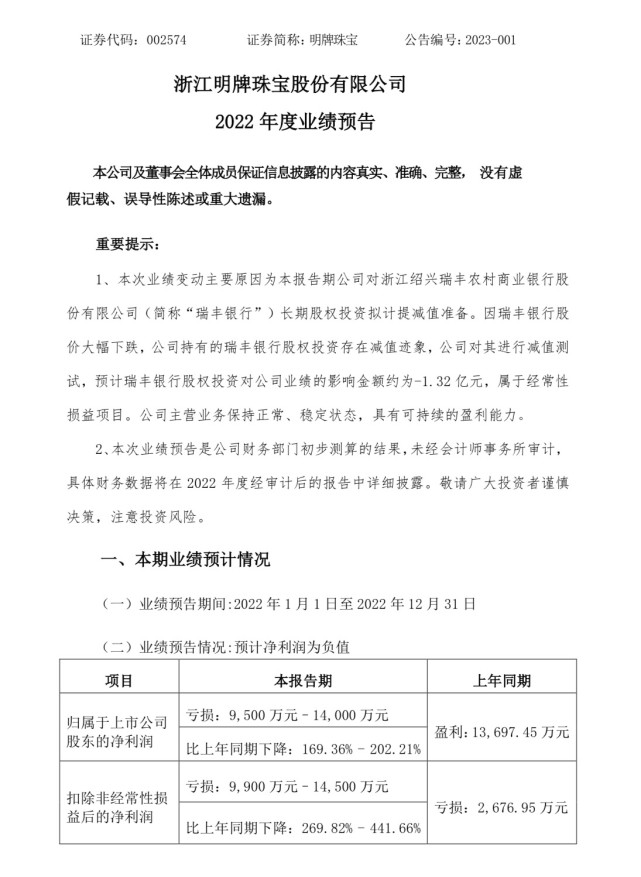 新京报贝壳财经讯 1月30日晚间,浙江明牌珠宝股份有限公司(以下简称“明牌珠宝”)发布2022年度业绩预告,该公司预计2022年业务收入达34.5亿元至35亿元,净亏损9500万元至1.4亿元,同比降落169.36%至202.21%。 图/公告截图 明牌珠宝在公告中称,本次业绩变更告急缘故起由于2022年度公司对瑞丰银行股权投资拟计提恒久股权投资减值准备。 编辑 郑艺佳 校对 翟永军 |