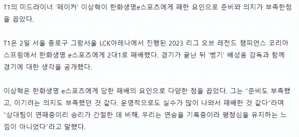 2022年冬季转会期,HLE大手笔签下天下赛冠军选手Viper、Zeka和Kingen,队内打野和辅助也是玩家们非常熟悉的Clid和Life。本以为LCK有一艘超等战舰即将腾飞,但没想到春季赛中的HLE表现令人扫兴,首战告胜之后拿到三连败战绩。 在昨天的LCK角逐中,一方是接连败北状态不佳的HLE,一方是保持连胜占据头名的T1,看似没有牵挂的角逐,但终极照旧出现了不测,HLE以下克上突破了T1春季赛的不败金身。 Bengi监视也表现没想到:本以为HLE处在连败阶段,以是会士气不佳。但没想到他们准备得非常充实,BP阶段也下了很多功夫,选手们的状态也很好,以是很遗憾输掉了角逐。 而Faker选手则表现:我以为我们准备得不敷充实,而且缺少剧烈的求胜欲。对手正在连败,而我们是四连胜,以是未能以寻常心对待这场角逐。我们在角逐中出现了很多事物,包罗在运营和利用等方面。 谈到BP准备,HLE监视也谈到了自己的看法:T1常常会活用下路双AD阵容,我们会对其举行制止。其次是打野位,我们必须要自动出击。T1在之前的角逐中已经多次显现了他们不善于泽丽+璐璐这个组合的环境,假如我们选泽丽+璐璐,那么很有大概会被T1牵着鼻子走,以是我们准备了打法强势的蜘蛛和下路对局。 |