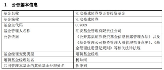 中国经济网北京2月3日讯本日,汇安基金管理有限责任公司发布基金司理变更公告,汇安嘉诚债券(A类007609;C类007610)增聘基金司理杨坤河。 杨坤河曾任中国五矿团体公司黑流中央风控主管、高级业务司理;东北证券股份有限公司研究所分析师;清静洋证券股份有限公司研究院首席分析师,2021年2月参加汇安基金管理有限责任公司任固定收益投资部基金司理。2021年9月27日至今,任汇安信利债券型证券投资基金基金司理;2022年7月27日至今,任汇安嘉盈一年持有期债券型证券投资基金基金司理;2023年2月2日至今,任汇安嘉诚债券型证券投资基金基金司理。 汇安嘉诚债券A、C建立于2019年8月9日,其2022年收益率分别为-5.77%、-6.16%,停止2023年2月2日,其建立来收益率分别为11.41%、9.88%,累计净值分别为1.1118元、1.0971元。 |