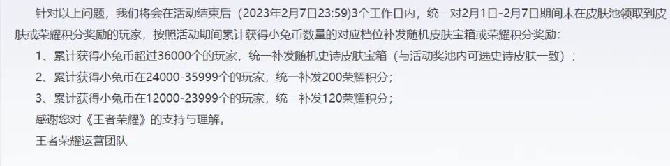 苦瓜原创,翻版必究! 《苦瓜电竞》--让你体验不一样的电竞主播圈! 对于王者光彩玩家来说,这次春节王者光彩的运动照旧挺给力的,不管是白嫖的照旧可以氪金的鲤跃龙门运动,官方都照顾到了每一个差异需求的玩家,不错。这此中,小兔墟市应该是玩家到场度最高的运动,毕竟只要你天天玩游戏就可以了,赢利小兔币革新池子白嫖皮肤,很不错,在游戏中也能做买卖,这个运动模式,王者官方应该会不停一连下去。 原来是挺不错的一个运动,但是迩来小兔墟市但是引起了玩家们的热议,毕竟突然间奖池里就无法再革新了,显着是写的2月7号竣事啊,怎么没有了呢?一下子,玩家们的丧失还挺大的,特别是没有来得及调换的,存了那么多的小兔币白白浪费了,不能担当。 这里就是笔墨游戏了,也是时间重点的夸大标题,着实过细看了之后,还真不是官方的锅,只不外这个时间重点的夸大,官方没有放在最显眼的地方,直接主页面是2月7号,玩家们都会以为,就是2月7号竣事。 着实1月17日-31日这段时间是做使命的时间,2月1日-7日是领夸奖的时间,这才是真正的明白,以是就写到了2月7日,误会也就出现了。 还好官方也实时给出了处理惩罚效果,这个效果照旧让玩家们挺满意的,同一对2月1日-2月7日期间未在皮肤池领取到皮肤或光彩积分夸奖的玩家,按照运动期间累计得到小兔币数目标对应档位补发随机皮肤宝箱或光彩积分夸奖: 1、累计得到小兔币高出36000个的玩家,同一补发随机史诗皮肤宝箱(与运动奖池内可选史诗皮肤划一); 2、累计得到小兔币在24000-35999个的玩家,同一补发200光彩积分; 3、累计得到小兔币在12000-23999个的玩家,同一补发120光彩积分; 渴望之后官方把时间重点写清晰,不要再出误会了。 我是苦瓜,我为自己带盐!(不带油) |