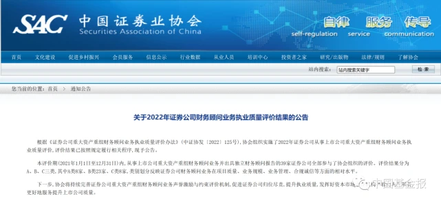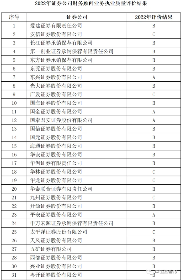 中国基金报记者 莫琳 2月3日,中国证券业协会发布2022年证券公司财务顾问业务执业质量评价结果, 39家券商参评,终极8家券商获评A类、B类23家、C类8家。 中国证券业协会指出,种别分别反映证券公司财务顾问业务在项目质量、业务规模、业务管理、合规诚信等方面的相对程度。 下一步,协会将连续美满证券公司巨大资产重组财务顾问业务荣誉鼓励与束缚评价机制,促进证券公司归位尽责,提升执业质量,发挥好资源市场中介机构“看门人”职责,更好地服务提升上市公司质量。 A类券商大幅淘汰 得到A类评价的8家券商分别是中信证券、中金公司、中信建投证券、国泰君安证券、安全证券、国金证券、东兴证券、中德证券。 而2021年评价结果中,则有14家券商获评A类,分别是:长江证券、东吴证券、国泰君安证券、国信证券、华泰证券、安全证券、申万宏源证券、天风证券、兴业证券、中金公司、银河证券、中泰证券、中信建投证券、中信证券。 这意味着,长江证券、东吴证券、国信证券、华泰证券、申万宏源证券、天风证券、兴业证券、银河证券、中泰证券9家券商滑出A类。而国金证券、东兴证券、中德证券则在2022年提升A类。 2022年曾修订评价尺度 财务顾问为上市公司收购、巨大资产重组、归并等业务活动提供专业服务并出具专业意见,其执业程度直接关系到上市公司策划质量和广大投资者优点。 2022年,中证协体现,现行《证券公司从事上市公司并购重组财务顾问业务执业本事专业评价工作指引》实行已有9年,随着并购重组市场化发展和注册制改革,已难以综合反映一家证券公司执业质量,为更好发挥财务顾问评价扶优限劣的引导作用,因此举行了修订。 总的来看,修订后的《评价指引》融入了注册制改革配景下加强投行业务羁系的要求,对积年评价工作中碰到的情况做了美满,评价指标由规模主导转向质量主导,扩大了项目评价范围,优化了评价结果分类,加大了合规扣分力度,简化了评估工作步伐。 中证协体现,为鼓励证券公司投行业务差别化发展,本次修订弱化了项目数目等业务规模对评价结果的影响,突出夸大项目质量的紧张性。 在评价名称方面,将“执业本事专业评价”同一改为“执业质量评价”。在指标体系方面,删除证券公司分类结果指标,使评价结果与财务顾问执业质量关联度更高;新增内部控制指标,通过评价投行业务内部控制建立和运行有用性,促进证券公司从公司团体层面体系性进步财务顾问业务质量;新增创新性指标,鼓励证券公司创新性办理财务顾问业务中碰到的现实标题,更好地满意实体经济需求。 此前的评价体系只认可须要证监会允许的独立财务顾问项目,为顺应并购重组市场化发展和注册制改革,修订后的《评价指引》项目评价范围新增“注册制”等行政允许类并购重组项目和非行政允许类巨大资产重组项目。 修订后的《评价指引》体现,评价期内有项目的券商被分别为A类、B类、C类三个品级。原则上得分排名前20%的证券公司为A类,排名后20%的为C类,别的为B类。评价期内无项目的券商无得分,同一确定为N类。 此次共有39家券商参评,按照前20%来就算,仅有得分排名前8的券商才华获评A类。 值得留意的是,根据WIND数据统计,2022年,华泰证券作为财务顾问到场并购项目的数目,在券商中排名第三,但是仍然滑出A类券商,阐明评价尺度更加器重项目质量的紧张性,而非数目。 以下是《2022年证券公司财务顾问业务执业质量评价结果》。 |