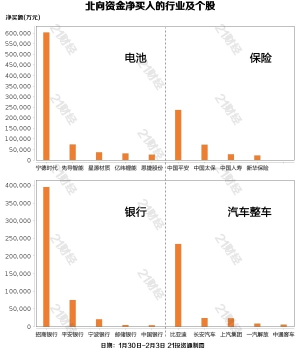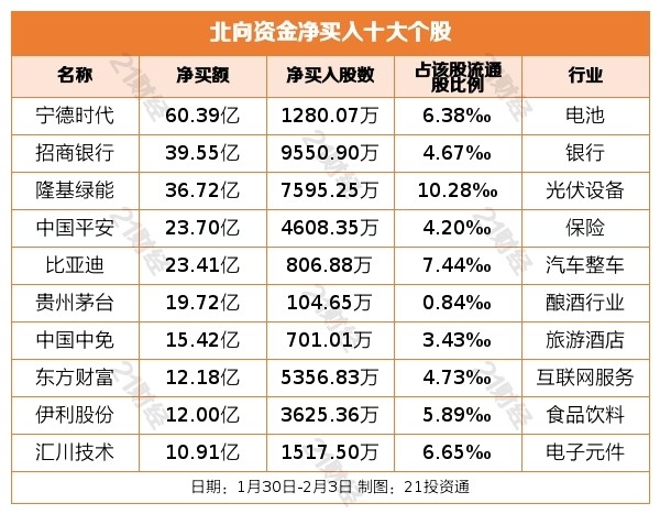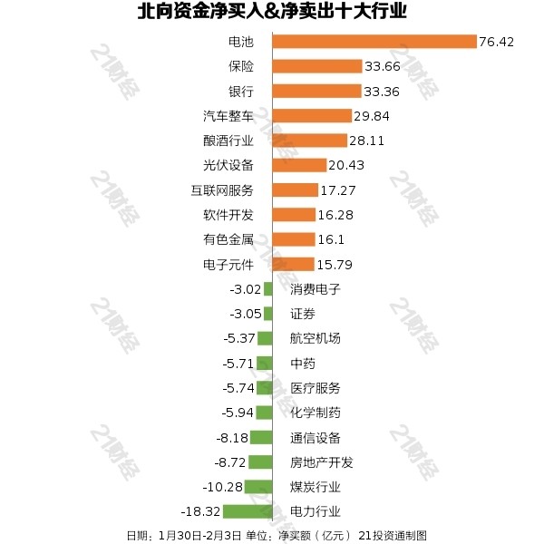 本周A股市场进入兔年行情,团体有所回落,此中沪指周跌0.04%,深成指周涨0.61%,创业板周跌0.23%。 据21投资通智能监测,1月30日-2月3日,北向资金合计净买入341.8亿元,此中沪股通净买入152.93亿元,深股通净买入188.86亿元。此中2月3日(周五)全天净卖出42.46亿元,制止一连17日加仓步调。 越声理财分析指出,对于周五的单日净流出,没有须要过于恐慌,北向资金此前一连跑步进场,增配的核心资产物种底部以来累积了较大的涨幅,部分资金举行赢利回吐实属正常。只要不是趋势性的、阶段性大规模出逃,对市场感情影响有限。整年来看,随着美联储竣事加息周期,美元指数总体是高位震荡回落,人民币汇率升值也尚未竣事,叠加国内经济复苏确定,北向资金大概率继承增配A股,成为非常紧张的增量资金。 增持电池,减持电力行业从净买入金额来看,北向资金增持了68个行业,此中电池居首,净买入金额达76.42亿元,其次是保险行业,净买入33.66亿元。 北向资金减持了32个行业,此中电力行业最多,净卖出金额达18.32亿元,其次是煤炭行业,净卖出10.28亿元。 净买入宁德期间60.39亿元,净卖出通威股份10.70亿元个股方面,北向资金净买入宁德期间(300750.SZ)、招商银行(600036.SH)、隆基绿能(601012.SH)、中国安全(601318.SH)、比亚迪(002594.SZ)居前,此中,宁德期间被净买入60.39亿元,招商银行被净买入39.55亿元,隆基绿能被净买入36.72亿元,中国安全被净买入23.70亿元,比亚迪被净买入23.41亿元。 北向资金净卖出通威股份(600438.SH)、康龙化成(300759.SZ)、长江电力(600900.SH)、美的团体(000333.SZ)、恒瑞医药(600276.SH)居前,此中,通威股份被净卖出10.70亿元,康龙化成被净卖出6.96亿元,长江电力被净卖出6.23亿元,美的团体被净卖出5.95亿元,恒瑞医药被净卖出5.25亿元。 (声明:文章内容仅供参考,不构成投资发起。投资者据此操纵,风险自担。) |