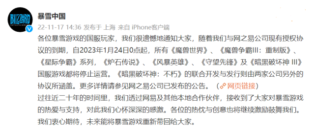 春节假期的余韵还未散去,网友“无业游鲨Thr”的分享寂静成为游戏爱好者之间的小热门,一个成年人忽然发现本身失去了他爱玩的游戏。 顾客扣问网吧管理,为什么玩不了《魔兽天下》游戏?答复说“暴雪系列国服都没了”。在网管无法做出进一步表明之后,这个夫君坐在那什么都没做,只是欣赏暴雪游戏在国内停运消息,接着便不绝说着“我游戏玩不了了,那我玩什么啊”。分享此事的网友也感叹,“听着太惆怅了。” (图源:微博@无业游鲨Thr) 2023年1月24日,因游戏开发商暴雪和国内运营方网易未能告竣同等,前者也没能探求到额外的连续运营方式,自2009年网易开始互助运营的《魔兽天下》游戏在国内停止运营,其他的多款暴雪旗卑鄙戏也在同一时间给按下了在华运营的停息键。只是,归来之日或遥遥无期。 一石激起千层浪。暴雪中国于停服前自行上线了供玩家下载数据的《魔兽天下》游戏脚色存档功能,网易则在停服后开启余额退款渠道。玩家或寻求前去外服嬉戏途径,或是选择其他游戏不再连续旅程。也有人对动视暴雪CEO鲍比·科蒂克口诛笔伐,以为他断送了暴雪游戏前程。 (图源:暴雪中国) 无论怎样,一个期间已经远去。我们盼望用一组数字,来纪录这个游戏行业及跨国商业互助的告急事故。 暴雪玩家末了的68天2022年11月17日,暴雪侧单方面发出公告,称除《暗黑粉碎神:不朽》外的暴雪游戏因授权协议到期,将于2013年1月23日后停息服务。今后网易方面发出公告,证明了两边在续约题目上未能告竣同等,将动手关停暴雪游戏国服并安排退款,暴雪和网易的互助迎来闭幕。 (图源:暴雪中国) 早先,外界以为此事仍有斡旋空间,暴雪率先发难不外是盼望在会商中把握更多自动权。今后的局势发展让玩家意识到,乐成续约的大概性越发渺小,渐渐开始推测腾讯、字节跳动或其他互联网企业会拿下署理权。然而没有任何实质效果,玩家群体将在68天后和暴雪游戏告别。 11月23日,暴雪游戏国服充值通道关闭,这意味着时间计费的《魔兽天下》账号一旦到期,玩家将没有正常的继承游戏途径。因此能兑换游戏时间的道具代价猛涨,二手渠道成交价从原价360元涨至超500元,直到运营团队提供暂时充值办法,才暂时遏制了云云局势。 对于玩家而言,充值逆境仅仅是游戏迎来停服了局的插曲,1月24日停服后将要何去何从才是真正的题目。一部门人开始实行更多的同范例游戏,《魔兽天下》玩家就大量涌入各类大型MMORPG游戏,网易旗下武侠题材游戏《逆水寒》乃至还专设运营模式有调解的“老兵服”。 (图源:暴雪中国) 相称一部门人选择转战暴雪游戏外服,熟悉的游戏能最大限度连续娱乐体验,暴雪于国际市场运营的游戏都提供了完满中文化,且《星际争霸2》《守望先锋2》都从预付费转向了免费嬉戏,玩家转移门槛着实不高。《魔兽天下》虽需充值时间,但早已有外服嬉戏成熟体系。 100万人列队等候退款网络游戏制止服务后,玩家尚未斲丧的充值余额将如那里理,不绝是行业颇有争议的环节。暴雪停服一事得到了消协关注,亦有网友提及了各类涉及游戏停服的司法案件中,玩家怎样夺取到应有权利的案例。游戏消耗对应的假造道具全部权饱受关注,因此宁静凡服务不甚雷同。 网易暴雪游戏客服团队公布将针对玩家在“暴雪游戏产物”中已充值但未斲丧的假造货币或未失效的游戏服务,开放退款申请通道,提交退款申请的制止日期为2023年6月30日。鉴于暴雪游戏在国内重新上线正式运营的时间点遥遥无期,大量玩家选择申请退款掩护本身的权益。 2月1日退款通道正式开放,玩家纷纷在交际媒体分享了本身的退款界面,纵然以时间计费和客单价相对较低的游戏内道具为告急红利模式,仍有相称数量的玩家为本身的游戏账号充入数百元乃至数千元金额,短短一天之内,体现有高出100万人列队等候退款。 (图源:微博) 买断制游戏默认不退款引发讨论。《星际争霸2》《暗黑粉碎神3》《守望先锋》在上线之处,都采取暴雪游戏最早在单机模式下的买断制付费,但现实上采取全程联网的网络游戏形态运营。许多玩家以为买断制付费就应提供离线长期可玩体验,却遭此次停服影响无法继承嬉戏。 停服和退款对网易、暴雪两边的同样产生了财务影响。暴雪发出公告后网易股价走低,今后网易公告称暴雪互助收益仅占少数,从财报中也能看出网易自研运营端游手游早已是收入中流砥柱。暴雪亦未如预期般告竣收益更高的续约,动视暴雪股价来到近一年的最低点。 268个《炉石传说》主播暴雪游戏产生的代价不光仅是直接为玩家提供游戏体验一个环节,更由于故事、美术、嬉戏等多个有深度的部门,给那些创造娱乐内容的游戏主播们提供了大量素材。游戏主播由于玩暴雪游戏吸引到更多观众,同时这些游戏也由于主播影响力,得到2010年前无法想象的出圈效果。 最范例的案例莫过于《炉石传说》和依赖这款游戏走上舞台的主播们。《炉石传说》是“魔兽”系列衍生而来的卡牌对战游戏,继承故事设定的同时又有着无需太多门槛的嬉戏体验,早期依附游戏体验和金字招牌引来主播,轻松上手的本质又使其被不是暴雪粉丝的大量玩家喜欢。 (图源:《炉石传说》国服官博) 游戏-主播-观众,三者之间构成了相互依赖共荣的生态圈。游戏主播在对战中能更有效地产生节目内容,观众看直播得到消遣娱乐又会