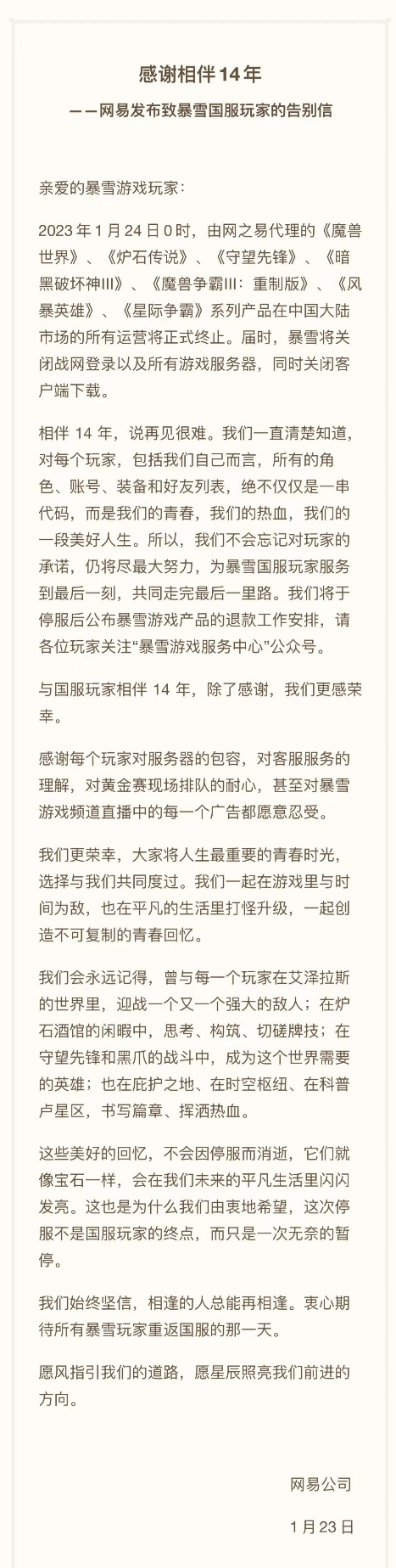 在1月,国内游戏圈玩家共同见证了一场规模浩大的赛博葬礼。 随着暴雪与网易的署理条约到期,除《暗黑粉碎神:不朽》外,全部的暴雪游戏产物都关闭了国服服务器,这不但让许多玩家自发地怀旧起了芳华光阴,更在MMO网游圈内掀起了巨大的波涛…… 再见,艾泽拉斯!国服正式停运 1月24日零点,除了《暗黑粉碎神:不朽》外,暴雪旗下的全部游戏均关闭了国服运营,陪伴各人14年的《魔兽天下》再度关上了通往艾泽拉斯大陆的大门。 在关服的前一刻,魔兽玩家齐聚主城,自发构造起了用于告别的烟火庆典。 各大主播在直播间也构造起了告别艾泽拉斯的活动,满屏“再见,艾泽拉斯”的弹幕拜托了玩家的缅怀。 至于网易方面则发布了一封名为“感谢相伴14年”的告别信,体现会对峙为各人服务到末了一刻,做好游戏产物的退款工作,更荣幸成为各人芳华韶光中的同伴,在艾泽拉斯、在炉石酒馆、在守望前锋、在掩护之地、在时空枢纽、在科普卢星区,誊写篇章、挥洒热血。 网之易开放退款渠道,超百万人涌入! 在2月1日11点,网之易方面正式开启了有关暴雪游戏的退款通道,针对玩家在“暴雪游戏产物”中已充值但未斲丧的假造货币或未失效的游戏服务提供退款。 由于这次退款涉及到多款暴雪游戏,且玩家在游戏过程中肝出的一些代币也都可以申请退掉,以是在2月1日退款渠道开启的首日,居然出现了一百多万名玩家一起列队等退款金额到账的异景。 要知道上一次出现云云规模浩大的退款人流,还是在OFO单车暴雷事故中,而小编至今都没拿到OFO退的押金。 有人接盘暴雪百口桶了?娘舅党爆出腾讯或将脱手! 固然,面对暴雪百口桶的停运,各人也不必过于张皇。 由于在之前,业内闻名的娘舅党“老刀99”就爆出了暴雪与国内四家署理商会商进入第二阶段的消息! 根据“老刀99”透露,腾讯、字节、美满、阿里这四大卓有力气的国内署理商,将会成为暴雪的备选接盘侠,以是想要继续畅玩国服的小同伴可以静候一手后续的署理结果。 文艺复兴!魔兽主题怀旧服纷纷开测 受到这波暴雪停服的影响,不少MMO网游运营者都将眼光盯上了这批流浪失所的暴雪玩家身上。 在1月份、包罗《逆水寒》、《天下3》、《天谕》在内的各大MMO端游,都开设了相对应的魔兽主题绿色点卡服务器,试图给魔兽玩家提供一个新家。 与此同时,老牌MMO网游《鏖战2》、《剑网3》也推出了一系列萌新厚待活动,来试图吸引暴雪玩家的关注,颇有一种文艺复兴之感。 >>>>> 《鏖战2》迎来入坑高潮!春节狂欢正在举行<<<<<< />trong> >>>>>点击开玩!<<<<<< />trong> 原班人马配音!腾讯版魔兽手游首测开启 在暴雪国服即将停运之际,鹅厂也是脱手给网友端上了道“硬菜”,开启了由魔兽国服原班人马倾情配音的MMO国产手游——《塔瑞斯天下》迷雾测试。 据相识,制作《塔瑞斯天下》的乐动精良游戏工作室,就是谁人在2012年靠着《我叫MT》系列游戏火遍大江南北的国服魔兽精力继续人,而人家在2022年的时间被腾讯以11.84亿元的代价给全资收购了。 以是,迷雾测试中,《塔瑞斯天下》从舆图到副本等各大玩法上,都狠狠地致敬了一波《魔兽天下》,只是出现给玩家的游戏体验却颇有些不快意。 《上古卷轴OL》“晨风暗影”宣传片公开,新职业“奥术师”即将上线 颇为偶合的是,在暴雪国服停运期间,竞品网游《上古卷轴OL》公布了一个名为“晨风暗影”的版本更新筹划。 计划师体现将重新DLC“运气誊写师”开始,引导玩家重返《上古卷轴》系列经典场景晨风省,渐渐解锁两个全新的四人PvE地下城、全新的职业“奥术师”,以及一个冲动民气的故事主线。 以是,如果你在这段时间履历游戏荒的话,也是可以思量下去体验《上古卷轴OL》,来备战全新的资料片更新。 《超激斗梦境》重制版?动作MMORPG新作《夜行者》上线韩国 在韩服方面,由DNF之父金允钟开发的动作MMORPG新作《夜行者》也在1月26日开启了公测。 固然这款作品答应会在原作手游的根本之上,给予玩家更富丽的光影殊效与更爽直的打击感,但本质上却是国服《超激斗梦境》的重制升级版,玩法内容与国服的80级满级版本险些同等,可见随着怀旧高潮的衰落,许多游戏厂商也开始变着法子恰烂钱了。 《劲乐团OL》成Steam评价最差游戏:好评率仅4% 音游《O2Jam Online(劲乐团)》怀旧版本在1月17日上线Steam平台之后,由于过于丢脸的吃相与不走心的制作,使得该作一跃高出了《三国杀》,荣登Steam差评榜榜首。 从玩家差评来看,游戏会逼迫玩家购买只能生存7天或30天的歌曲,以致皮肤等物品也都偶然限,想要玩的话就只能氪月卡服务…… 只不外,就在这款音游刚成为Steam差评榜单的周冠军之后,在它的品评区涌入了大量三国杀玩家。 这群玩家愣是把这款游戏的好评率从4%刷到了13%,进而保卫住了《三国杀》Steam版本汗青最烂的差评冠军头衔。 《赵云传重制版》发布实机战斗演示“赵云Vs淳于琼” 筹划本年4月发售 在1月份,益韶光工作室公布了《赵云传重制版》游戏早期版本“赵云Vs淳于琼”战斗实机演示视频。从视频中,我们能看到该作的打击感流通度,以及对大型BOSS战的描绘都上升了不止一个层面。 据相识,该游戏由赵云传原班焦点人马打造,已上架STEAM,筹划将于本年4月发售,感爱好的小同伴可以关注一手。 总结来看,1月份怀旧游戏方面的风向,多数会合于各人一起瓜分魔兽停服