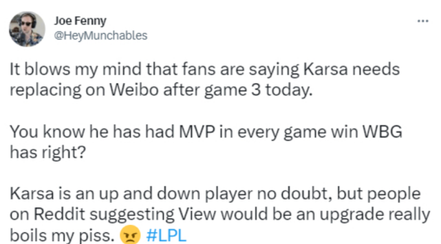 雷竞技资讯:WBG与BLG的世纪大战落下帷幕,结果让人不测,号称上亿阵容的微博战队吃了败仗。但在比赛竣过后,一件事引起了外洋貌众的热议。 LPL讲授Munch发出推特,他表现三场比赛过后,粉丝们在微博上说WBG必要更换打野,让Karsa下台。 这位英文流老哥非常震动,表现卡萨一个人拿到了WBG胜场中全部的MVP,固然状态会有些升沉,但是面临论坛上更换卡萨,替补上场的声音,还是让他无法担当,有一种粉丝没看过比赛的既视感。 不外笔者观察了WBG的微博,实在叱责打野的人并不多,也没有看到Munch说的换人言论。不少网友都开始评价这位老哥是虚空索敌,毕竟他是一个外国人,对中文并不醒目,期间大概会出现误会也说不定。 而且WBG赛后也公开了卡萨抱病的照片,他是发高烧对峙打比赛,了局后立马举行治疗。哪怕身材不适,还能用Wei拿下MVP,足以证明卡萨的力气。无论是好汉池还是打野思绪,卡萨绝对都是LPL顶尖行列,WBG只要智商没标题,就不会换下这位大代价引进的野王。 以是盼望这位LPL英文流的老哥能淡定一些,偶然候你看到的不愿定代表本相。末了祝愿卡萨早日病愈,能以更好的状态征战赛场,显现老选手的力气给观众粉丝。 |