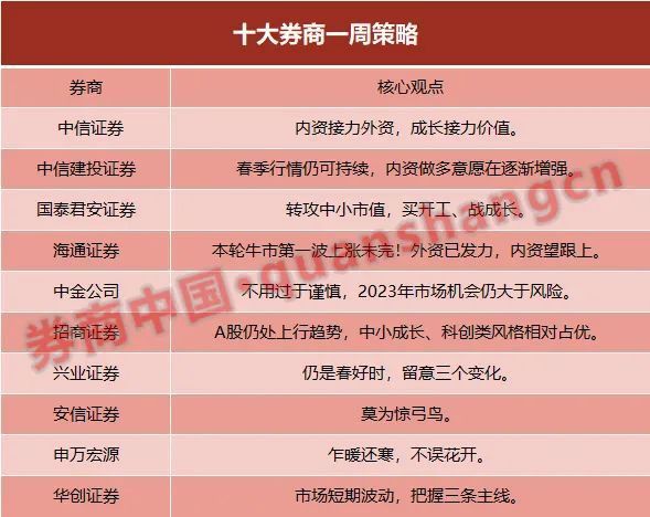 中信证券:内资接力外资,发展接力代价 2月以来内资已开始接力外资,市场风格已从1月的代价转向发展,国内机构调仓和加仓将进一步强化发展风格,外部扰动影响外资流入节奏,不改整年流入趋势,固然权重指数已往一周表现平庸,但发展指数表现亮眼,市场依然处于全面修复途中,发展洼地依然是近期主线。 起首,本年以来外资连续流入大盘代价,近期外部扰动影响流入节奏,预计快速流入的惯性减弱后,将渐渐回归常态,但整年继续增配A股的趋势稳定。其次,2月以来,内资已经开始接力外资,调仓和加仓方向会集在小盘发展,预计这个趋势仍将继续,发展风格将连续占优。末了,1月信贷有望开门红,根本面夯实全面修复底子;全面注册制落地后市场活动性保持安稳;中心政治局学习集会夸大加快步调办理“卡脖子”题目,新兴财产的政策支持力度将进一步加大。设置上,发起连续关注发展洼地,进步新兴财产中半导体和信创的设置优先级。 中信建投证券:春季行情仍可连续,内资做多意愿在渐渐增强 节后市场成交放量,风格有所转换,人民币单边升值告一段落,外资流入渐渐放缓,市场以补涨小票为主,融资盘触底回升。春季行情仍可连续,内资做多意愿在渐渐增强,也预示着后续行情有富足的增量资金。守住“超预期+强预期”方向,把握“科技+主题”,注意埋伏风险。行业关注:信创、芯片计划/MLCC、游戏、黄金、新能源车、绿电等。 国泰君安证券:转攻中小市值,买开工、战发展 市场预期出现分歧,指数行情降速,股票从全局性上涨转向布局性上涨。春节-两会政策、业绩、数据空窗期,是中小市值股票买卖业务有利的窗口期,器重开工链与发展股。 布局新开工,掘金新科技。1、开工后订单加快交付,需求弹性提升的高端制造业。看好通用主动化(纽威数控/欧科亿/ 伊之密)、新能源装备(长盛轴承/固德威/东威科技)、汽车零部件(爱柯迪/瑞鹄模具)和智能电网(威胜信息)。2、需求侧政策落地,布局传统行业开工旺季。看好斲丧建材(东方雨虹/旗滨团体)、家电家居(海信家电/志邦家居)和工业金属(驰宏锌锗,明泰铝业)。主题保举:1、数字经济与人工智能,保举:科大讯飞/格灵深瞳/立讯精密。2、粮食安全,保举:大北农/隆平高科/荃银高科。 海通证券:本轮牛市第一波上涨未完!外资已发力,内资望跟上 鉴戒上一轮牛市出发点2019/01资金节奏,外资于2018/11先辈场,而内资后续会接力,公募、杠杆资金从2019/02-03起加快入市。2022/10以来是新一轮牛市初期,类似2019年,近期外资已发力,预计2023年整年净流入3000亿以上,后续内资望跟上,公募或成为紧张增量。对比汗青,本轮牛市第一波上涨未完,行情后半段器重发展,如数字经济、券商、新能源,整年维度关注斲丧。 中金公司:不消过于审慎,2023年市场时机仍大于风险 A股市场自11月以来底部反弹已经连续3个月时间,沪深300等宽基指数的最大反弹幅度已高出20%。在此配景下我们以为当前须要器重几个维度的边际变革:1)市场关注点正在从注意政策变革边际转为注意根本面的实质修复。2)估值仍有空间,但修复速率边际变革,买卖业务层面短线也有肯定的赢利告终影响。思量经济活动的修复仍在连续,近期连续跟踪的紧张都会的拥堵指数和地铁出行人次在春节后快速反弹,工业煤耗量等高频数据回升力度也强于往年,高频数据的改善仍有望对市场形成肯定支持,市场估值虽有所修复但仍有空间,我们以为对后续市场演绎不消过于审慎,2023年市场时机仍大于风险。 设置发起:短期紧跟政策边际变革的节奏,中期偏发展。1)预期不高、政策出现边际变革受影响大的范畴,如受疫情影响的斲丧,包罗食品饮料、家电、轻工家居等;2)高景气、有政策支持、中国有竞争力的制造发展赛道,包罗科技软硬件、高端制造等;3)股价调解相对充实、中恒长远景有待清朗的范畴,如医药、互联网等。 招商证券:A股仍处上行趋势,中小发展、科创类风格相对占优 已往几个月A股完满演绎春节效应。在春节前两个多月演绎疫情缓解斲丧复苏、经济预期改善,上证50和类斲丧占优;而春节前风格开始显着转换,中小发展、中证1000相对占优,在业绩真空期、内资开始回归的环境下,主题投资、中小风格崛起。从客岁10月尾开始,按照逻辑全部板块都轮动一遍后,市场开始有新的关注点,大概带来新的时机,固然新的风险因素也开始酝酿。 总体来看,2023年中国经济将会保持复苏的态势,环球新财产趋势方兴未艾,A股仍然处在两年上行趋势过程中,整年来看仍将保持中小发展、科创类风格相对占优的局面,以高端制造、人工智能、医药生物、新能源、自主可控和军工装备为代表的发展性方向将会相对占优。 兴业证券:还是春好时,注意三个变革 从国内、外洋、资金面三个维度看,我们以为做多窗口仍在,市场还是“春好时”:1、中国经济复苏的主逻辑并未遭到动摇。随着疫情高峰已往,中国经济活力已在开释;2、美联储继续开释鸽派信号,外洋市场的风险偏好仍在修复;3、国内机构资金已在、并将继续渐渐返来。近期,市场出现了三个紧张边际变革,将进一步驱动市场从贝塔向阿尔法的主线切换:外资主导气力从买卖业务盘转向设置盘;业绩预报连续发布,市场预期渐渐进入到落地阶段;随着市场底部修复,指数股权风险溢价已从汗青高位回落。团体来看,在客岁经济数据显着回落、市场对于2022年报