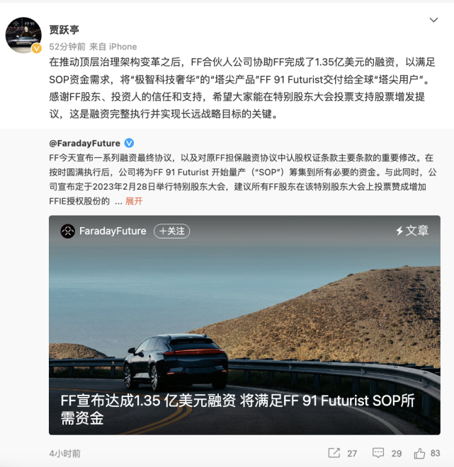 法拉第未来筹到了FF91量产的资金。 2月6日下战书,电动汽车公司法拉第未来(FaradayFuture,FF)首创人贾跃亭通过其个人微博发文称,FF合资人公司帮助FF完成了1.35亿美元的融资,以满足SOP(量产)资金需求,将FF 91 Futurist交付给环球用户。 贾跃亭写道,“感谢FF股东、投资人的信托和支持,盼望各人能在特别股东大会投票支持股票增发发起,这是融资完备实行并实现久远战略目的的关键。” 泉源:贾跃亭微博 6日中午,FF公布了一系列融资的终极协议,以及对原FF包管融资协议中认股权证条款告急条款的告急修改。在按时圆满实行后,公司将为FF 91 Futurist开始量产筹集到全部须要的资金。 FF还公布了对于1.35亿美元可转换包管票据融资终极协议的实行安排,条件是满足或宽免干系条件。此中8000万美元将在10个工作日内到账,剩余资金将在满足或宽免干系条件后的5个工作日内到账,干系条件包罗收到公司股东允许和实用股票的有效注册声明。 FF称,本轮融资加上公司在2022年12月15日举行的“FF环球投资者业务更新大会”之后收到的3340万美元,表明该公司已收到量产FF 91 Futurist所需的全部资金答应,条件是资金实时到账。 该公司表现,按预期收到全部融资后,公司预计将于本年3月尾开始量产可贩卖的FF 91 Futurist,4月初下线,并在4月尾前交付。 法拉第未来还将于2月28日召开特别股东大会,审议有关公司A类寻常股增发授权的提案。 值得留意的是,此前1月17日,FF公布与湖北黄冈市政府告竣了不具束缚力的互助框架协议,以推动公司中美双主场的战略落地。 根据框架协议,黄冈市政府将积极帮助FF在黄冈市举行产业结构,调配干系资源,同时为FF在黄冈市的创业项目提供包罗但不限于资金和政策方面的支持。FF拟将此中国总部落户黄冈市,同时保存其位于加州洛杉矶的环球总部。FF中国总部预计将由黄冈市政府引导基金、干系产业基金和FF共同出资创建。该框架协议已于2022年第三季度签订。 客岁11月,法拉第未来发布停止2022年9月30日的第三季度财务业绩,期内运营亏损为8060万美元,2021年同期的运营亏损为1.86亿美元;净亏损收窄至1.03亿美元,2021年同期的净亏损为3.04亿美元。 停止发稿,法拉第未来美股盘前涨逾33%。 |