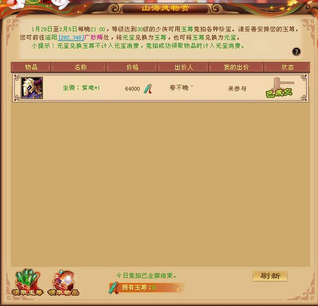 本年开年紫电大拍卖,昨晚11点30分正式竣事。 相比客岁的紫电拍卖代价,昨天紫电的代价相对来说还是比力稳固的.....高...... 小编还记得客岁紫电拍出了3.5万元的代价,震惊了一串小同伴,而本年则是见责不怪了——由于多个服务器都拍出了3万多的高价。 此中【天命】服务器和【战天门】服务器双双拍出了3.2万元的代价! 1个玉筹=20元宝,6万4玉筹=128万元宝,折合人民币3.2万元。 关键是这个代价不再是个例,据小编所知,已经有5、6个服务器都拍出了3万以上的代价,算得上是通例价了。 而风趣是拍出3.2万元顶峰代价的【天命】服务器和【战天门】服务器,都是卡级服——再次验证了卡级大佬多啊! 再说回紫电,作为一个老天龙期间代价300元的永世坐骑,如今身价怒翻百倍,敷衍了事都拍出3万天价的选手,到底拥有什么样的魅力呢? 一方面是拉风的造型——这一点毋庸置疑,固然如今悦目的永世坐骑越出越多,但是紫电作为双人坐骑,还拥有85%加快,不绝是超神大佬身份的象征。 另一方面也是情怀,老天龙期间骑得起紫电的,没有一个是平凡玩家,也是天龙男子的空想了。 |