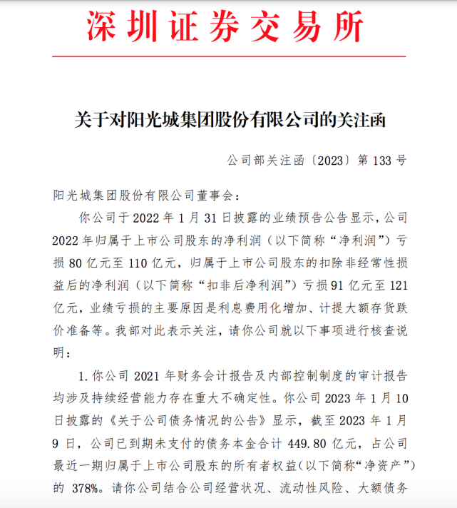 2月6日,阳光城团体股份有限公司(000671.SZ)披露了一份深圳证券交易业务所关于对阳光城的关注函。 关注函表现,阳光城于2022年1月31日披露的业绩预告公告表现,2022年归属于上市公司股东的净利润亏损80亿元至110亿元,归属于上市公司股东的扣除非常常性损益后的净利润亏损91亿元至121亿元,业绩亏损的重要缘故原由是利钱费用化增长、计提大额存货跌价预备等。厚交所对此表现关注,要求阳光城分析公司一连红利本领及一连谋划本领是否存在庞大不确定性等题目。 具体而言,关注函提到,阳光城2021年财政管帐陈诉及内部控制制度的审计陈诉均涉及一连谋划本领存在庞大不确定性。阳光城2023年1月10日披露的《关于公司债务情况的公告》表现,停止2023年1月9日,公司已到期未付出的债务本金合计449.80亿元,占公司迩来一期归属于上市公司股东的全部者权益的378%。厚交所要求阳光城团结公司谋划状态、活动性风险、大额债务逾期、一连大额亏损等情况,分析公司一连红利本领及一连谋划本领是否存在庞大不确定性,并充实提示风险。 别的,关注函表现,2023年1月10日阳光城披露的《关于累计诉讼、仲裁情况的公告》表现,公司涉诉金额约为260亿元。停止2022年三季度末,公司预计负债期末余额为2.18亿元。厚交所要求阳光城团结《企业管帐准则第13号——或有事项》关于应当将或有事项干系任务确以为预计负债的条件等干系规定,分析公司是否就干系诉讼负担了实际任务,推行该任务导致经济长处流出企业的大概性,该任务的金额怎样计量,预计负债计提是否充实、合规。 关注函还提到,阳光城2021年度、2022年前三季度分别计提资产减值丧失69.29亿元、17.39亿元,存货跌价丧失为公司2022年预计亏损的重要缘故原由之一。厚交所要求阳光城请团结公司的谋划情况、房产所处地域及贩卖情况等,分析计提大额减值预备的重要存货项目的具体情况,减值计提依据、测算过程,是否存在陈诉期会合大额计提资产减值丧失等情况。 阳光城于1月31日披露2022年度业绩预告,预计2022年归属于上市公司股东的净亏损80亿元至110亿元,上年同期亏损69.5亿元;扣非后净利润91亿元至121亿元。同时,公司基于审慎性原则计提存货跌价预备。阳光城在公告中称,2022年,房地产市场未见好转,且公司以为2023年房地产市场照旧以稳固为主,对于贩卖的量价预期持审慎态度。公司管理层根据当前情况,基于审慎性原则计提相应存货跌价预备,计提金额虽小于上年度,但依然对业绩造成肯定影响,若未来市场情况好转,存货跌价预备可根据管帐准则转回。 |