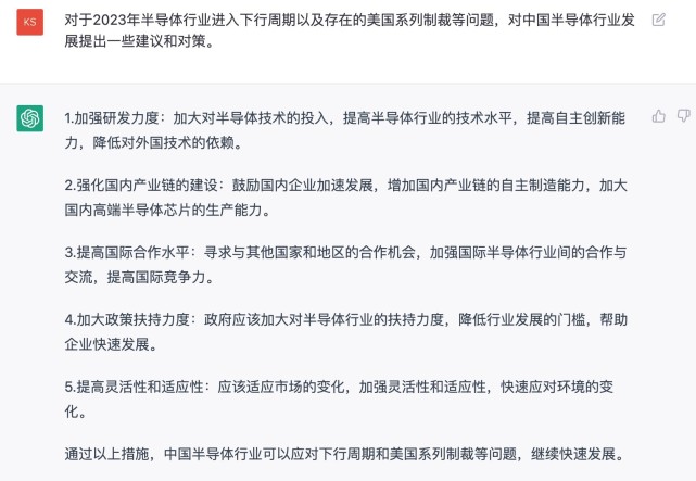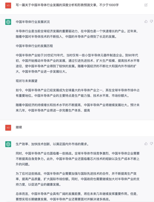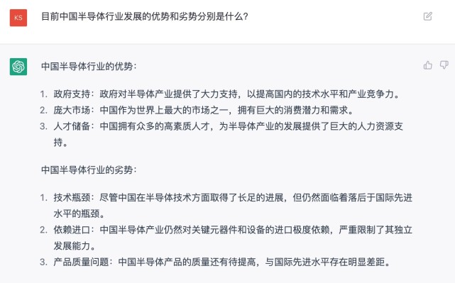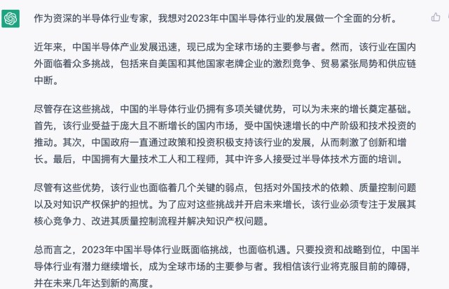 集微网报道(文/陈兴华)对于“写一篇关于中国半导体行业发展的深度分析和形势推测”文章,大概很多行业专家和机构分析等都很难“招架”,抑或给出差别角度的分析讨论及预判。由于半导体产业纷繁复杂、细分范畴及牵动因素过多,而且不停发生各类形势厘革,这一开放题目很难有同一的答案。 现在,在ChatGPT被以为正“掀起新一轮AI革命”配景下,大概有人以为可以利用这一奥妙的工具辅助撰文。究竟有数据体现,89%的美国大门生利用ChatGPT做家庭作业,53%的门生用其写论文,尚有由ChatGPT创建的63%以上论文择要被提交给学术审稿人等。 而看上去“无所不能”的ChatGPT,也开始引发部门争议。一方面,基于智能化和人性化的交互利用体验,ChatGPT赢得诸多好评,一度引爆用户刷屏交际媒体和海量下载。另一方面,由于遭受ChatGPT的强势“打击”,美国高校和学术界也开始对这一“作弊神器”发出禁令。 对于ChatGPT到底能不能写出好文章,集微网记者以“写一篇关于2023中国半导体行业深度分析和形势推测”为题举行了利用验证,以下是其作品及干系剖析。为了进步本文团体可读性,在不改变语义表述的条件下,记者对ChatGPT的个别语句及标点略有调解。 别的,记者分别从ChatGPT英文版、中文版以及外链公众号“ChatGPT在线”分别咨询干系题目发现:ChatGPT中文版以及“ChatGPT在线”存在较多显着语义题目,而英文版(已译为中文)回复质量相对较高,并在文中部门附上。 起首,记者在对话框中输入:写一篇关于中国半导体行业发展的深度分析和形势推测文章,不少于1000字。 ChatGPT复兴称:半导体行业是当前环球经济发展的紧张驱动力,在中国也是一个快速增长的产业。比年来,随着中国对半导体技能的不停投入,中国的半导体产业得到了长足的发展。 中国半导体产业始于20世纪70年代,其时仅有一些小型半导体元器件制造企业。到90年代初,中国开始推动半导体产业的发展,通过引进先辈技能、扩大生产规模、进步技能程度等途径,使中国半导体产业得到了较快的发展。随着中国经济的不停强大和国表里市场的扩大,中国半导体产业进一步发展强大。 现在,中国半导体产业已经发展成为环球最大的半导体产业之一,其在环球半导体市场中占据紧张职位。中国半导体产业的紧张特点是生产本事强、技能程度高、市场份额大。 随着中国经济的连续增长和技能程度的不停进步,中国半导体产业将继承发展强大。预计将来几年,中国半导体产业将进一步完满生产体系、进步生产服从、加速技能创新,以满意国表里市场的需求。 同时,中国半导体产业也面对着一些挑衅。环球半导体市场竞争猛烈,中国半导体企业须要不停进步自身竞争力。别的,中国半导体产业还面对着芯片技能的短缺以及生产资源不停上升的题目。 为了应对这些挑衅,中国半导体产业须要加强与国际先辈技能的互助,并不停进步生产服从,进步产物质量,扩大国际市场份额。同时,中国当局也须要继承加大对半导体产业的支持力度,以促进产业的康健发展。 总体而言,中国半导体产业具有广阔的发展远景,将在将来几年继承发挥紧张作用。但是,要想实现长期康健发展,中国半导体产业还须要面对并办理诸多挑衅。 总结:相比之前的AI对话助理和单一的搜索效果,ChatGPT在语言逻辑和体系上进步很多,互动反馈的行文架构清楚、内容通畅,包罗起首根据中国半导体产业发展的汗青、现状和将来举行了概述,然后指出了存在的一些挑衅以及相对对策,末了在末端作了总结提炼。 但是,从复兴体量及内容来看,ChatGPT的分析显然不敷全面、专业和深度,停顿在一些宏观的宽泛理论层面,同时缺乏个性光显、前瞻预判的明确观点,以及对字数要求有自己的倔强。别的,ChatGPT不时会“罢工”,须要再发送“继承”后才会接着复兴完备答案。 紧接着,对于干系挑衅和机遇,记者继承追问:现在,中国半导体行业发展的上风和劣势分别是什么? ChatGPT复兴道,起首中国半导体行业的上风涵盖: 1.当局支持:当局对半导体产业提供了大力大肆支持,以进步国内的技能程度和产业竞争力。 2.巨大市场:中国作为天下上最大的市场之一,拥有巨大的消耗潜力和需求。 3.人才储备:中国拥有浩繁的高素质人才,为半导体产业的发展提供了巨大的人力资源支持。 其次,中国半导体行业的劣势包罗: 1.技能瓶颈:只管中国在半导体技能方面取得了长足的希望,但仍然面对着掉队于国际先辈程度的瓶颈。 2.依靠入口:中国半导体产业仍然对关键元器件和装备的入口非常依靠,严峻限定了其独立发展本事。 3.产物质量题目:中国半导体产物的质量尚有待进步,与国际先辈程度存在显着差距。 总结:可以看出,ChatGPT的复兴条理清楚且部门“言之有理”,对中国半导体产业发展的优劣势继承举行了宏观概述和分析论证,包罗上风方面聚焦“当局支持”、“市场推动”和“人才储备”三大因素,而且干系劣势也是国内半导体行业发展向来存在的部门题目。 但也应留意到,ChatGPT并没有具体提及国内当局怎样支持,以及技能瓶颈具体是什么等。同时,记者发出的题目聚焦“现在”,而ChatGPT的回复如果放在十年前大概也实用。由此,如果将ChatGPT作为相识半导体产业的低级入门,以及行文框架工具大概是一个不错的选择。 随后,记者实验以更全面、具体的形貌让ChatGPT明确须要撰写的文章布局