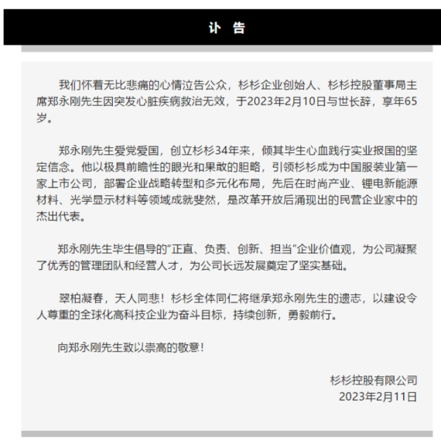 据杉杉控股有限公司“杉杉通”公众号消息,杉杉企业首创人、杉杉控股董事局主席郑永刚老师因突发心脏疾病救治无效,于2023年2月10日与世长辞,享年65岁。 郑永刚是400亿市值的杉杉股份实控人及董事长,2022年3月,胡润研究院发布《2022胡润环球富豪榜》,郑永刚以125亿人民币的身家位列第1864位。 据报道,1月12日,杉杉企业召开2023年度经济工作聚会会议。郑永刚主持聚会会议并作主题陈诉。杉杉控股、各产业平台和产业公司负责人出席聚会会议。杉杉科技、杉金光电、吉翔股份、杉杉物产和杉杉医疗等陈诉发言。 郑永刚1958年出生,祖籍浙江宁波。1989年,郑永刚建立杉杉品牌,并率先在中国服装界提出并实行品牌战略,1996年领导企业乐成上市并组建杉杉团体,1998年推进“多品牌,国际化”战略,以创新理念和厘革精力推动了中国服装行业的转型升级。 1999年,开始实行多元化发展战略。在新能源新质料范畴,郑永刚领导杉杉成为国内最大、环球前三的锂离子电池质料供应商,并在技能先辈性和规模化方面敏捷与三星、索尼等并驾齐驱。同时,在金融服务、都会综合体、商业物流、园区开辟等范畴也取得多项突破,乐成领导杉杉企业自2002年来比年荣登“中国企业500强”。 2021年-2022年,杉杉科技成为宁德期间、LG化学、比亚迪、特斯拉、戴姆勒-奔驰、宝马、通用GM等企业的重要动力级负极质料供应商,并连续保持消耗电子负极质料环球第一的市场职位。 2021年2月,杉杉股份乐成并购LG化学偏光片业务,进军LCD 偏光片市场,以创新技能本领和关键办理方案,实现偏光片本土化的逾越发展,杉杉成为环球规模最大、技能领先的偏光片生产企业。如今,杉杉偏光片市场占据率环球遥遥领先,高出25%,具备强大竞争力,与京东方、华星光电等重要面板厂商创建了长期稳固的供货关系。 从服装发迹,到转型锂电质料,再到近两年来布局偏光片,如今的杉杉股份已成为环球锂电池负极质料和偏光片“双龙头”。 财报表现,2021年杉杉股份的营收重要由锂电池质料、偏光片和其他业务三部分构成,此中偏光片业务为公司带来的营收高达99.44亿元,其在总营收中48.04%的占比以致高于锂电池质料的44.08%。(泉源:杉杉通、中国基金报、公开资料;整理:李云鹏) 编辑:方凤娇 |