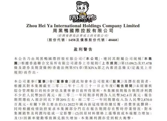 本文共2311字 阅读完约4分钟 金融投资报记者 刘敏 2月13日晚间,周黑鸭(01458.HK)发布红利告诫,预计公司2022年净利润同比下滑超九成。 金融投资报记者留意到,此前绝味食品、煌上煌两大休闲卤味巨头相继发布2022年业绩预告,二者客岁净利润均出现断崖式下滑。 那么,三大卤味巨头业绩在2022年团体失速,背后缘故起因是否雷同? 周黑鸭港股近期股价情况 据Wind 原质料涨价本钱受压 周黑鸭红利预警公告体现,公司预期2022年净利润不少于2000万元,而上年同期净利润为3.42亿元,同比下滑超94%;总收入预计同比降落约20%,上年同期总收入为28.7亿元。由此推算,周黑鸭2022年的总收入约莫为23亿元。 据周黑鸭红利预警公告 对于业绩大幅下滑缘故起因,周黑鸭在公告中表明称,一方面是2022年国内新冠疫情连续反复,消耗客流骤降;同时,根据疫情防控要求,周黑鸭部门门店在陈诉期间存在临时休业的情况,对公司贩卖及利润均造成肯定影响;另一方面,原质料代价上涨也导致周黑鸭本钱端压力增长。同时,汇率变动导致汇兑丧失增长,对公司利润造成较大打击。 金融投资报记者留意到,周黑鸭业绩自2018年就已经开始连续下滑。 Wind数据体现,2018年至2020年,公司业务收入分别为32.18亿元、31.93亿元、21.90亿元,同比增长率为-1.07%、-0.76%、-31.40%;对应归母净利润分别为4.98亿元、3.58亿元、1.32亿元,分别同比下滑32.49%、28.13%、62.98%。 2021年,周黑鸭收入与净利润均实现大幅增长,业务收入为28.70亿元,归母净利润3.42亿元,但红利水平仍掉队于2019年。 本年1月,有消息称,周黑鸭在业绩交换中披露了业绩猜测值,预计公司2023年净利润仅为1.5亿-2亿元,猜测范围远低于多位分析师发布的猜测值。周黑鸭就此发布澄清公告承认,业绩面对来自各种倒霉因素的影响,公司将积极实现2亿元或以上的2023年年度利润。 国元证券分析以为,周黑鸭在2023年面对较大的本钱压力,公司原质料本钱压力自2022年四序度已徐徐显现,该趋势或将连续至2023年,个别大单品如鸭脖、鸭掌的代价涨幅预期达30%以上。 卤味巨头业绩团体滑坡 究竟上,从近期披露的业绩预告来看,不光是周黑鸭,包罗绝味食品、煌上煌在内的三大休闲卤味食品巨头2022年业绩均出现滑坡。 绝味食品业绩预告体现,公司预计2022年实现业务收入66亿元-68亿元,同比上升0.78%-3.83%;归属于上市公司股东的净利润为2.2亿-2.6亿元,同比降落73.49%-77.57%。 对于业绩下滑缘故起因,绝味食品与周黑鸭根本划一。公司表现,2022年为相应国家新冠疫情防控的要求部门工厂及门店停息生产与业务,对公司贩卖收入及利润造成肯定影响。同时,公司在新冠疫情期间加大了对加盟商的支持力度,导致贩卖费用增长较大,以及陈诉期内原质料本钱上涨幅度较大,造成对毛利率的负面影响。 煌上煌预计2022实现归属于上市公司股东的净利润区间预计为3000万元至4000万元,同比降落约79.25%至72.33%。煌上煌则将业绩下滑归因于2022年疫情连续反复导致关店数量增长,2022年门店数量初次出现负增长,肉制品业营收同比降落16%;同时,公司米制品业务2022年端午贩卖受疫情影响,经销、团购等渠道订单量镌汰。因此,公司两大主业业务收入均同比出现降落,使得贩卖毛利额同比降落较大。 艾媒咨询《2021年中国卤制操行业研究陈诉》体现,2021年中国卤制品市场规模约3296亿元,同比增长15.0%。到了2022年,为何三大卤味食品巨头的业绩会团体失速? 据艾媒咨询CEO兼首席分析师张毅分析,卤味食品在已往的一年内里,应该说总体日子都不太好过,尤其是以线下门店为主的,这些品牌团体业绩都不太好。一个是受疫情影响,在门店里根本上没买卖做,对业绩造成非常大打击;另一个就是他们的贩卖渠道照旧以线下的加盟连锁为主,线上布局团体来说比力弱,缺乏对渠道风险把控的有效布局。 “鸭脖”提价救济业绩? 2月14日,“周黑鸭业绩大降超90%”登上微博热搜,不少网友都直言“都是由于太贵了”。 金融投资报记者通过外卖平台搜刮发现,周黑鸭成都门店贩卖的锁鲜辣脖一份为38.9元(300g),绝味鸭脖贩卖的招牌鸭脖一份21.6元(200g)。也就是说,周黑鸭的鸭脖每斤约65元,绝味鸭脖每斤约54元。 绝味及周黑鸭的网售鸭脖 究竟上,绝味食品仅在2022年就举行了两次提价。2022年初,绝味食品公布部门产物提价5%;7月,绝味食品再次提价,涉及鸭掌、鱿鱼、凤爪等产物,提价均匀幅度7%-10%。实际上,奇怪鸭脖的代价大概在15元左右。也就是说,周黑鸭64元一斤的代价充足买四斤奇怪鸭脖,难怪网友会直呼“太贵了”。 从贩卖毛利率看,2022年上半年,周黑鸭毛利率为56.85%,煌上煌毛利率为29.53%,绝味食品毛利率为28.02%,相较2021年毛利率均出现小幅降落。由此可见,在面对本钱压力,试图通过涨价自救的卤味巨头们,不光没有救济2022年业绩,反而失去了不少客户。 中国食品财产分析师朱丹蓬在继承金融投资报记者采访时表现,卤味食品的涨价,既有被动式的本钱上升影响,也有企业自动拉升利润的一个计谋。但是,无论是怎么样的缘故起因,涨价对企业来说都是一把双刃剑,它能帮企业挽回一些利润,可消耗者却不大继承,企业应在涨价前做好全方位评估。 从门店数量来看,克制2022年上半年,绝味食品在中国大陆地区门店总数为14921家(不含港澳台及外洋市场),实现净增长1207家;煌上煌肉制品加工业拥有4024家专卖店,此中直营门店289家、加盟店3735家;