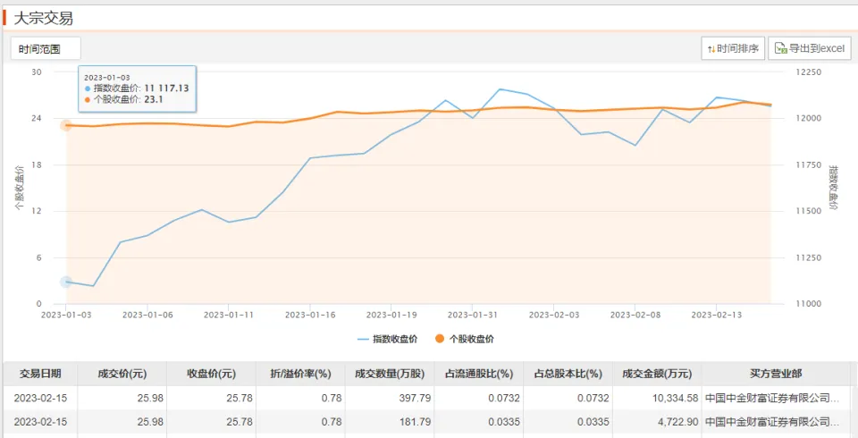 盐湖股份2月15日大宗买卖业务成交579.58万股,成交额1.51亿元,占当日总成交额的15.02%,成交价25.98元,较市场收盘价25.78元溢价0.78%。 |