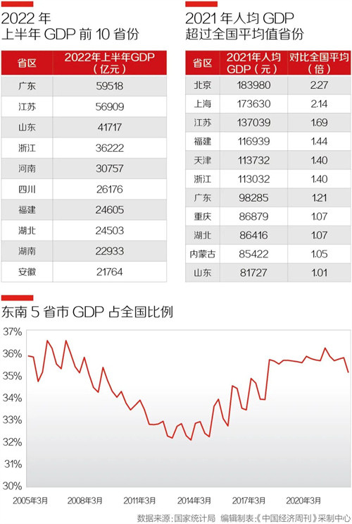 《中国经济周刊》 记者 孙庭阳 姚坤 郭霁瑶 杨琳 上海、江苏、浙江、广东和福建构成了中国东南沿海经济大省的版图。 这是中国最具活力、最强劲的经济版图。5省市经济体量占天下1/3以上,财务收入占比近4成,在地方对中央财务净上缴中贡献近8成。51%的上市公司、科创板及创业板60%的市值来自5省市。5省市的市场主体吸纳了天下70%跨省农民工就业。长三角、珠三角收支口占天下的近60%。 它们因此被称为中国的经济大省。但在国际国本相况出现超预期厘革、经济下行压力进一步加大的情况下,这些省份的经济增长也在放缓,以致上半年经济增速掉队于天下匀称值。 “经济大省要勇挑大梁,有条件的省份要力图完成经济社会发展预期目标。”7月28日召开的中央政治局集会提出明白要求。 当前正处于经济规复的关键时间点。东南5省市怎样继承挑起国家发展、稳经济的大梁,发挥保障国家财力的主力作用?怎样积极稳增长稳财路? 国务院总理李克强在一次经济形势座谈会上透露的数据,引发了互联网上又一轮对东南沿海经济大省的关注和讨论。 7月7日,李克强在福建主持召开东南沿海省份当局重要负责人座谈会,会上,福建省领导发言,上海市、江苏省、浙江省和广东省领导通过视频发言。李克强说,当前正处于经济规复的关键时间点。东南沿海5省市经济体量占天下1/3以上,财务收入占比近4成,在地方对中央财务净上缴中贡献近8成,有力支持了国家财力和中央财务对中西部地区转移付出。要继承挑起国家发展、稳经济的大梁,发挥保障国家财力的主力作用。在做好疫情防控的同时,进一步买通财产链供应链堵点,推动经济运行尽快回归正常轨道,积极稳增长稳财路。 “经济大省要勇挑大梁,有条件的省份要力图完成经济社会发展预期目标。”7月28日召开的中央政治局集会提出明白要求。 这再次引发了各人对东南沿海经济大省的热议:什么是经济大省?为何是福建、上海、江苏、浙江和广东这5个省市(以下简称“东南5省市”)?这些经济大省对中国经济毕竟有多紧张? 东南5省市经济气力有多强? GDP一连多年占天下35%以上 东南5省市占我国国土面积1/20,天下生齿1/4,合计GDP占天下35%以上,此中的广东、江苏和浙江,是国内GDP的翘楚。 本年上半年,广东省GDP达5.95万亿元,继承处于天下第一。与客岁同期相比,增长2%,增速比天下匀称低0.5个百分点。江苏省以5.69万亿元的效果,夺得第二,同比增长1.6%,增速比天下匀称低0.9个百分点。从绝对值看,这两个省在天下各省份2021年GDP排名中,处于冠亚军。而且,照旧“连任”,从2010年开始,这两个省一连11年半是天下GDP的冠亚军。 浙江本年上半年实现GDP 3.62万亿元,在天下31个省份中高居第4名。自从有完备统计数据的2005年以来,浙江不停稳稳处于第4名。本年上半年浙江GDP同比增长2.5%,和天下匀称增速持平。 和浙江、广东同属东南沿海的福建,地区面积排在天下第23名,生齿数量排名约在第15名,本年上半年创造的GDP,排在天下第7名,达2.46万亿元,相比2021年的位次,进步了1名。 和江苏、浙江相邻的上海,论生齿数量、地区面积,与一些大省相比不在一个数量级,但经济气力雄厚。上海本年上半年实现GDP 1.93万亿元,在天下31个省份中排在第13名,比2021年的排名降落了3名;本年上半年GDP增长-5.7%,增速比天下匀称低8.2个百分点,上半年遭遇新冠肺炎疫情打击是上海经济增长减速的重要缘故因由。 东南5省市GDP合计起来更可观。 本年上半年,东南5省市GDP合计达19.66万亿元,占天下35.13%。 近10年来,东南5省市GDP占比不停在32%以上。2014年,东南5省市GDP占天下比例是32.25%,那是近10年的最低值。2021年1季度时,占比高达36.2%。本年上半年占比是35.13%,从图形趋势看,有从高位开始降落的态势。 东南5省市体量大,人均数量也可观。 人均GDP是权衡一地人均经济发展水平的紧张指标。国家统计局副局长盛来运在《2021年国民经济和社会发展统计公报》中说,2021年我国人均GDP到达80976元,凌驾天下人均GDP水平。 东南5省市人均GDP全部逾越天下匀称。2021年,天下31个省份中有11个省份人均GDP凌驾天下匀称。此中,北京和上海人均GDP分别是18.4万元、17.36万元,两倍于天下匀称。江苏、福建、天津、浙江、广东的人均GDP,分别是天下人均的1.69倍、1.44倍、1.4倍、1.4倍和1.21倍。 东南5省市财务贡献有多大? 财务收入占比近4成,在地方对中央财务净上缴中贡献近8成 除了在天下GDP中占比高,比年来东南5省市税收收入占比也较高,每次统计数据一公布,“几省几市养中国”的提法就会在网络上广泛流传,引发东南沿海经济大省和当地省份网友的剧烈争论。 各省份本年上半年税收收入数据,现在尚未公布。一位业内人士告诉《中国经济周刊》记者,税收收入是各地区地方本级公共预算收入的重要泉源,一样平常能占到6成左右。根据各地的一样平常公共预算收入数据,能对当期各地的税收收入有个大概判断。 东南5省市税收合计占天下4成以上 国家统计局数据体现,上半年地方本级一样平常公共预算收入前3名省份分别是广东、浙江和江苏,分别是6730亿元、4984亿元和4639亿元。 如果看已经公布的往年龄据,广东、上海、江苏和浙江,位居天下2020年税收收入前5名。 国家税收年鉴体现,2020年,天下税收收入16.6万亿元,广东(含深圳)、上海、江苏、北京和浙江(含宁波)进入税收收入前5名省
