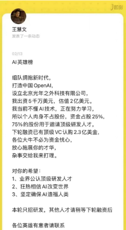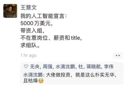 ChatGPT的风越刮越剧烈,让退休两年的美团连合首创人王慧文,动了复出的动机。 其发文称,要打造中国Open AI ,出资5000万美元。 没多久,王慧文的满腔热血,被券商首席分析师泼了一盆冷水,以为其啥都不懂,只会营销。 王慧文再创业3亿搞AI 2月10日,一张美团连合首创人王慧文的朋侪圈截图流传网络,称要组队入局人工智能。 他表现:“我的人工智能宣言:5000万美元,带资入组,不在意岗位、薪资和title,求组队。” 品评区下方,引来数人点赞。此中,水滴公司首创人兼CEO沈鹏还品评称:“大佬做投资,就是这么质朴无华,且枯燥”。 一时之间,截图火了,网友也是纷纷观望其动作。很快,王慧文发文招兵买马。 2月13日,王慧文更新一则“AI豪杰榜”,喊话“组队拥抱新期间,打造中国Open AI”。 其还称,“设立北京光年之外科技有限公司,我出资5万万美元,估值2亿美元”,而且“个人资金占股25%,75%的股份用于约请顶级研发人才,下轮融资已有顶级VC认购2.3亿美金”,诚意满满。 别的,王慧文还扬言“不必为资金忧心,放心发挥你的才气,杂事交给我打理。” 这一次他告急是为其新公司招研发职员——渴望是业界公认的顶级研发人才,狂热地信任AI改变天下,刚强确保AI造福人类。 天眼查表现,王慧文早已在2018年7月,注册了北京光年之外科技有限公司,注册资源为100万元,由其100%持股。公司是一家以从事科技推广和应用服务业为主的企业,策划范围包罗贩卖自行开辟的产物,盘算机体系服务等。 泉源:天眼查APP 就在王慧文喊话当日,该公司还披露了一笔2.3亿美元的融资。 泉源:天眼查APP 券商首席分析师在线diss 对于互联网大佬的精致愿景,有券商首席分析师则公开diss。 2月13日,海通证券科技行业首席分析师郑宏达转发“豪杰榜”,评价王慧文此举是“纯扯淡”。 其指出,“5000万美元够干什么的?大模子练习一次就花500万美元,练习10次?互联网的人啥都不懂,就只会营销,一点都不踏实。” 公开资料表现,郑宏达是海通证券研究所科技产业链负责人,研究盘算机近20年,管理整个科技研究团队,对人工智能、半导体、云盘算等范畴有较为深入的研究。 行业分析师公开品评自己所覆盖的上市公司是比力稀有的征象。 不外据公开信息表现,海通证券研究所内部负责美团公司研究的分析师来自批发零售团队,而非科技行业干系团队。 财报数据表现,海通证券创建于1988年,是国内龙头券商。客岁上半年,其营收121.04亿元,同比降落了48.43%,险些腰斩,行业排名从一连多年稳居第二,跌落至第九名。 对于郑宏达的点评,王慧文尚未有回应。而王慧文此次公布进武士工智能,让其身影重新回到了各人的视野中。 美团的二号人物,与王兴是上下铺兄弟 王慧文,1978年出生在东北农村,是清华大学电子工程学士。大学时,与美团首创人王兴是同个宿舍的上下铺兄弟。 图中左三是王兴,右二是王慧文 2001年结业,王兴去了美国读书,王慧文进了中科院声学所读研。 2003年,在王兴的鼓动下,王慧文从中科院退学,开始创业。 荣幸的是,初次创业效果不菲。由他们创办的校内网,不光得到过亚马逊前首席科学家韦斯岸的天使投资,还被千橡互动团体以5000万收购。今后,两人走向了差异创业方向。 直到2010年12月,王慧文参加美团,再一次与王兴站在了同一战线。 彼时,初创的美团还在“千团大战”中厮杀。厥后,美团在一众平台中脱颖而出,那枪林弹雨的十年岁月,王慧文赴汤蹈火,功不可没——开创美团外卖、攻下当地生存、抢滩网约车。在美团猛烈发展的日子里,王慧文堪称王兴的左臂右膀,在每一个关键业务中打头阵,一起陪同美团崛起成为本日的巨无霸。 之于王兴,王慧文是陪同其最长时间的创业搭档和人生好友。在人生最青涩时期,二人一起凑钱买电脑,一起退学又一起创业,险些形影相随,俩人结下了深厚的交情。由于年长王兴数月,王慧文成为“老王”,王兴则是“兴哥”。 图中左起:穆荣均、王兴、王慧文 在美团战斗了整整十年,眼见中国移动互联网的浮浮沉沉,王慧文心生退意。2020年12月18日,美团发布内部信公布,美团连合首创人、高级副总裁王慧文已经顺遂完成交棒,按操持正式退出。 这一年,王慧文才42岁,他也曾提及辞职缘由:“不绝以来我都不能很好的处置惩罚工作与家庭、康健的关系;也处置惩罚不好业务策划所必要的专注精进与个人散乱不稳固的爱好之间的关系;不热爱管理却又不得不做管理的痛楚也与日俱增;我也不绝担心人生被惯性主导,怠于认识的情况而错过了差异的出色。” 结语 回看已往走来的路,王慧文曾说:“我是农民的儿子,我的出身给我留下的印记是,我得认认真真地干活。”而这一次,他已经有了新的方向。 固然正如其所述,我当前不懂 AI 技能,正在积极学,但这也没有拦阻其拥抱 AI 的热情。 随着ChatGPT的火爆,不光有谷歌、百度、京东等海表里巨头切身了局,不少国内初创公司也纷纷公布了自身的干系希望,对于将来类ChatGPT ,乃至超 ChatGPT 技能在国内百家齐放百家争鸣,我们拭目以待。 编辑丨简小编 综合自丨投资界、金融格子等 |