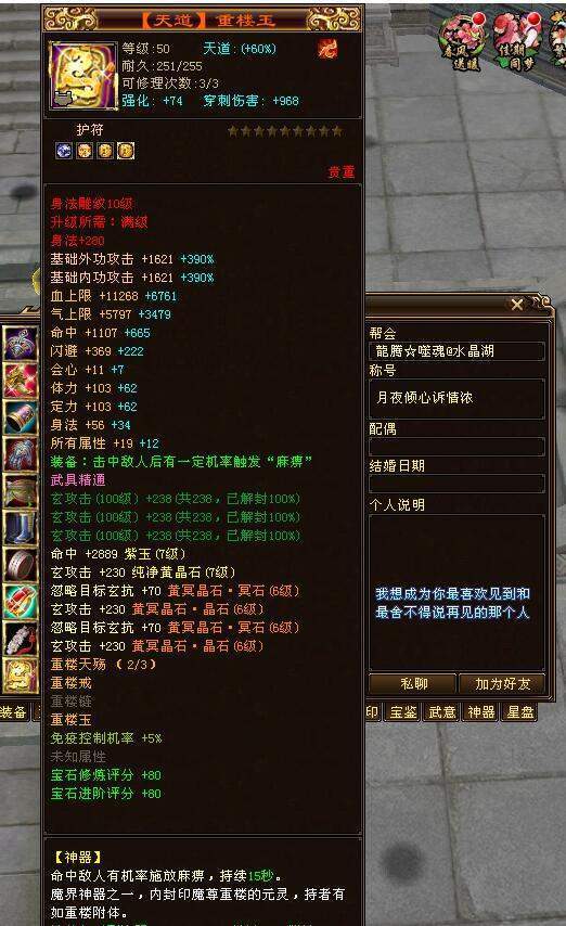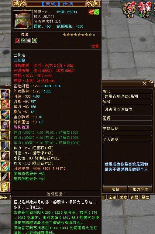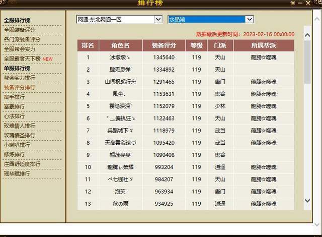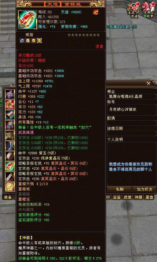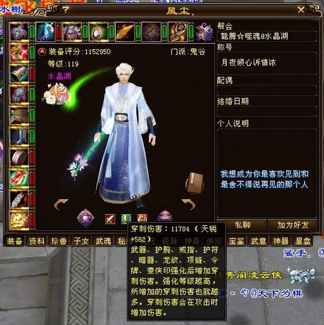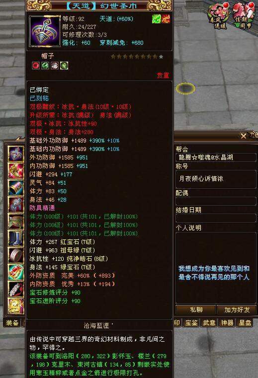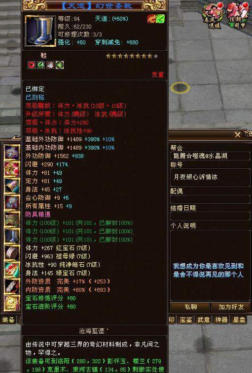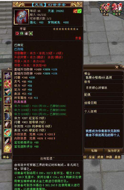 提及水晶湖服务器,信赖天龙老玩家们都是如雷贯耳。 这个服务器自开服之始,就涌现过多位超神级大佬,先是有天山超神蝎尾针,时至天龙3期间,年轻的超神沧海蓝烟在水晶湖服务器谱写了专属本身的传奇。 固然这位超神大佬如今也已退隐江湖,但是水晶湖服务器中随处留下了这位大佬的影子。 这不,小编在汴京校场看到了一位115万评分的二进阶鬼谷,在检察他的装备时,发现他身上的装备都刻着沧海蓝烟的名字,如无不测,这原来是属于超神沧海蓝烟的号。 大概看一下装备,强化70+,雕纹满级,宝石是满7,新石头6.6。 身上还带了两个不绑定重楼,一个是重楼戒指,另有一个是重楼玉。 而身上的装备,根本都是沧海蓝烟时所做,这也是这位大佬如今留在水晶湖的最深的印记。 防具都是全属性的,还都是自制,真的是让人赞叹。 另有八星帽子,闪避、灵气、体力和身法。 武意全部都洗成玄攻击。团体细节都好坏常不错的。 然而排行榜却已是物是人非。 |
