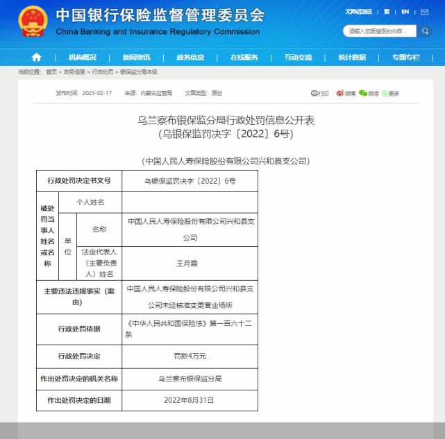 北京商报讯(记者 陈婷婷 胡永新)2月17日,内蒙古银保监局乌兰察布银保监分局发布行政处罚信息表现,中国人民人寿保险股份有限公司兴和县支公司未经答应变动业务场所,被罚款4万元。 图片泉源:内蒙古银保监局 |